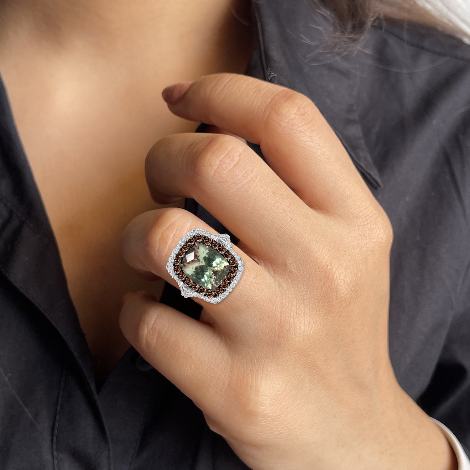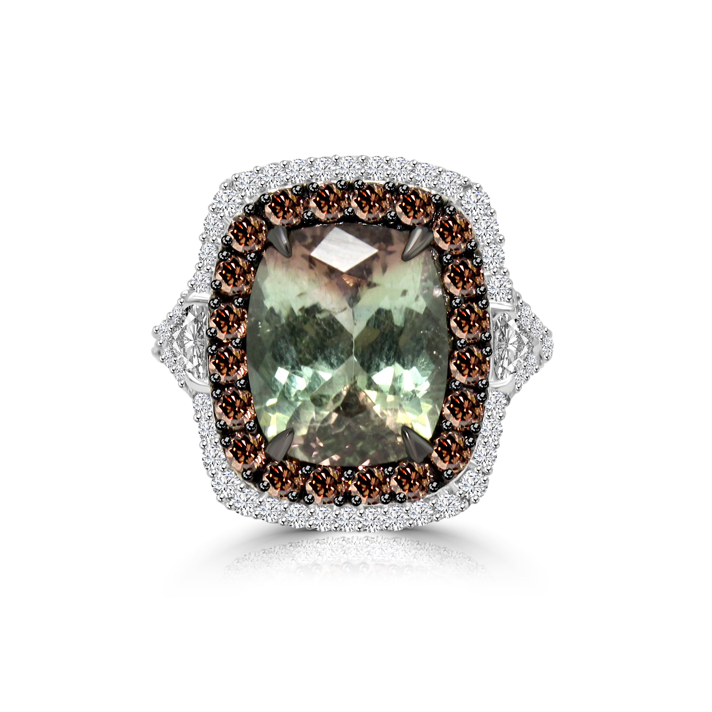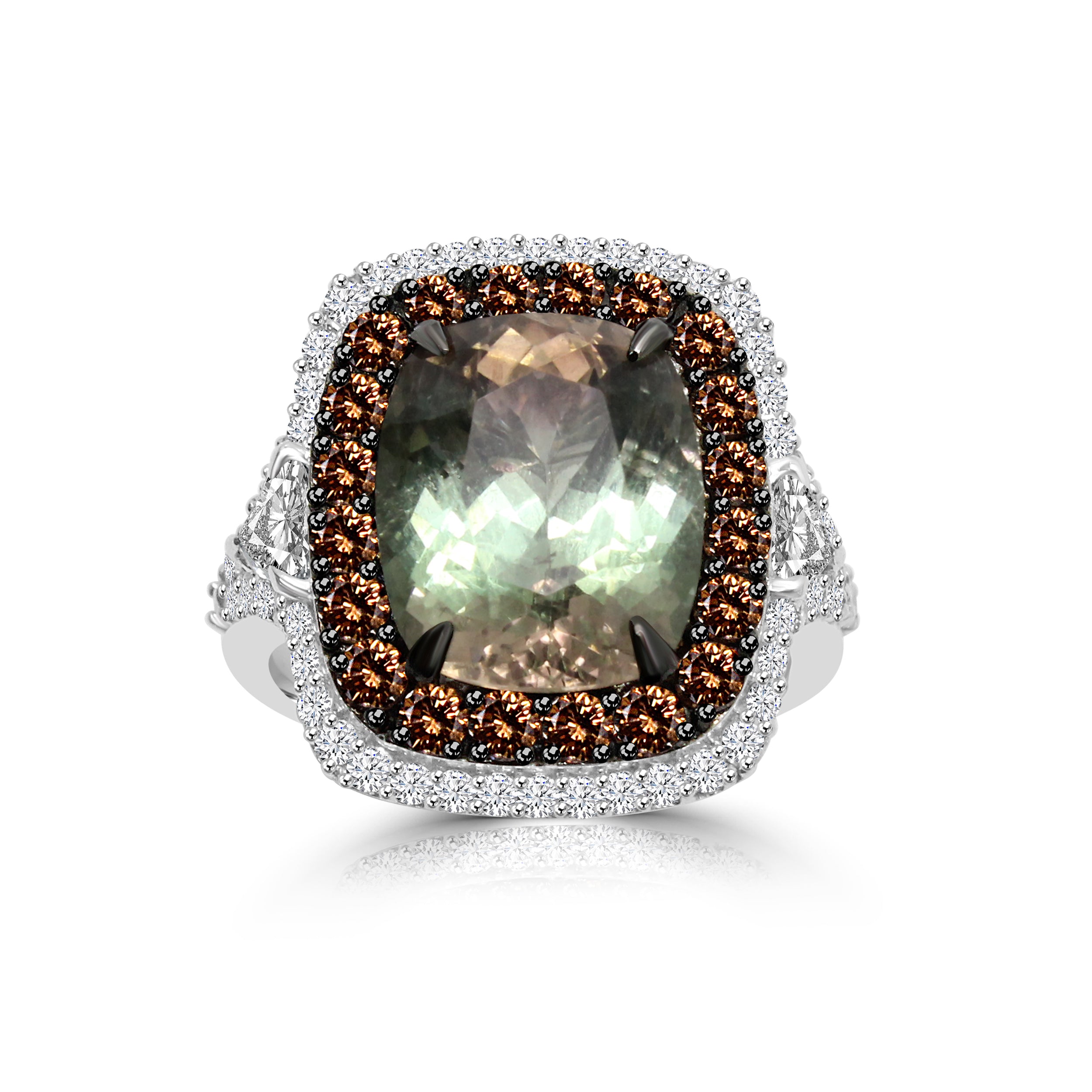 This exquisite A GEO ring will make a stunning statement. It features a tourmaline centerpiece with champagne diamond, brilliant and trillion diamonds set in 18K white gold. Perfect for any special occasion, this ring is sure to be treasured for years to come.