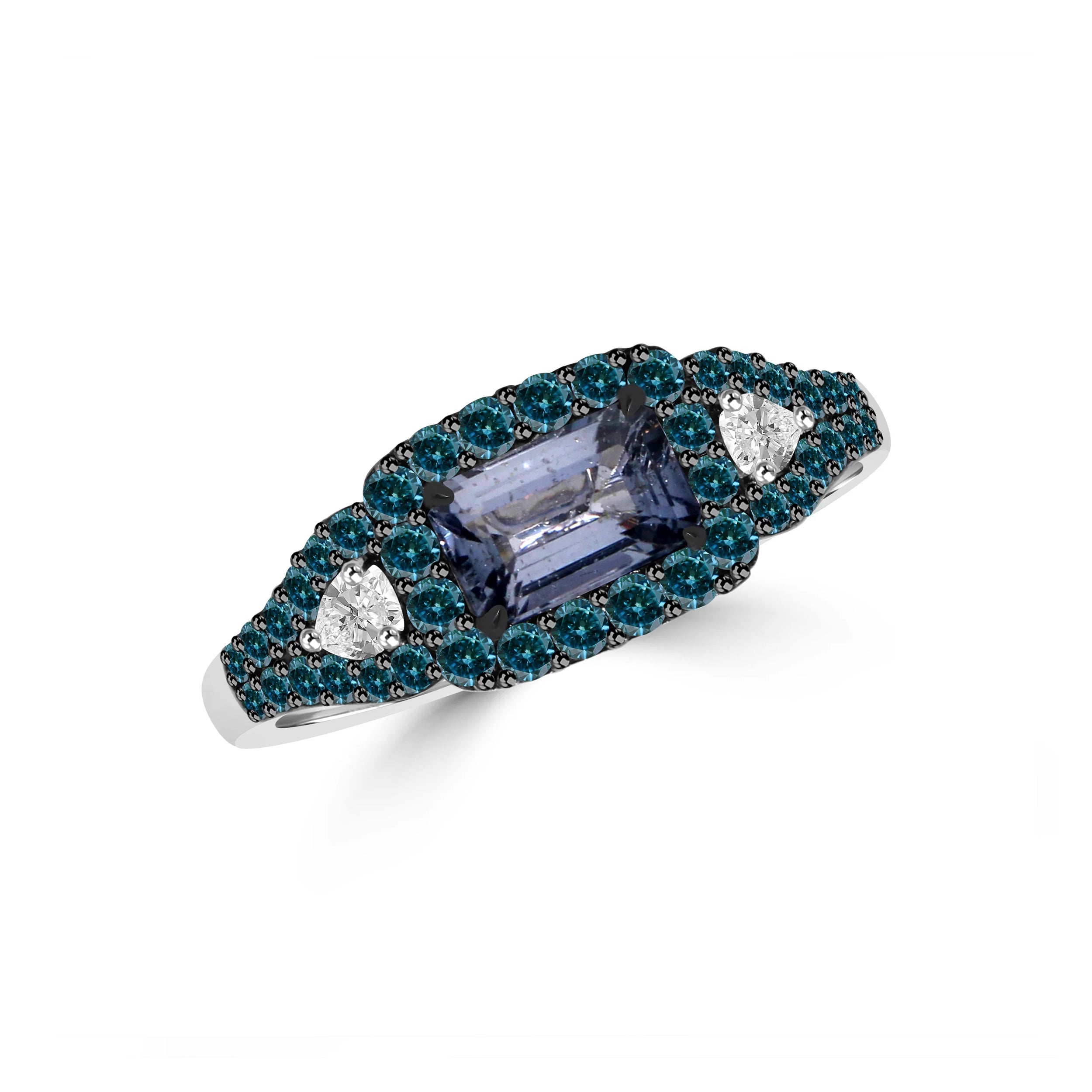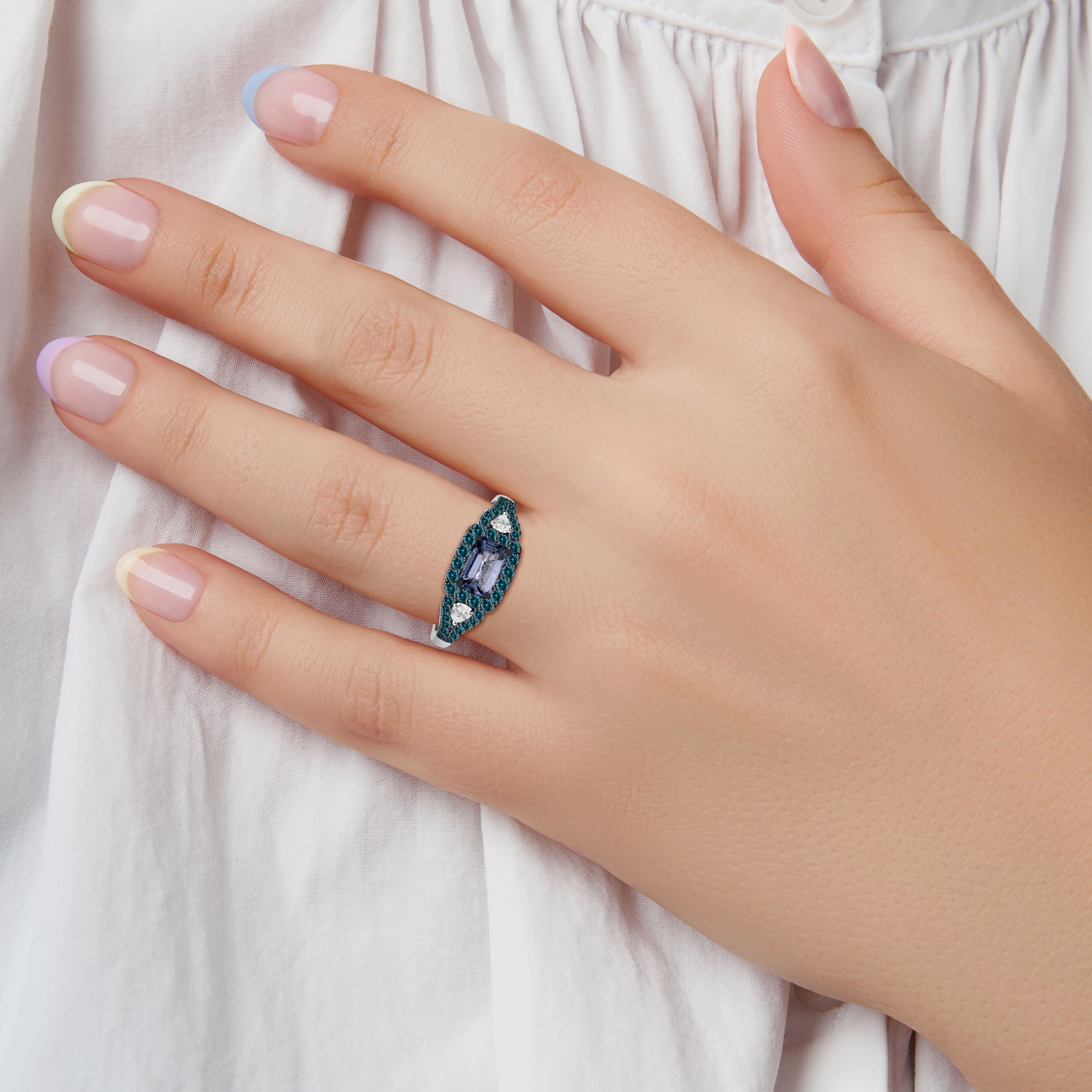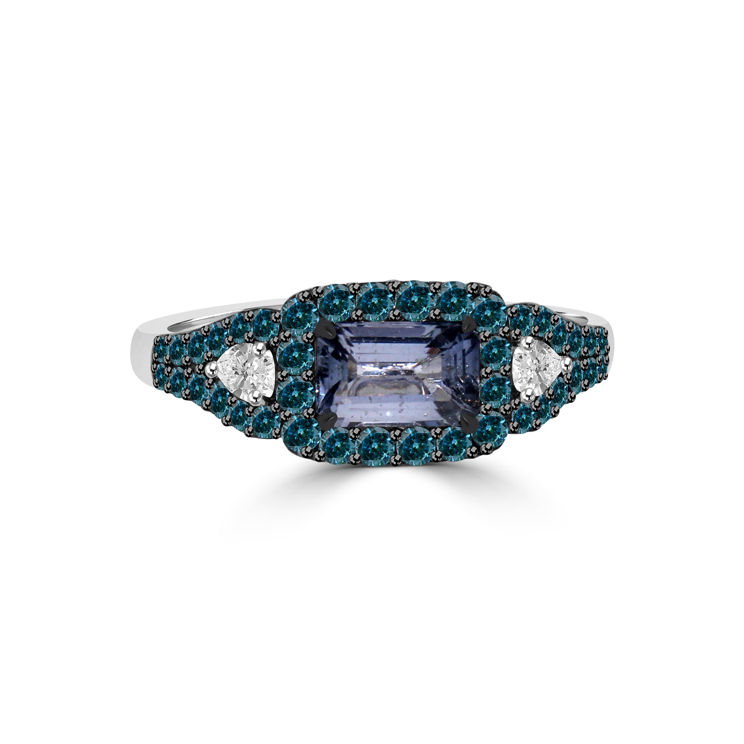 The GLINT ring is a masterpiece of elegance, showcasing a captivating sapphire that exudes timeless allure. Paired with fancy-cut diamonds with accents of blue diamonds, this design celebrates the perfect harmony of color and light. Set in lustrous 18K white gold, the GLINT ring radiates sophistication, making it an exquisite addition to any jewelry collection.