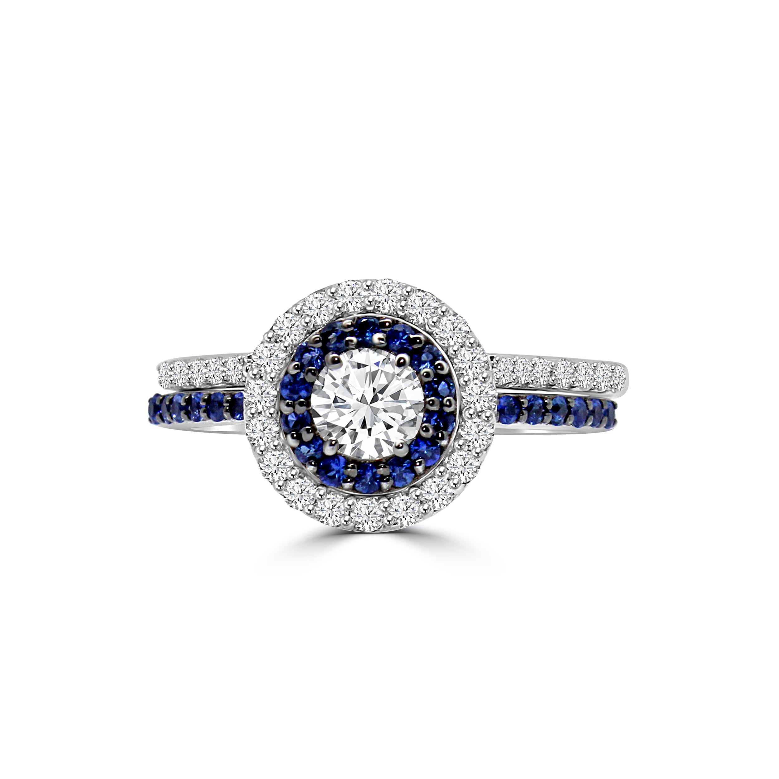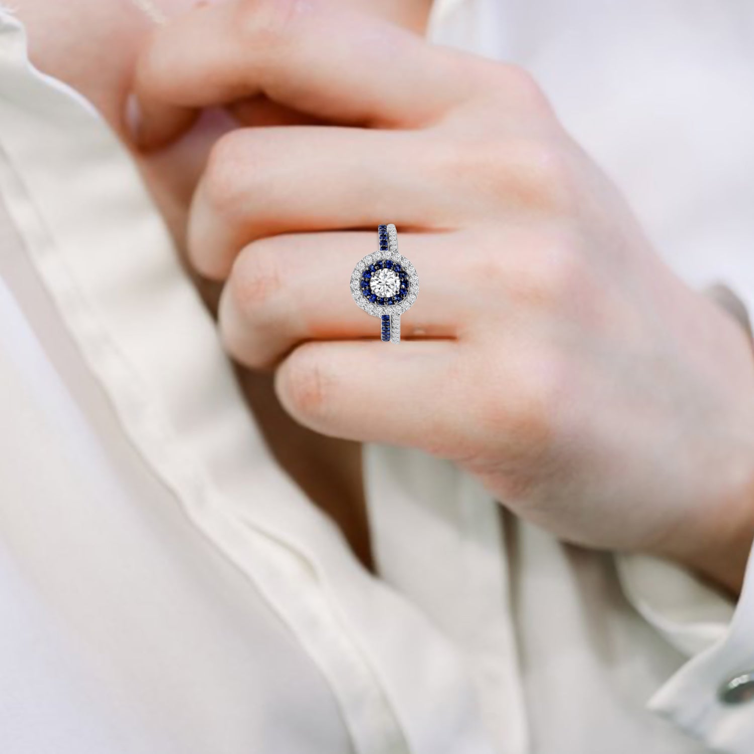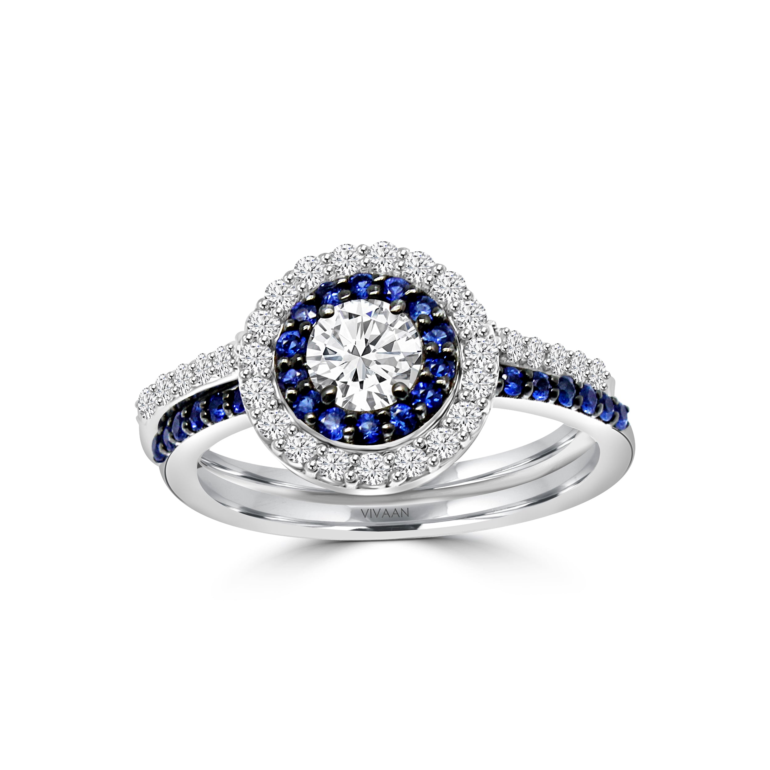 Brilliant diamond center ring surrounded by blue sapphire paired with another ring of brilliant diamonds perfectly fitting in one another to become a single ring. It can be worn separately or as a set.