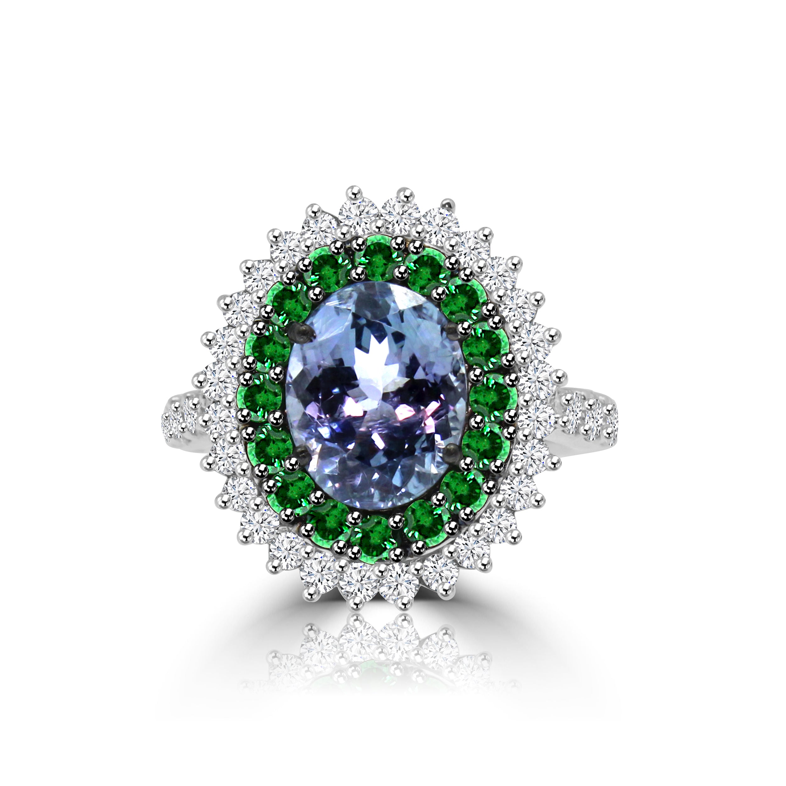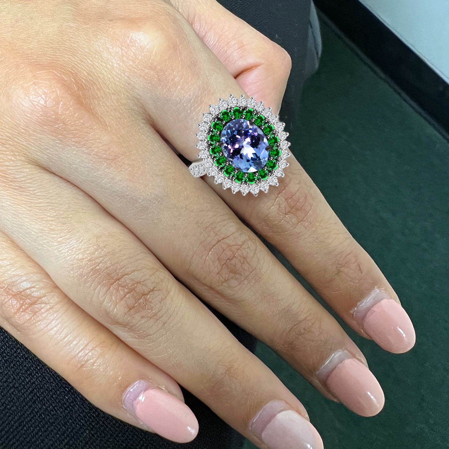 Ring featuring subtle tanzanite surrounded with tsavorite and diamonds set in 18k white gold.