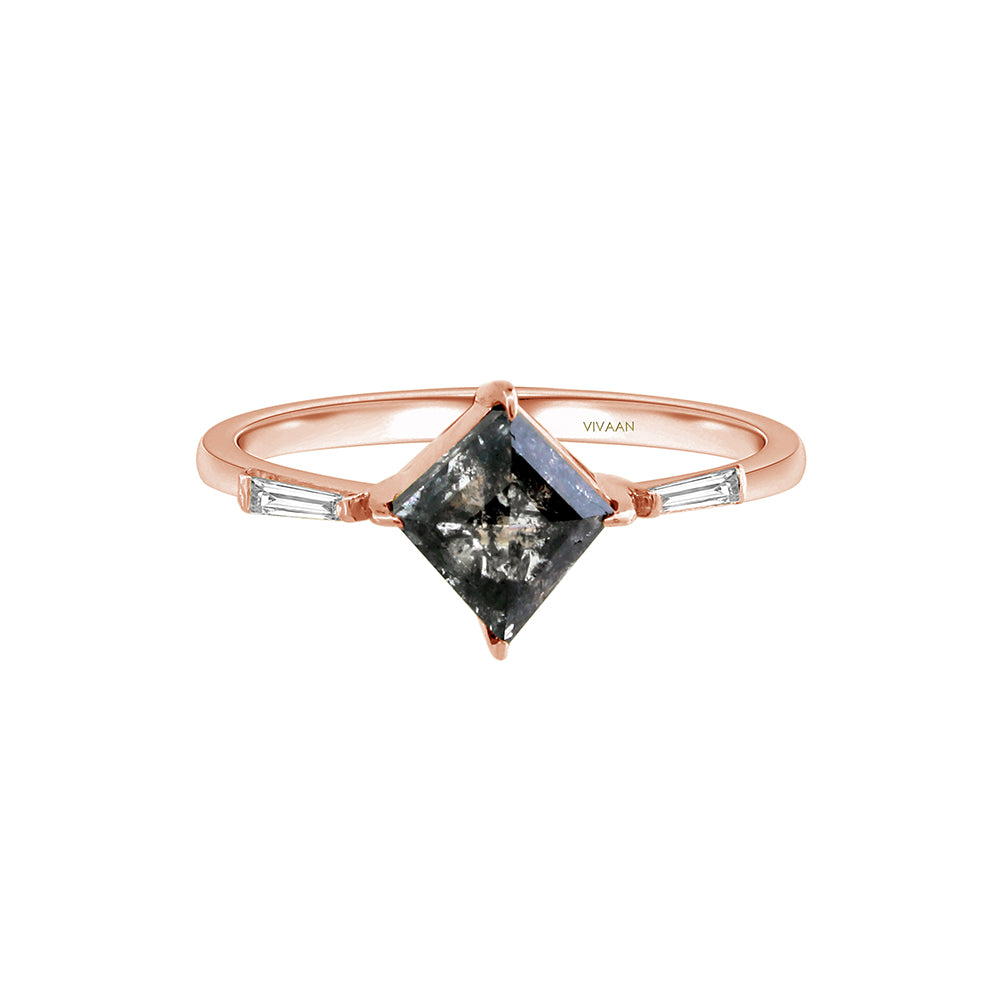 This exquisite ring features a stunning kite-shaped salt and pepper diamond set in the center of a gorgeously crafted 18k rose gold band. The kite-shaped diamond is a beautiful gemstone with unique characteristics, boasting a beautiful blend of speckled black and white patterns that make each stone truly one-of-a-kind. This beautiful centerpiece is further enhanced by the addition of perfectly tapered diamond baguettes on either side, adding a bold sparkle that truly makes this ring stand out. The rich, warm hues of the rose gold accentuate the beauty of the diamonds, drawing attention to their shimmering brilliance. This gorgeous ring exudes a unique and sophisticated character that is perfect for any modern woman who wants to make a statement with her jewelry. Made with the finest materials and meticulous attention to detail, this ring is sure to capture the heart and imagination of anyone who sees it.