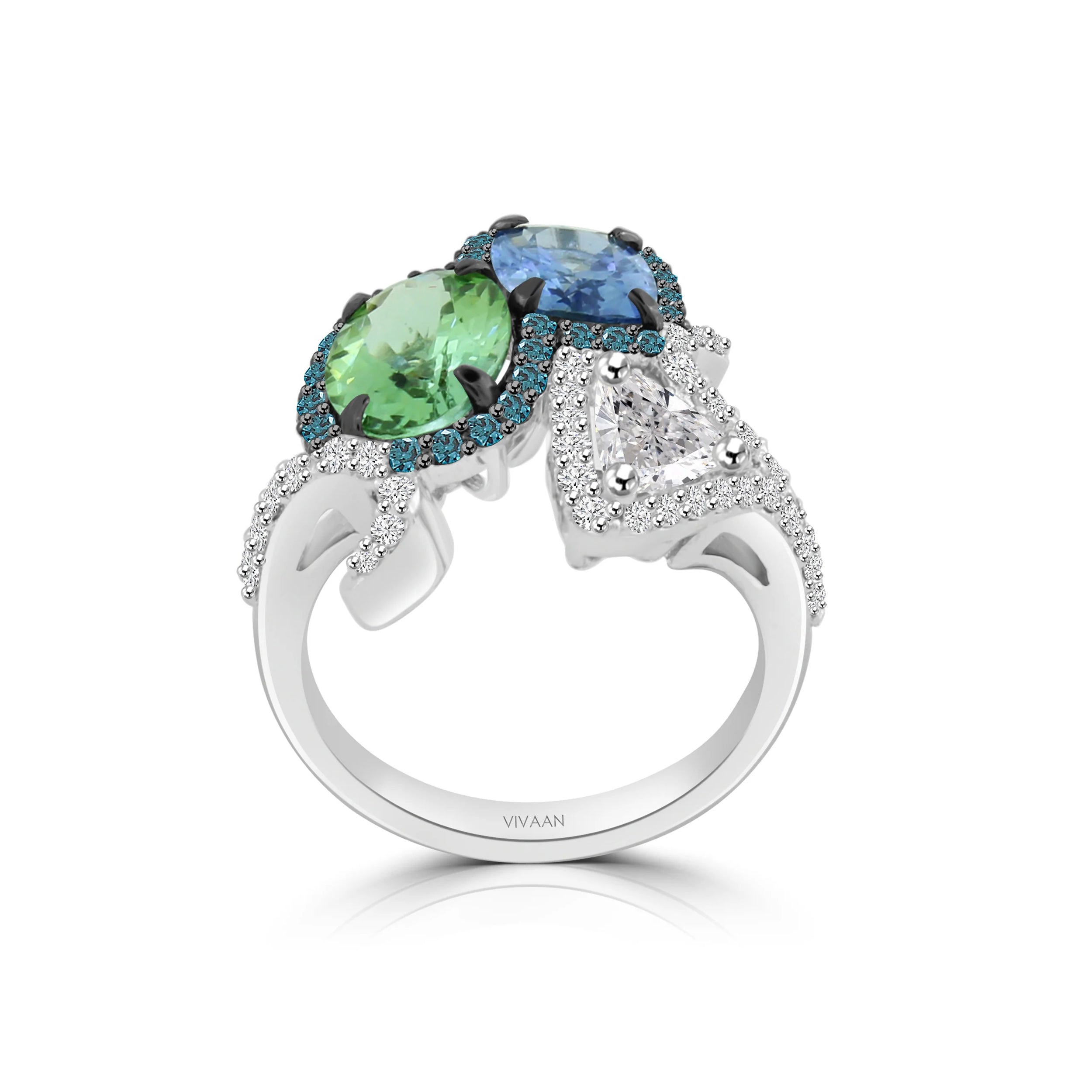The ever charming combination of blue green with blue sapphire and green tourmaline clubbed together with trillion cut diamond forming a pattern on a ring and accented with blue and brilliant diamonds.