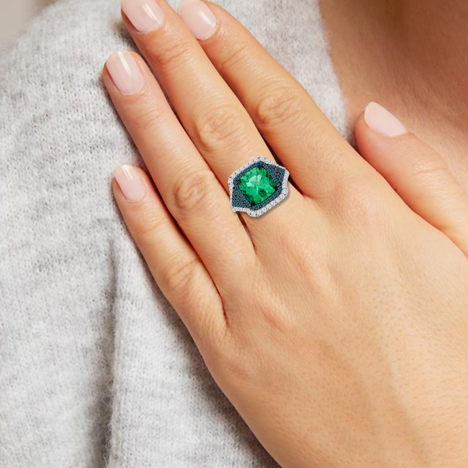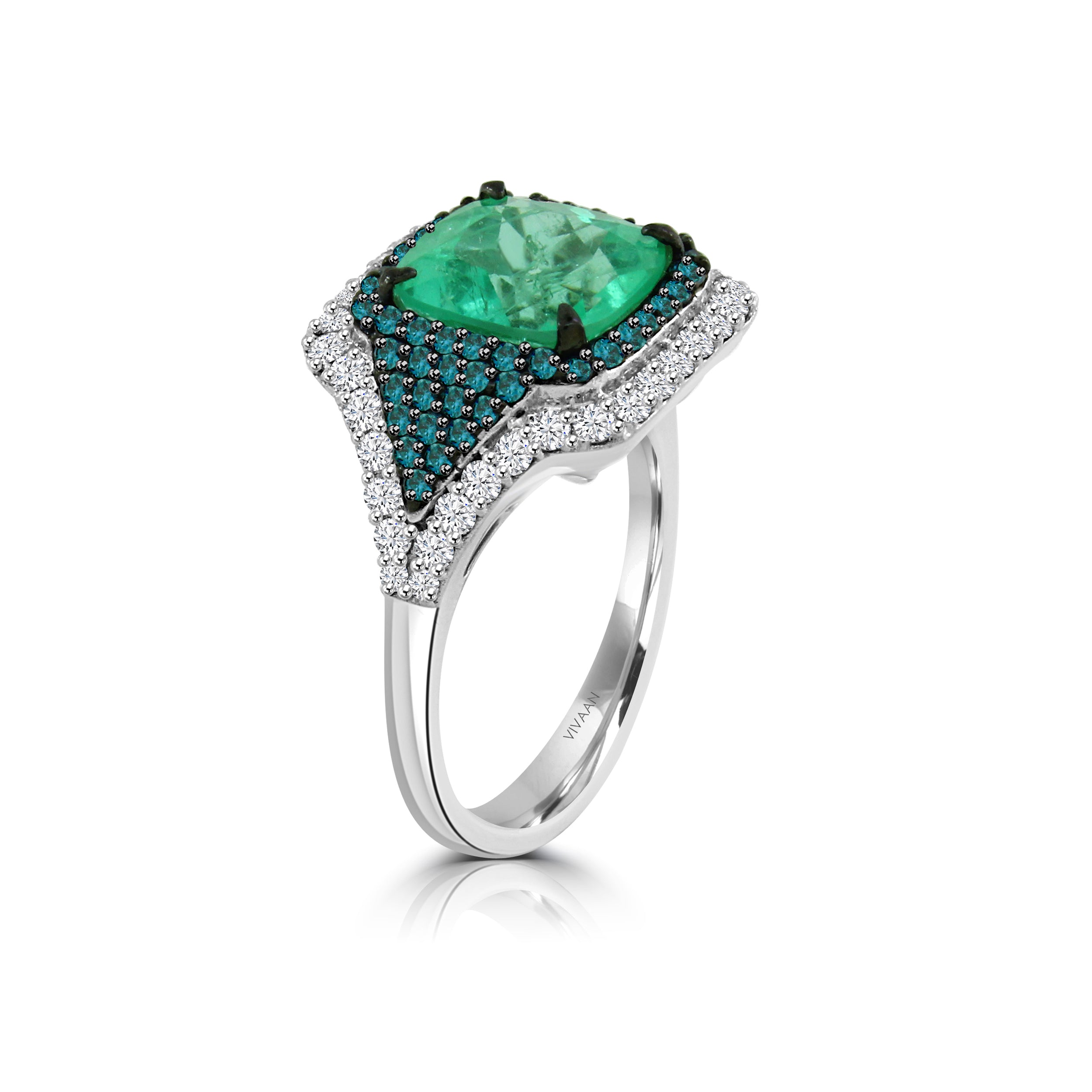 This BICE ring is the sparkle of your dreams - with an emerald at the center and a blue diamond and a brilliant diamond on each side, all nestled in 18k white gold. Shine the night away!