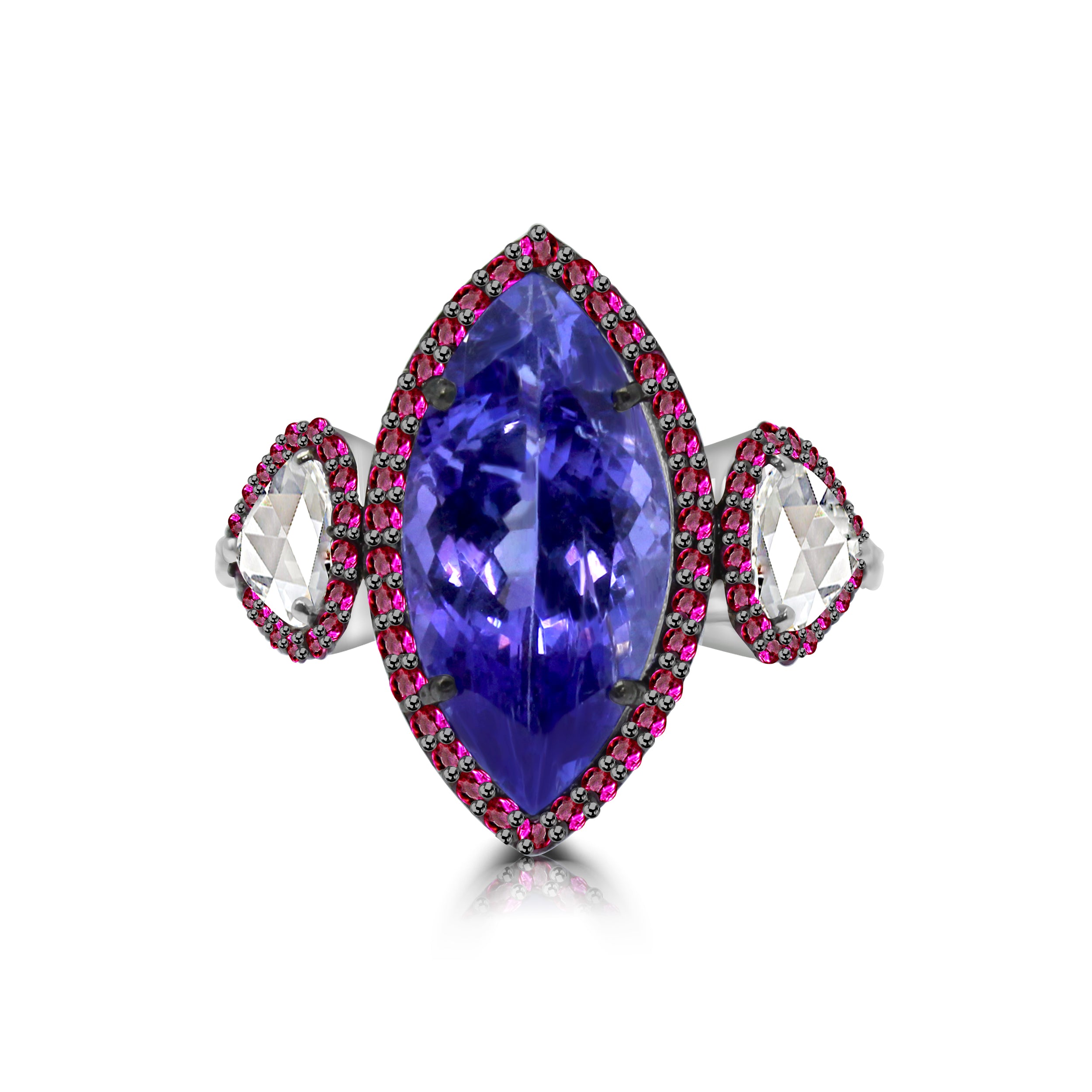 Explore the beauty of nature with Blooming Dale's unique combination of Tanzanite, Ruby and Diamonds set in 18k White Gold. Let your true style be seen with this daring and bold design!