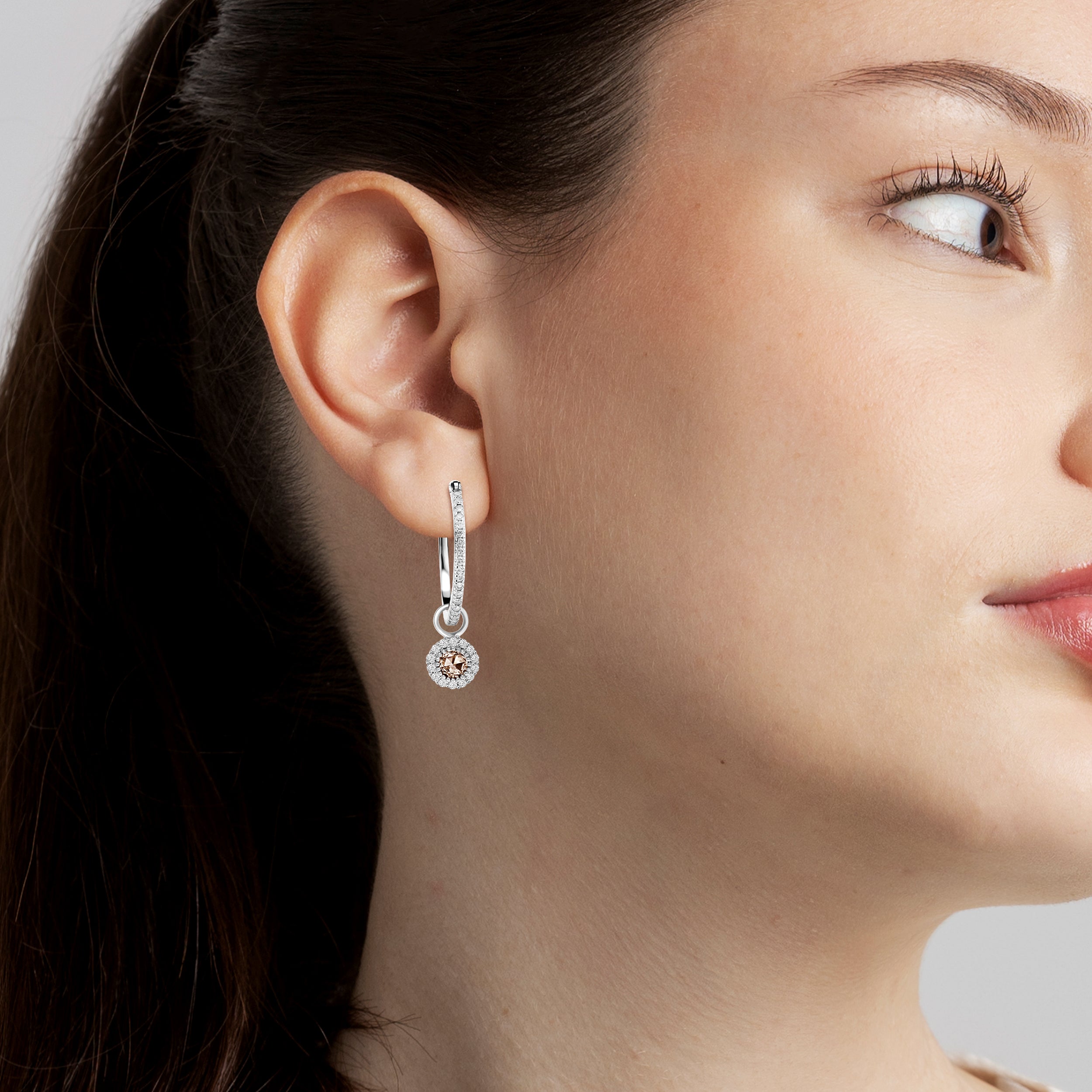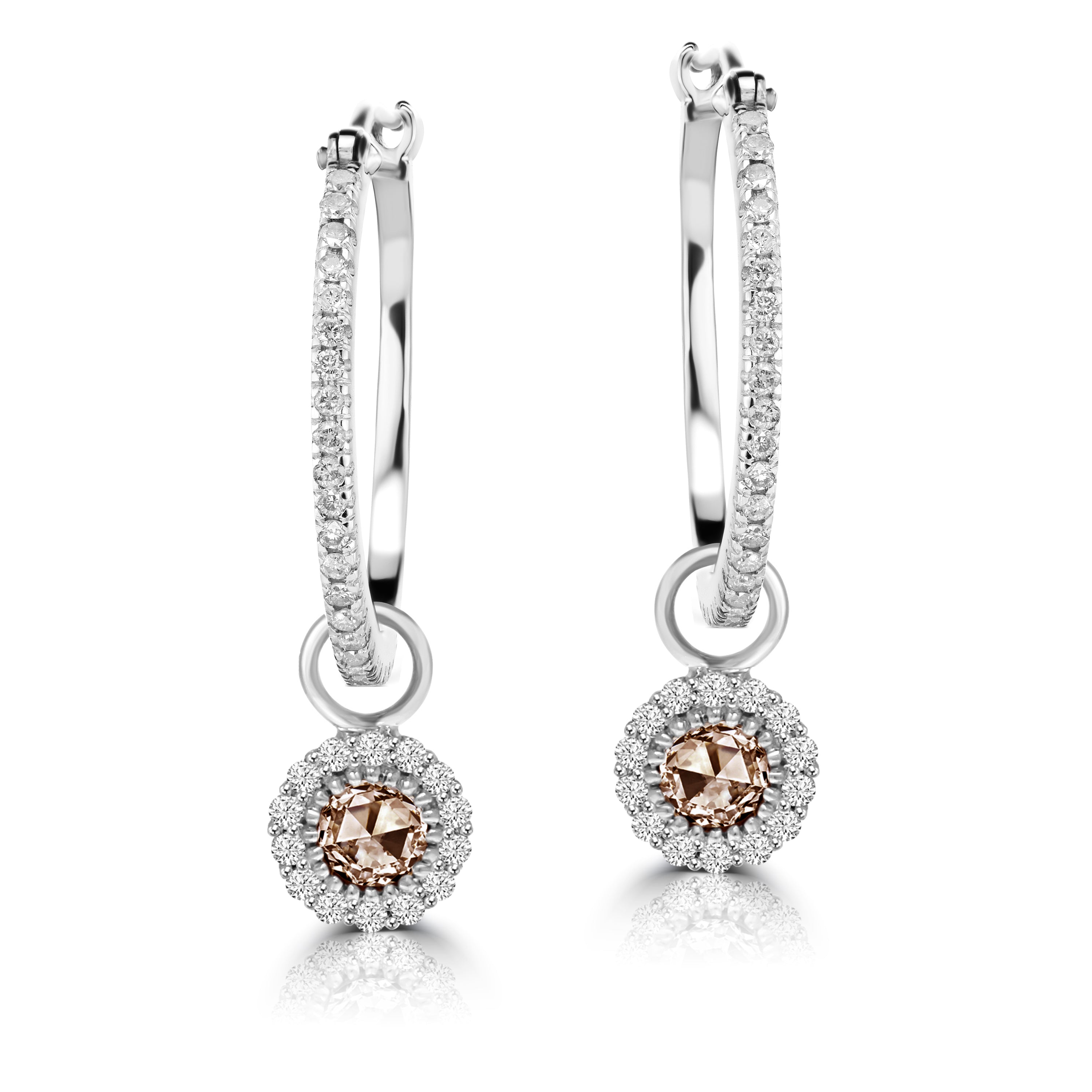 These exotic hoop earrings showcase a stunning arrangement of champagne and white diamonds, all set in gleaming white gold. The slender hoops feature a row of glimmering white diamonds, enhancing their elegant design. A beautiful pair of charms hangs from each hoop, featuring a sparkling champagne rose cut diamond surrounded by a halo of smaller white diamonds for a stunning contrast. With their elaborate design and enduring charm, these earrings are ideal for any event—be it to lend everyday attire a hint of glitz or to complete a nighttime outfit. These earrings are genuinely enchanting, combining sophistication and sparkle in a luxurious way.