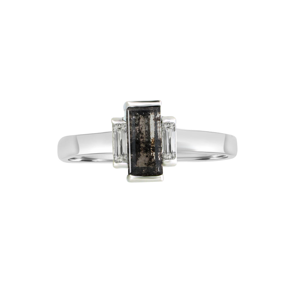 Simple yet elegant Salt & Pepper baguette diamond perfectly paired with diamond baguettes on sides, set on 18k white gold ring.