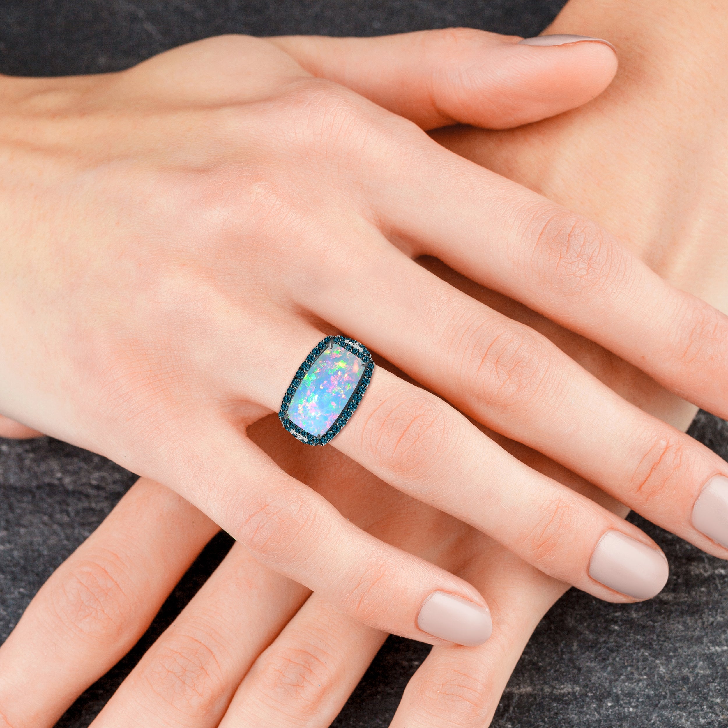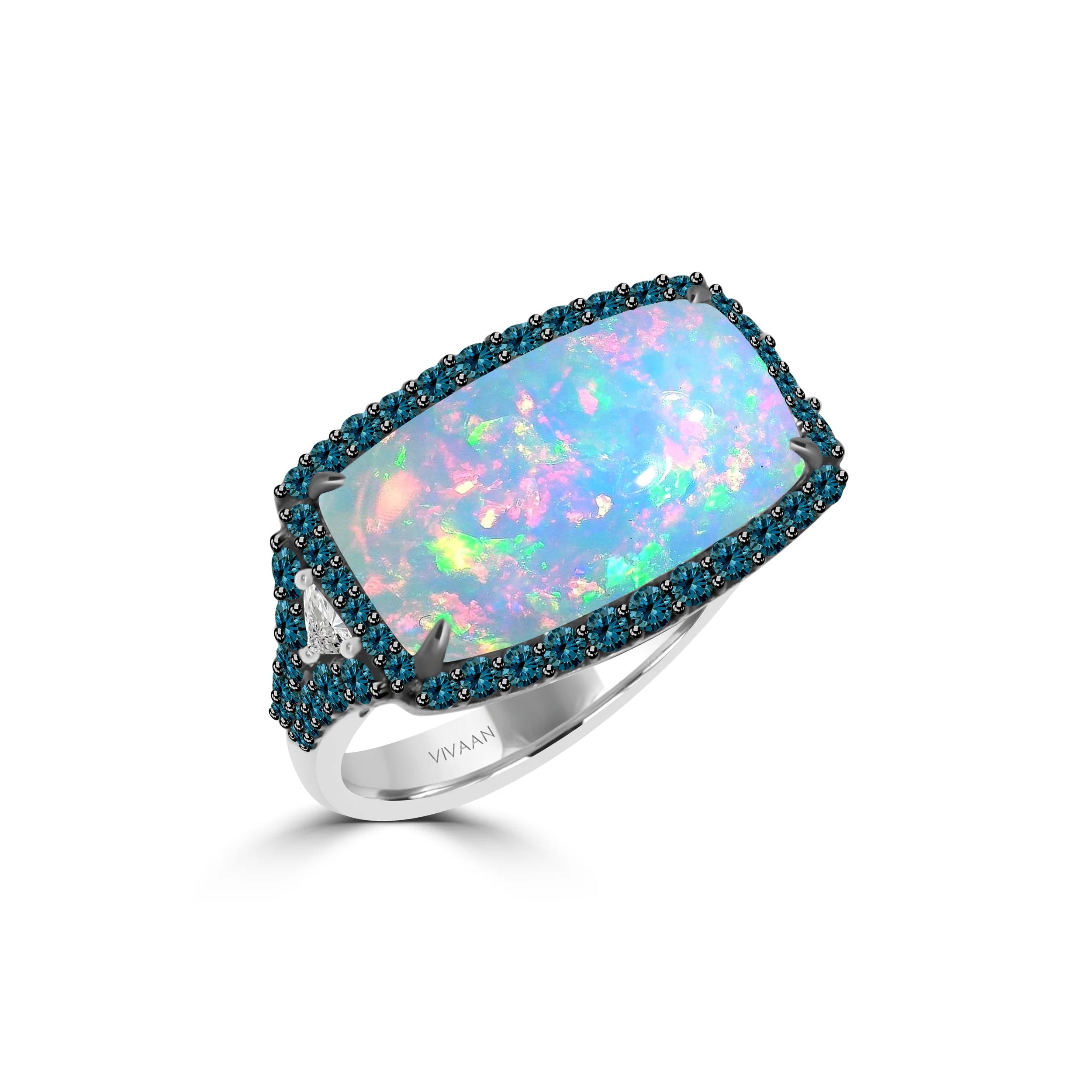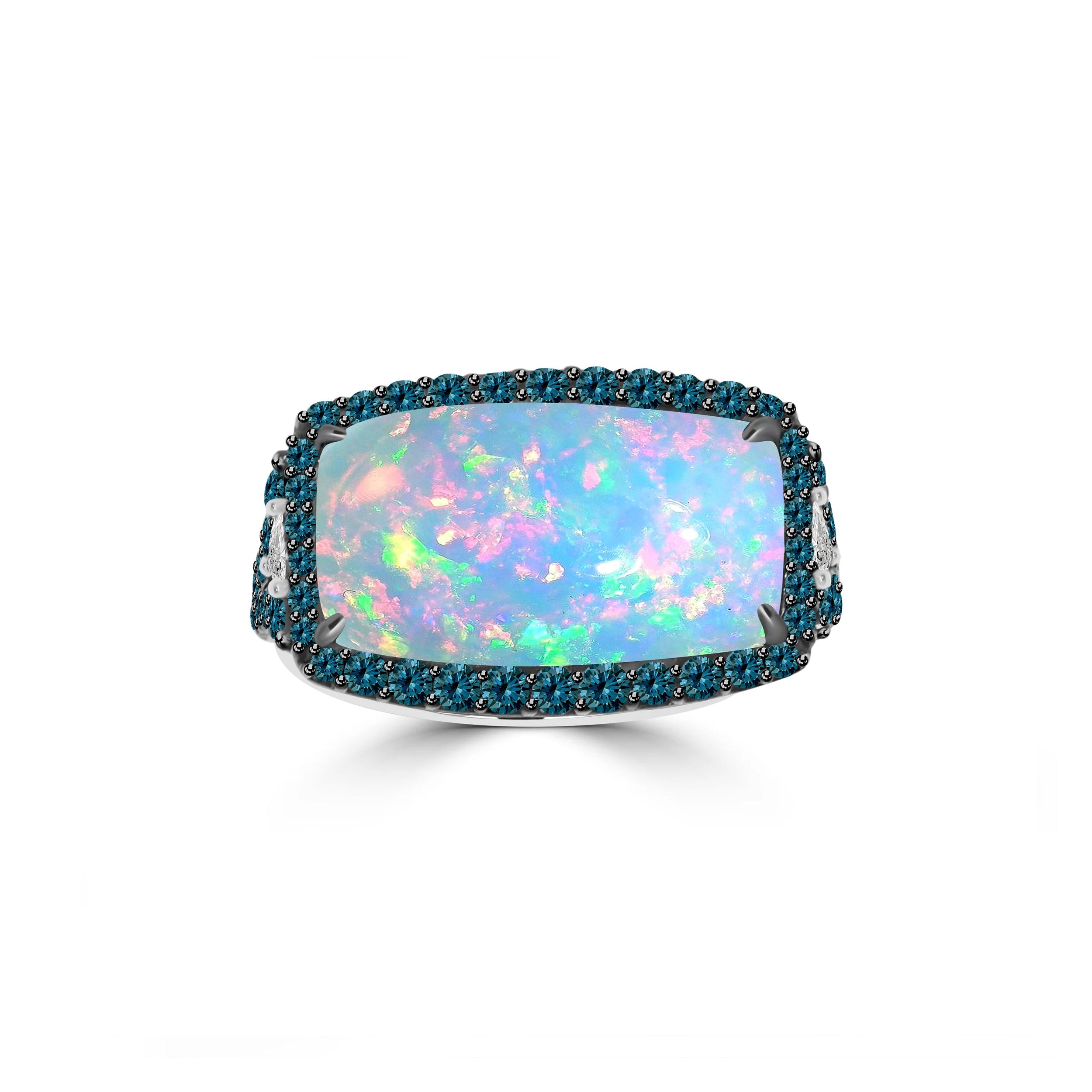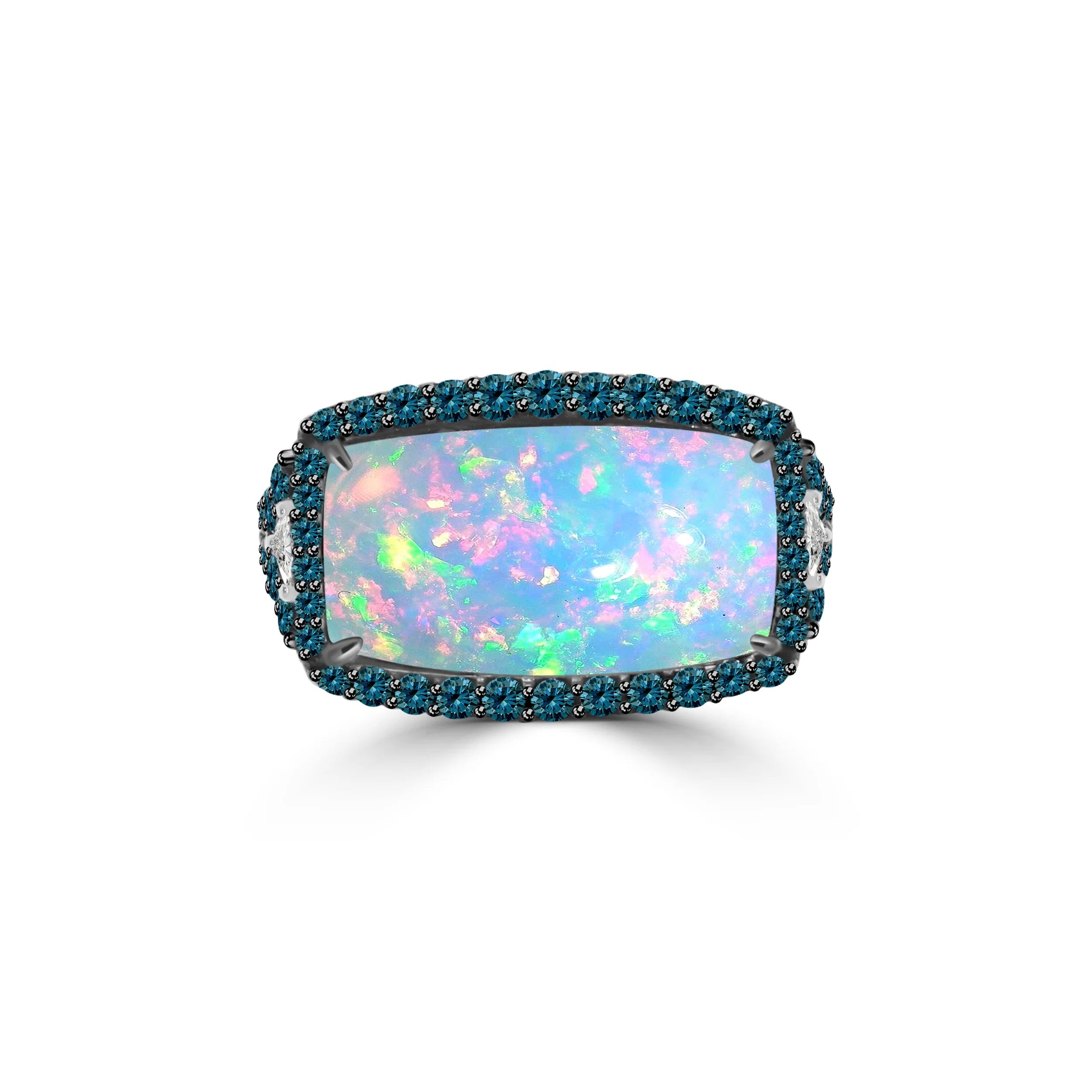 The *CASE* ring is a mesmerizing expression of elegance and enchantment. At its center, a captivating opal glows with a kaleidoscope of soft, iridescent hues, radiating an ethereal charm. Flanked by fancy-cut diamonds on either side and encircled by a halo of sparkling blue diamonds, this design creates a stunning play of color and light.