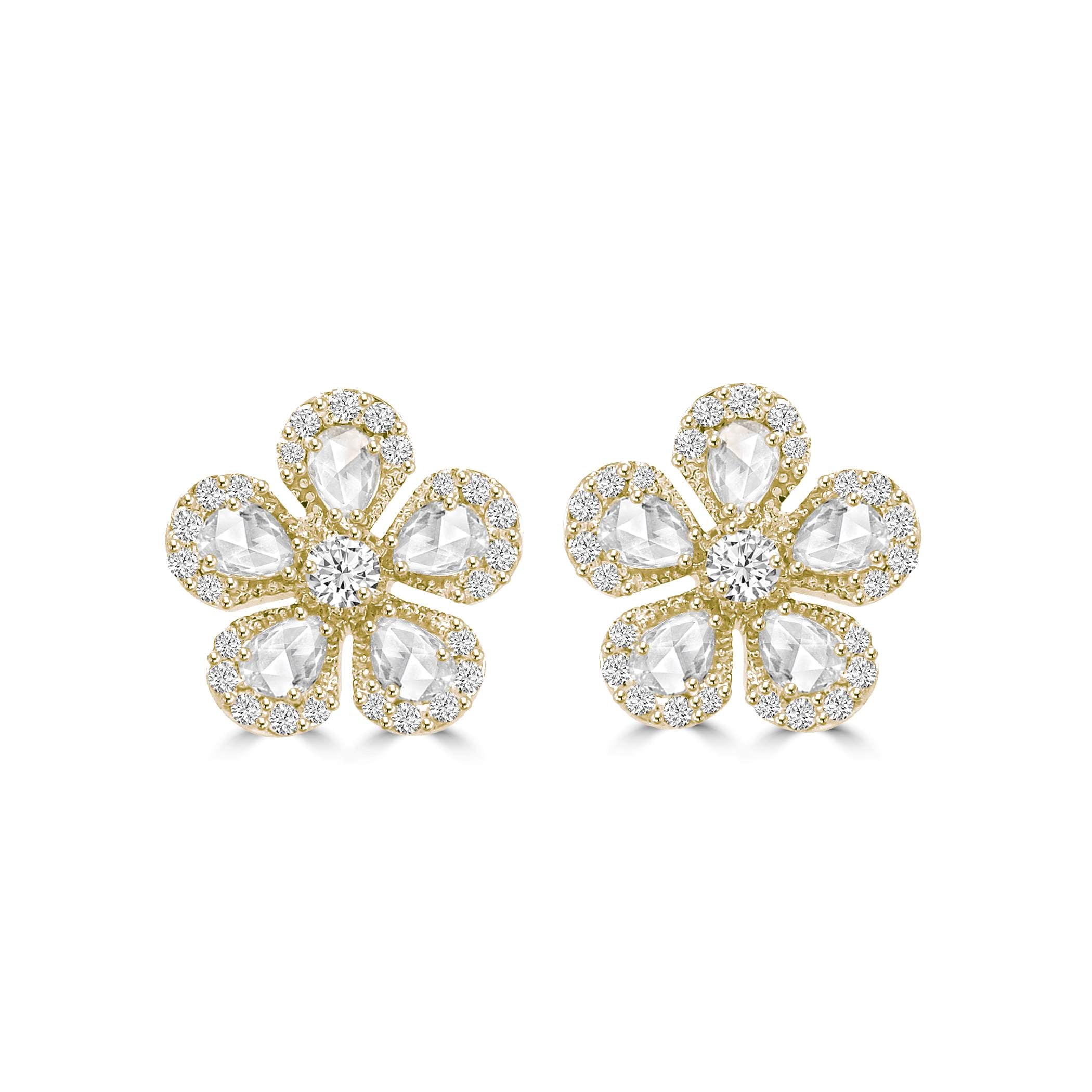 Enhance your jewelry collection with these stunning floral CHAMOMILE stud earrings made from lustrous 18K yellow gold. Each earring is inspired by the fragile charm of chamomile blossoms and showcases five rose-cut diamond petals that shimmer, encircled by a brilliant diamond halo. A stunning round-cut diamond in the middle heightens their classic sophistication. These earrings provide a delightful combination of nature-inspired charm and fine craftsmanship, making them ideal for special occasions or everyday luxury. These diamond flower studs are a beautiful embodiment of sophistication and grace, whether you choose to treat yourself to them or give them as a considerate gift. Wear them with any ensemble for an effortlessly chic accent.