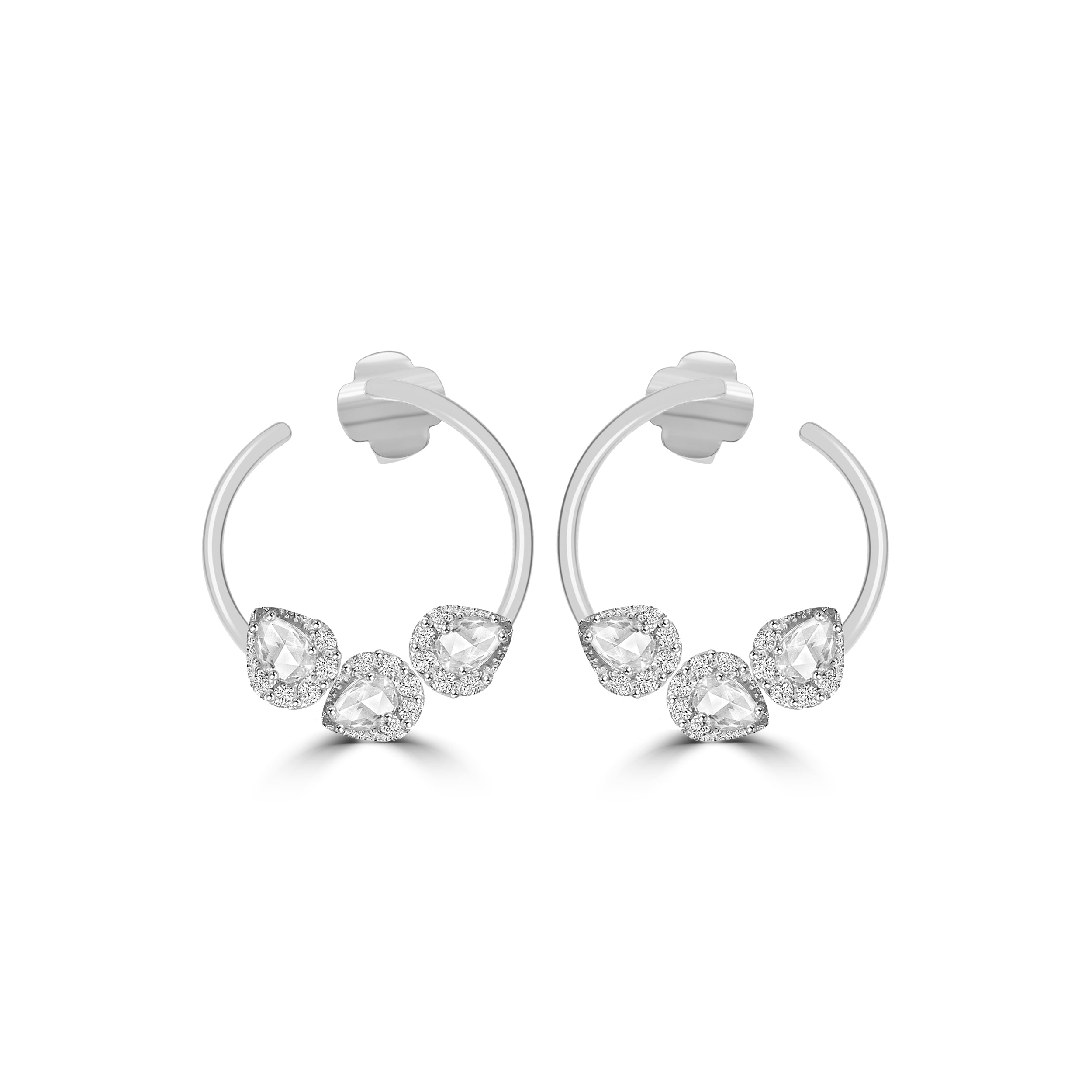 Crafted from gleaming white gold, these elegant CHAMOMILE hoop earrings boast a modern open design. Each earring features three shimmering pear shaped rose cut diamonds, encircled by a delicate halo of brilliant cut diamonds that produces a dazzling effect. Due to their exquisite craftsmanship and classic beauty, these earrings are ideal for any occasion, whether casual or formal. Equipped with secure push-back closures, they guarantee a comfortable fit for all-day use. These gorgeous earrings radiate sophistication and charm, making them an essential accessory for anyone with a keen sense of fashion—whether as a gift or a personal addition to your jewelry collection.