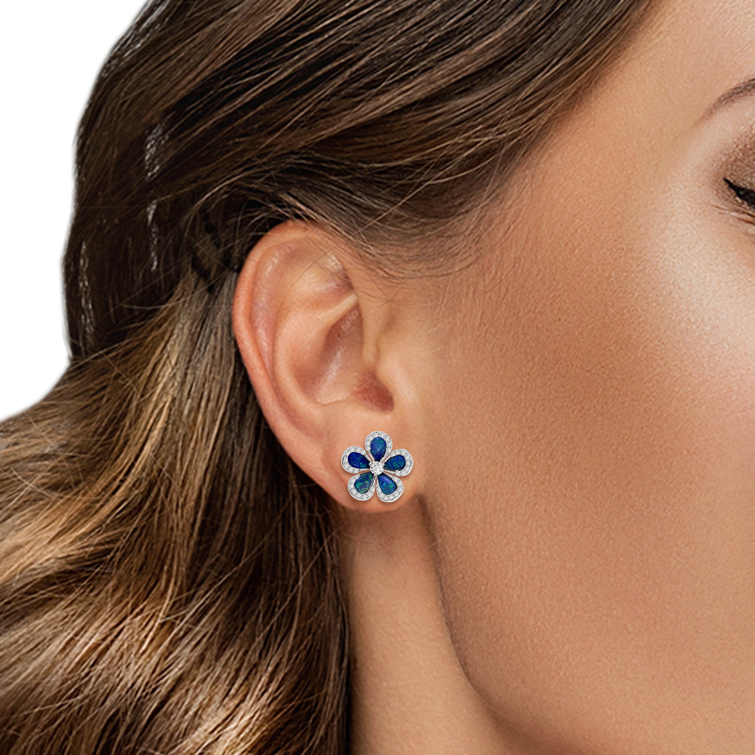 Boost your fineness with these stunning floral CHAMOMILE stud earrings, which showcase five pear-shaped deep blue opals set in a delicate flower arrangement. Every opal is encircled by a stunning halo of brilliant cut diamonds, all mounted in opulent 18K white gold for a brilliant effect. With their elaborate artistry and classic design, these earrings are an ideal statement piece for any event. These earrings radiate sophistication and charm, whether donned for a special occasion or as part of daily luxury. They are a breathtaking combination of nature-inspired beauty and exquisite jewelry, making them an ideal gift for someone special or a cherished addition to your collection.
