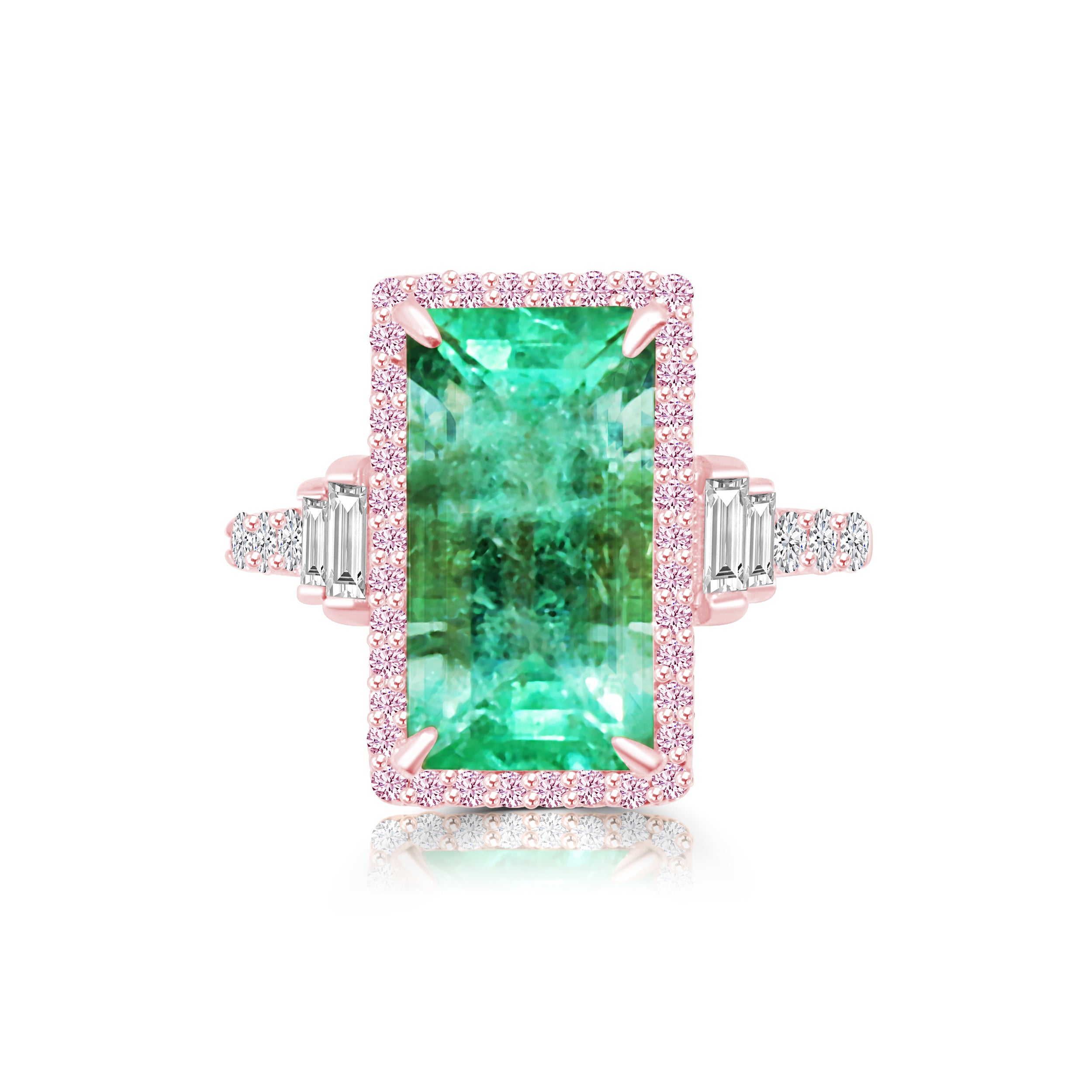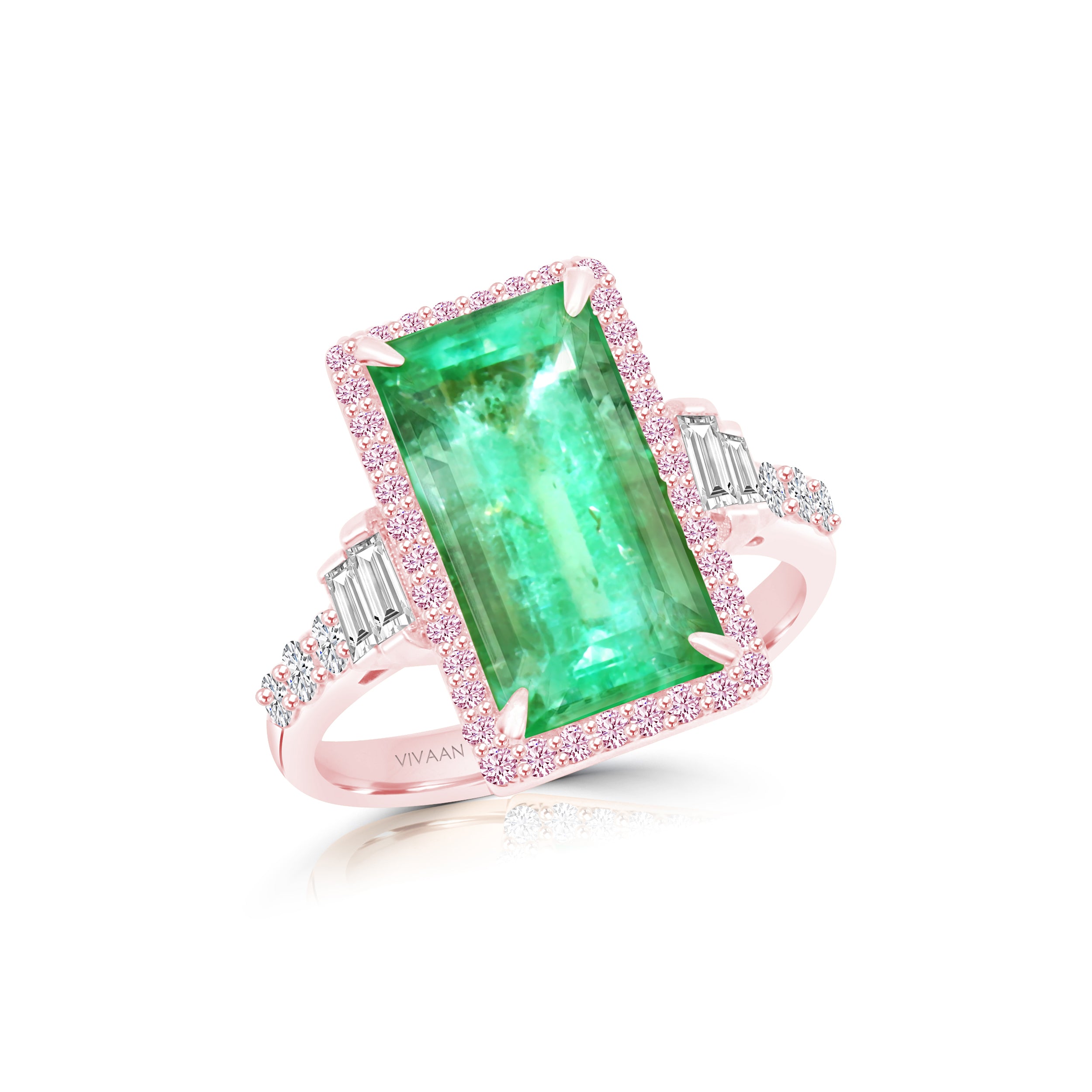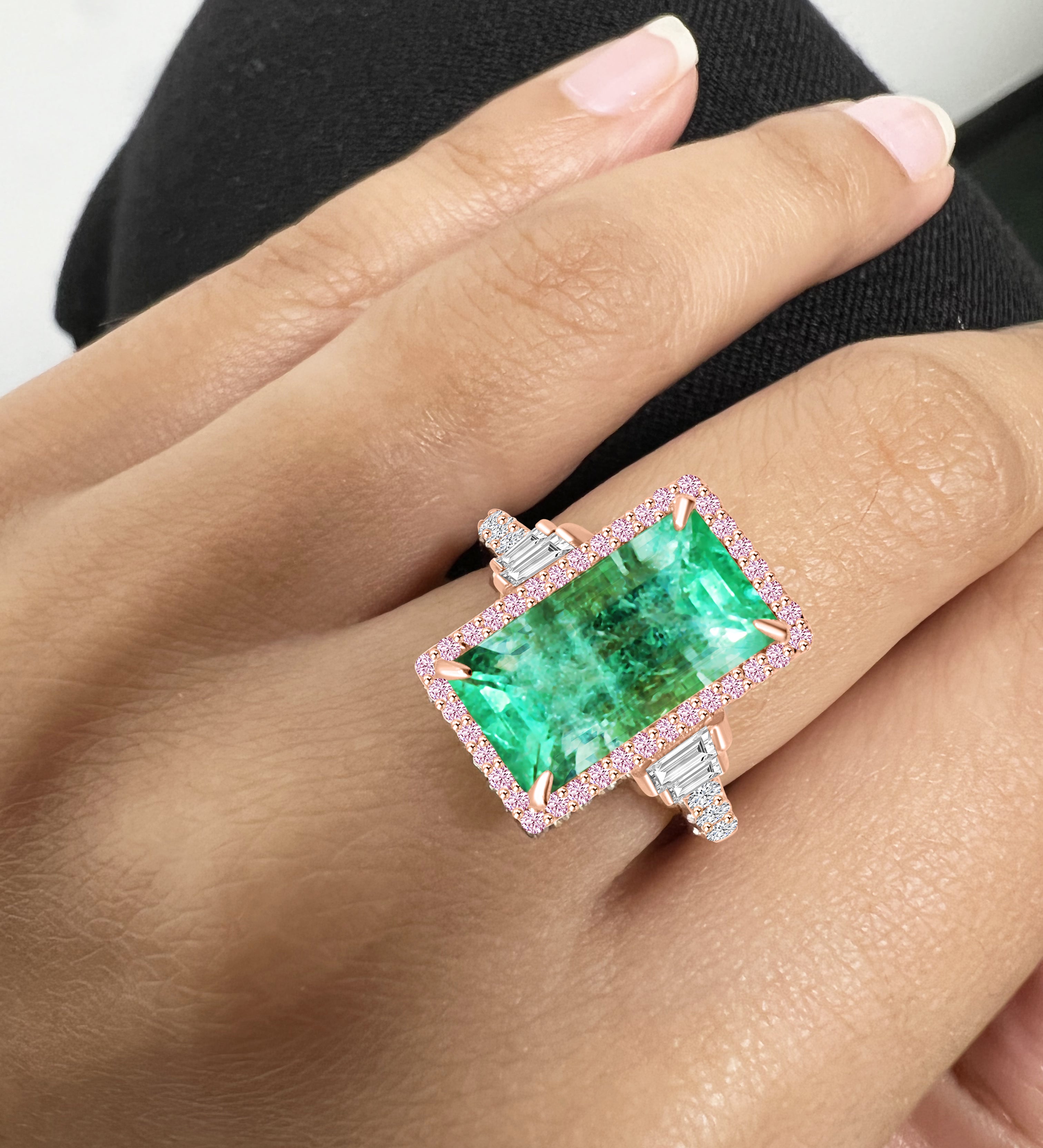 A lustrous statement ring featuring an emerald centerpiece, framed by delicate rose-hued diamonds and adorned with glistening baguettes and sparkling brilliant-cut diamonds, all tucked within an elegant 18k rose gold setting.
