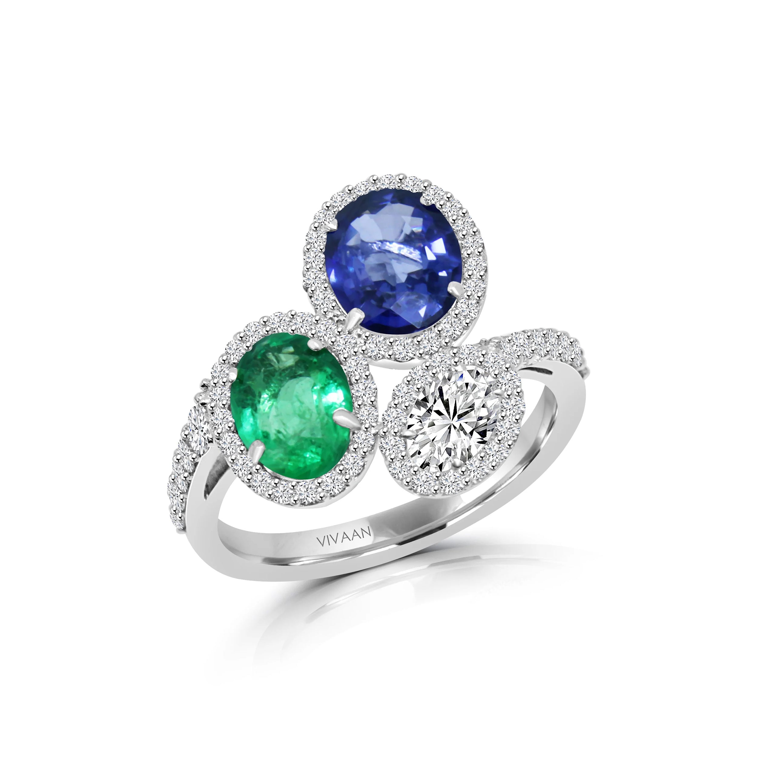 Charming combination of green emerald and blue sapphire complimented with sparkly diamond coming together in a ring made in 18k white gold.