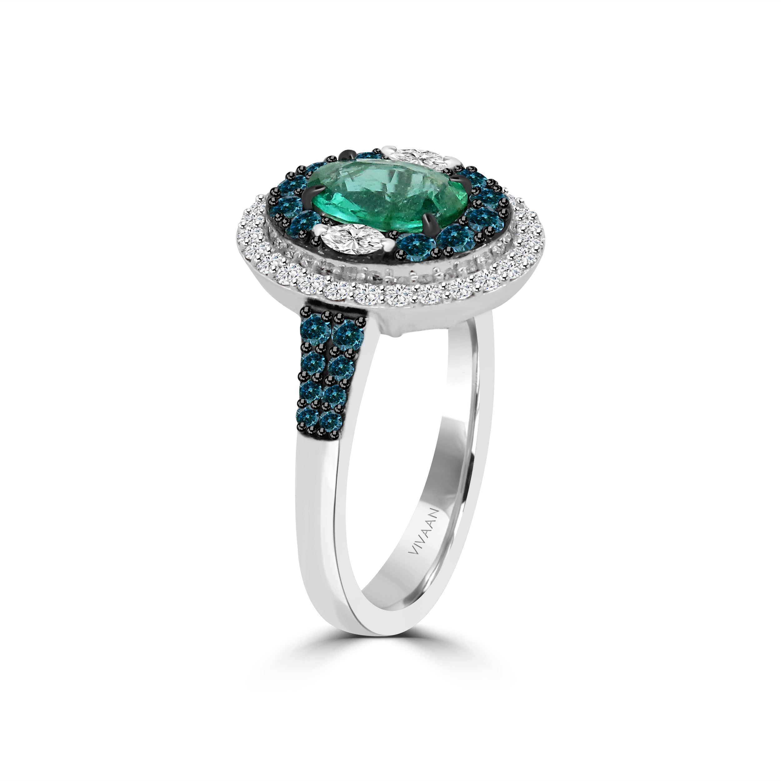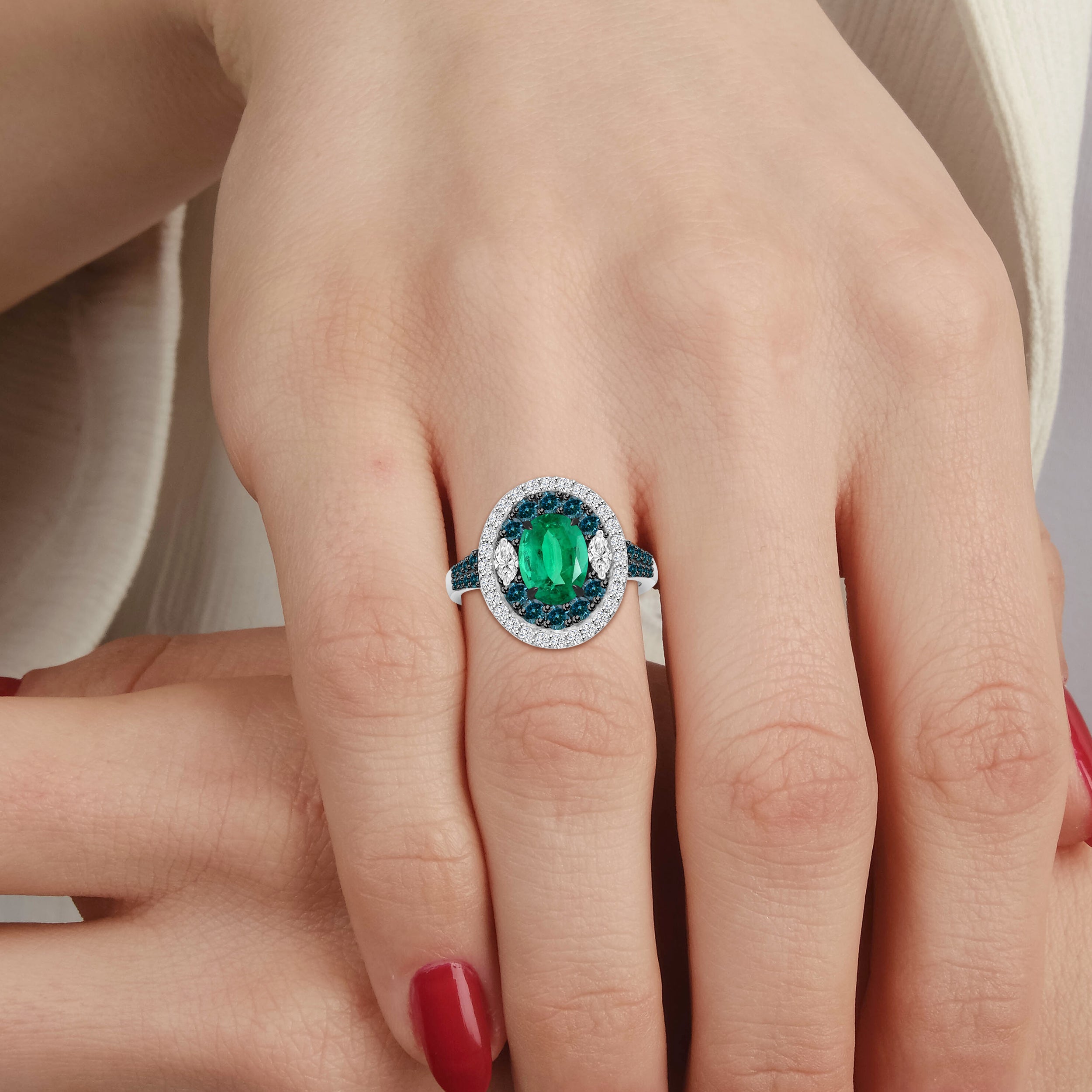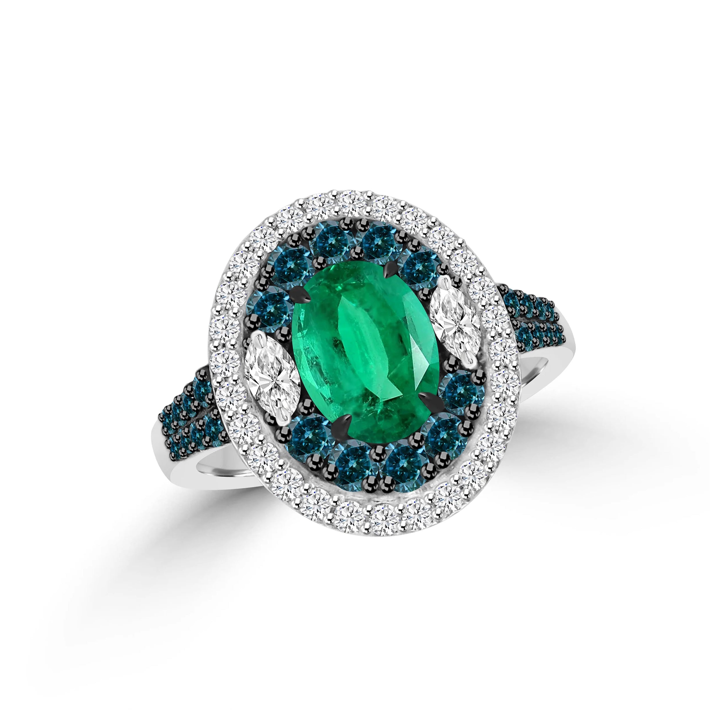 The *CLEO* ring is a regal masterpiece that combines classic beauty with striking sophistication. At its center, a captivating emerald radiates with its rich, lush green hue, evoking timeless luxury. Accented with elegant marquise-shaped diamonds on each side and surrounded by a halo of blue and brilliant-cut diamonds, this design dazzles with a perfect balance of color and sparkle.