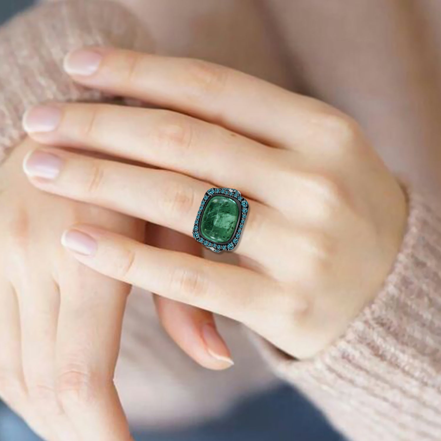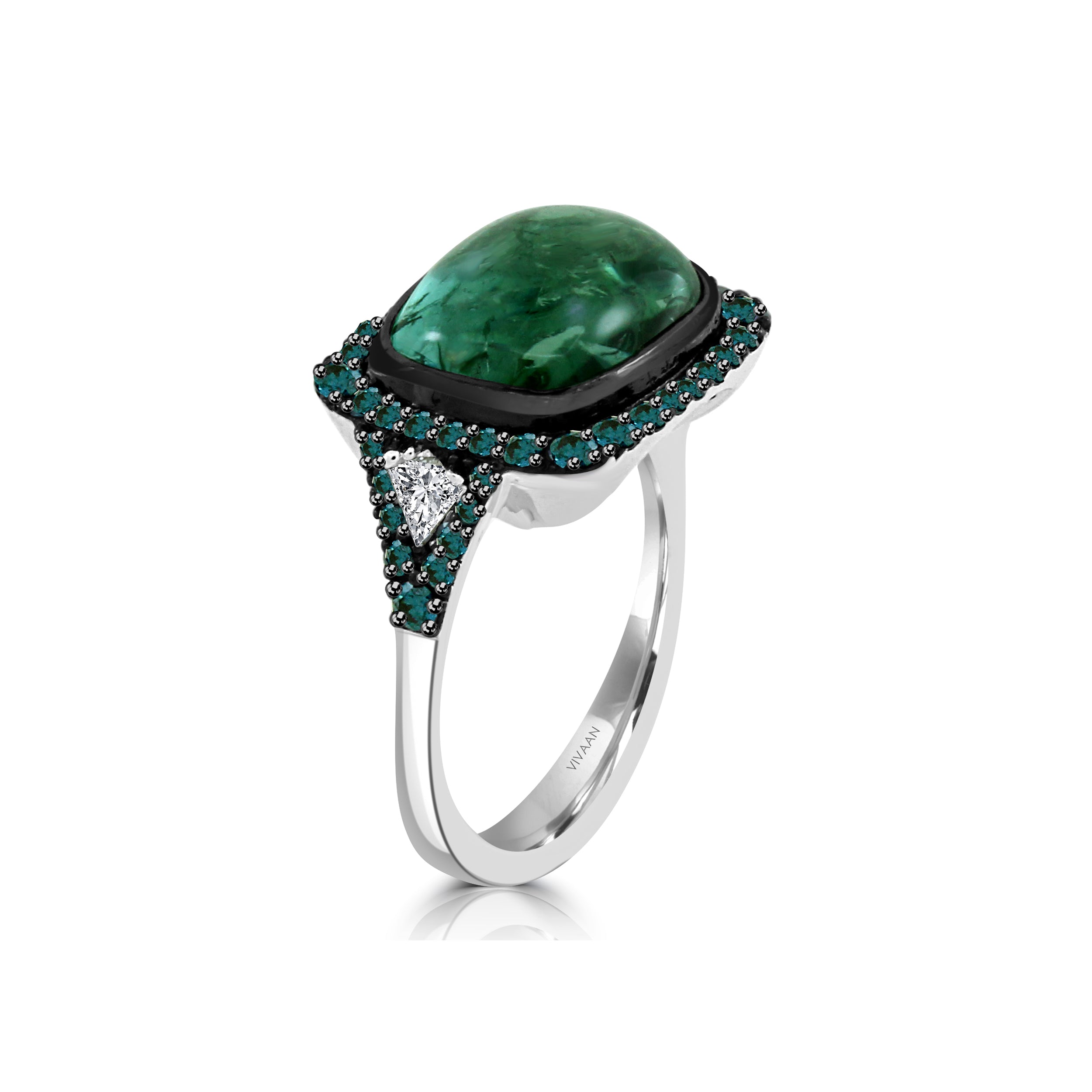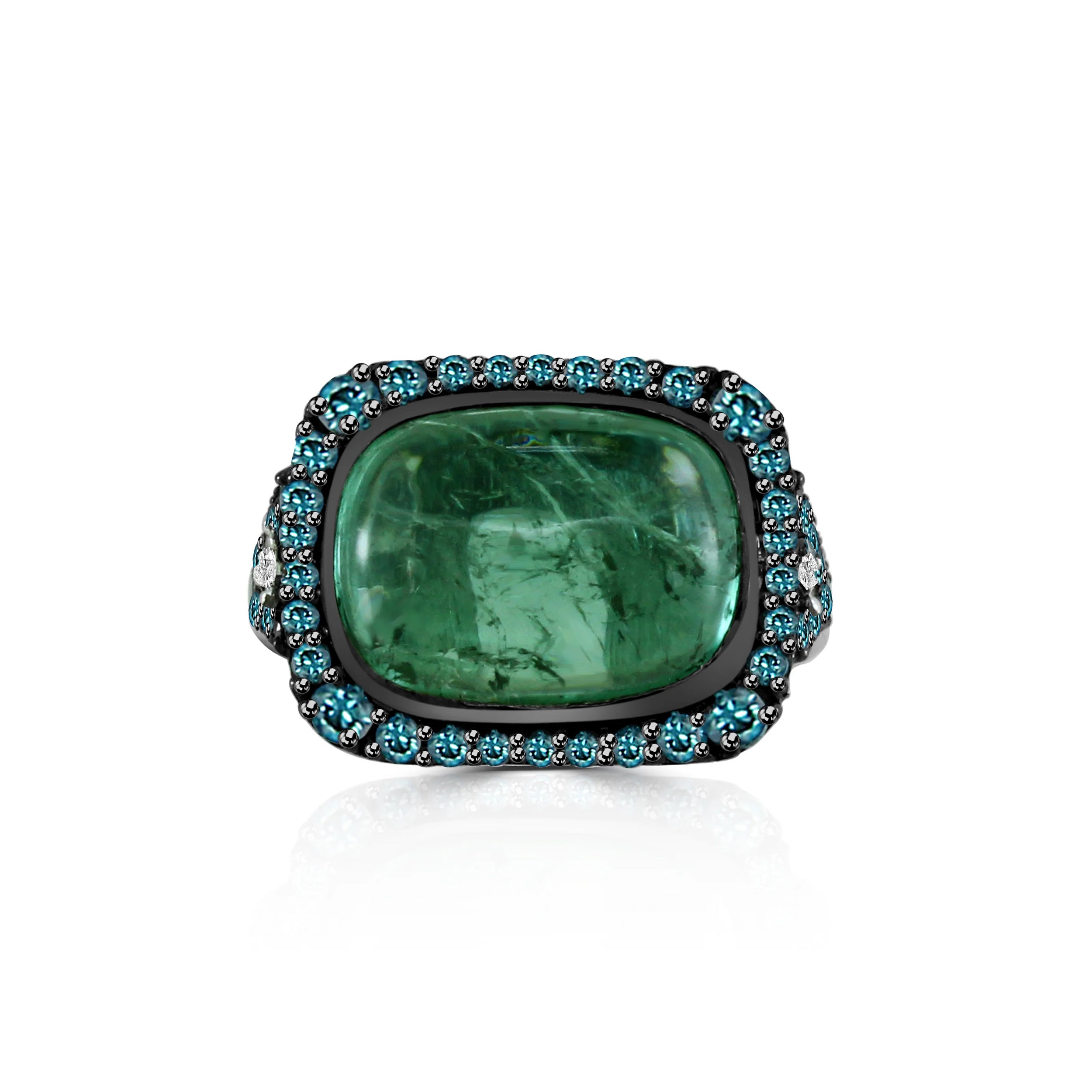 Update your jewelry collection with this elegant CONIFER ring! Featuring a cabochon tourmaline that resembles a luscious pine-cone, it's set in an 18K white gold frame that sparkles with treated blue and kite-shaped diamonds. A must-have for any special occasion!