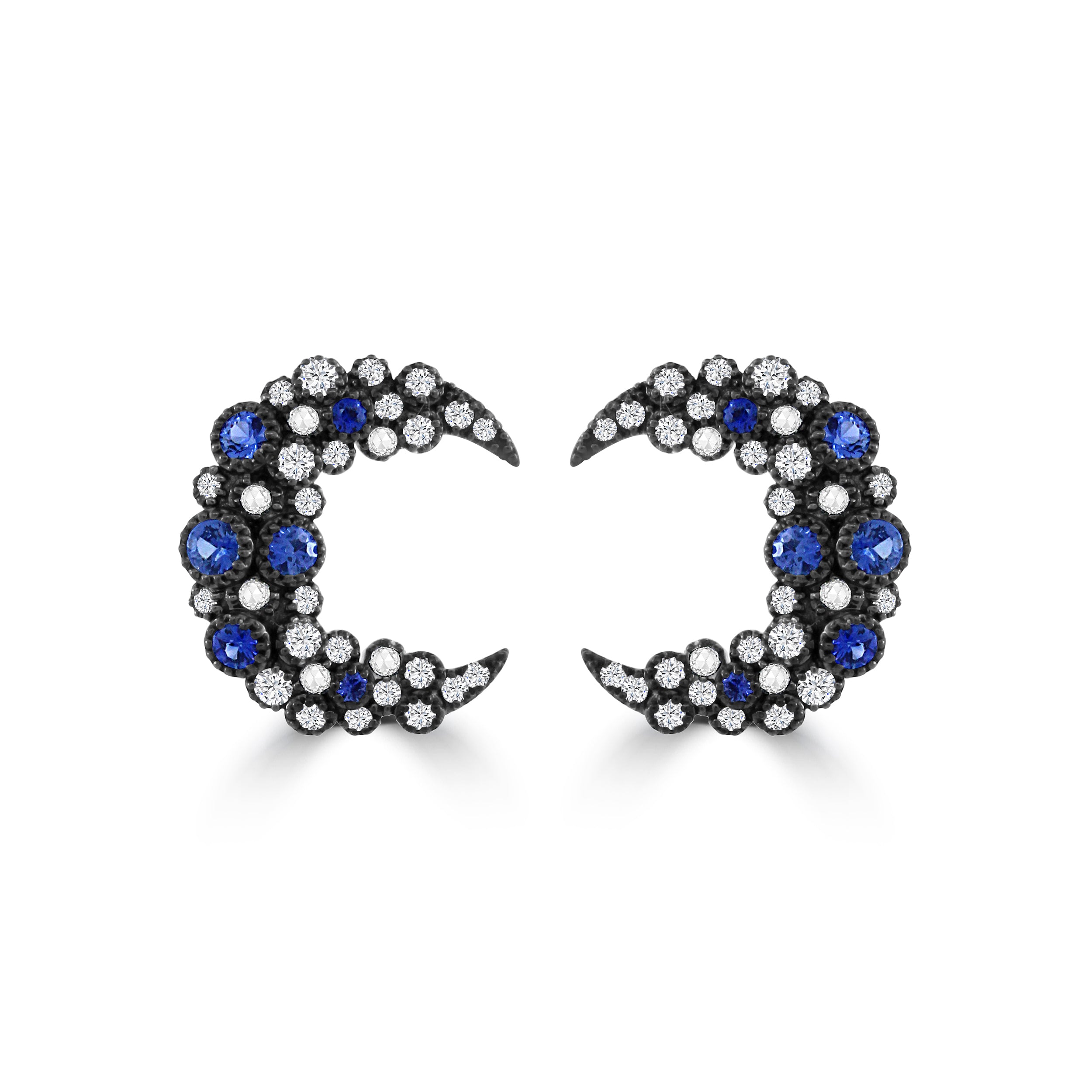 These elegant crescent-shaped earrings represent an extraordinary fusion of audacious design and refinement. Adorned with beautiful brilliant cut diamonds and royal blue sapphires, they create a striking contrast against the black metal setting. The intricate arrangement of the stones highlights the heavenly crescent motif, resulting in a luxurious statement piece within these earrings. They exude sophistication and intrigue, making them perfect for evening wear or special occasions. No matter if it’s paired with a glamorous ensemble or a timeless black dress, these earrings add a touch of celestial charm and timeless sophistication to any look. A must-have for jewelry lovers who seek originality and shine.