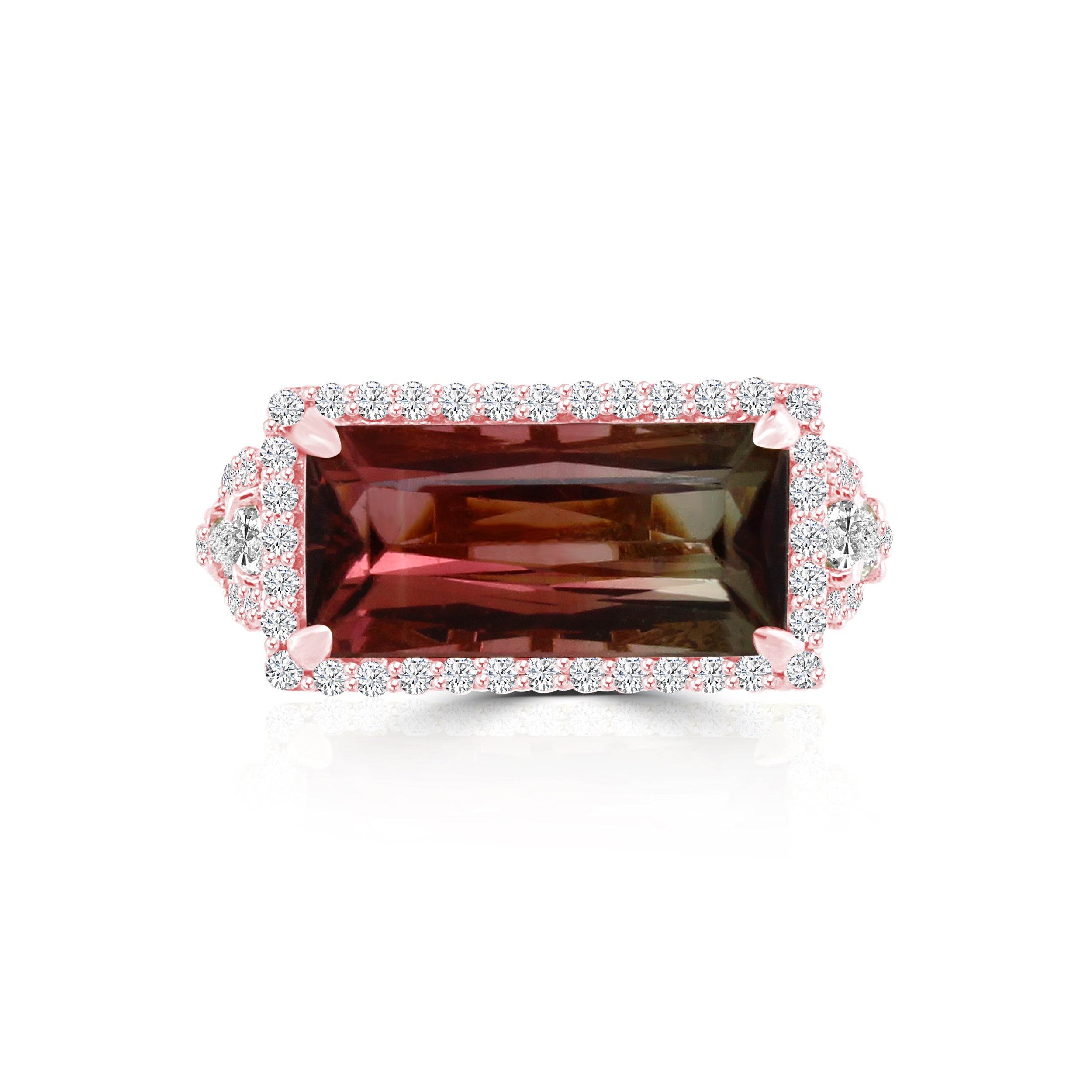 The DIANTHE Tourmaline ring is a feminine powerhouse of gemstones. Sparkling pink diamonds and pear-shaped white diamonds set in 18k rose gold provide a rosy flush of luxury, perfect for gals who want to make an outrageous statement!