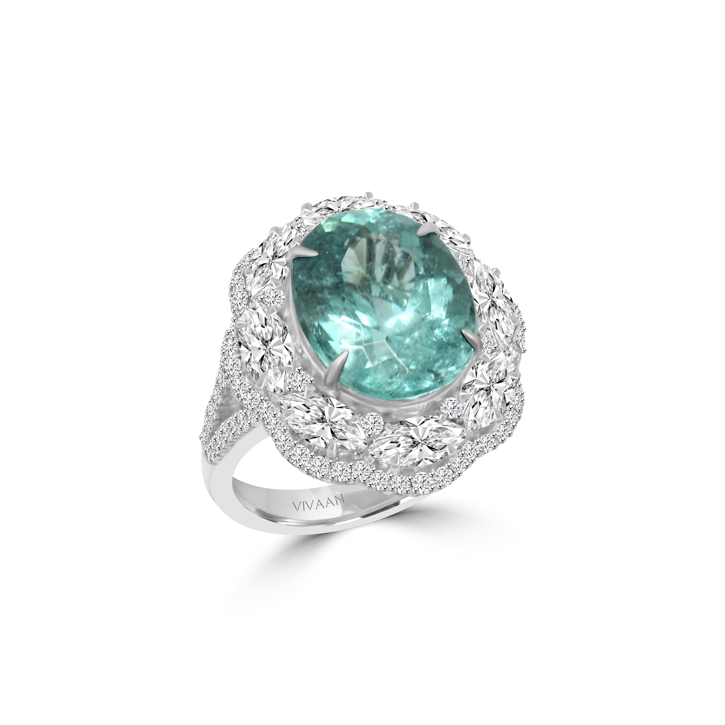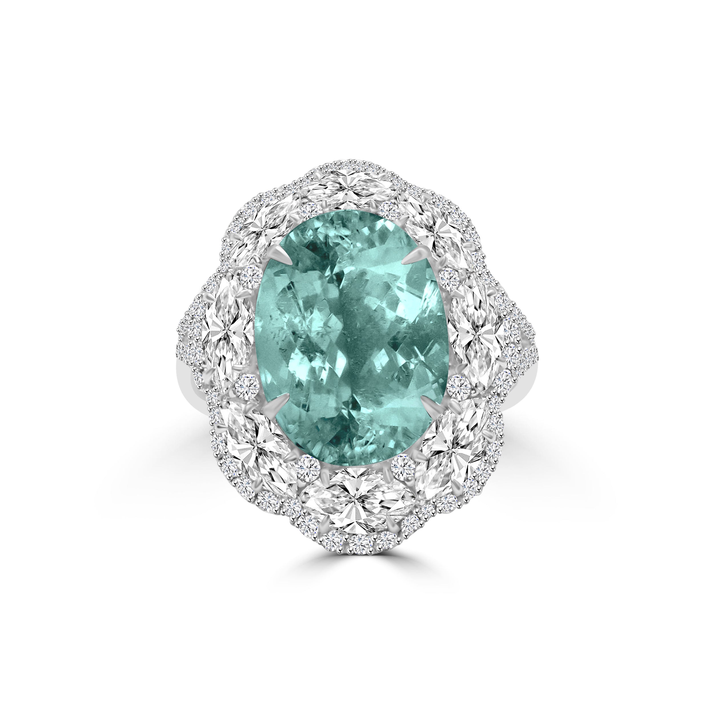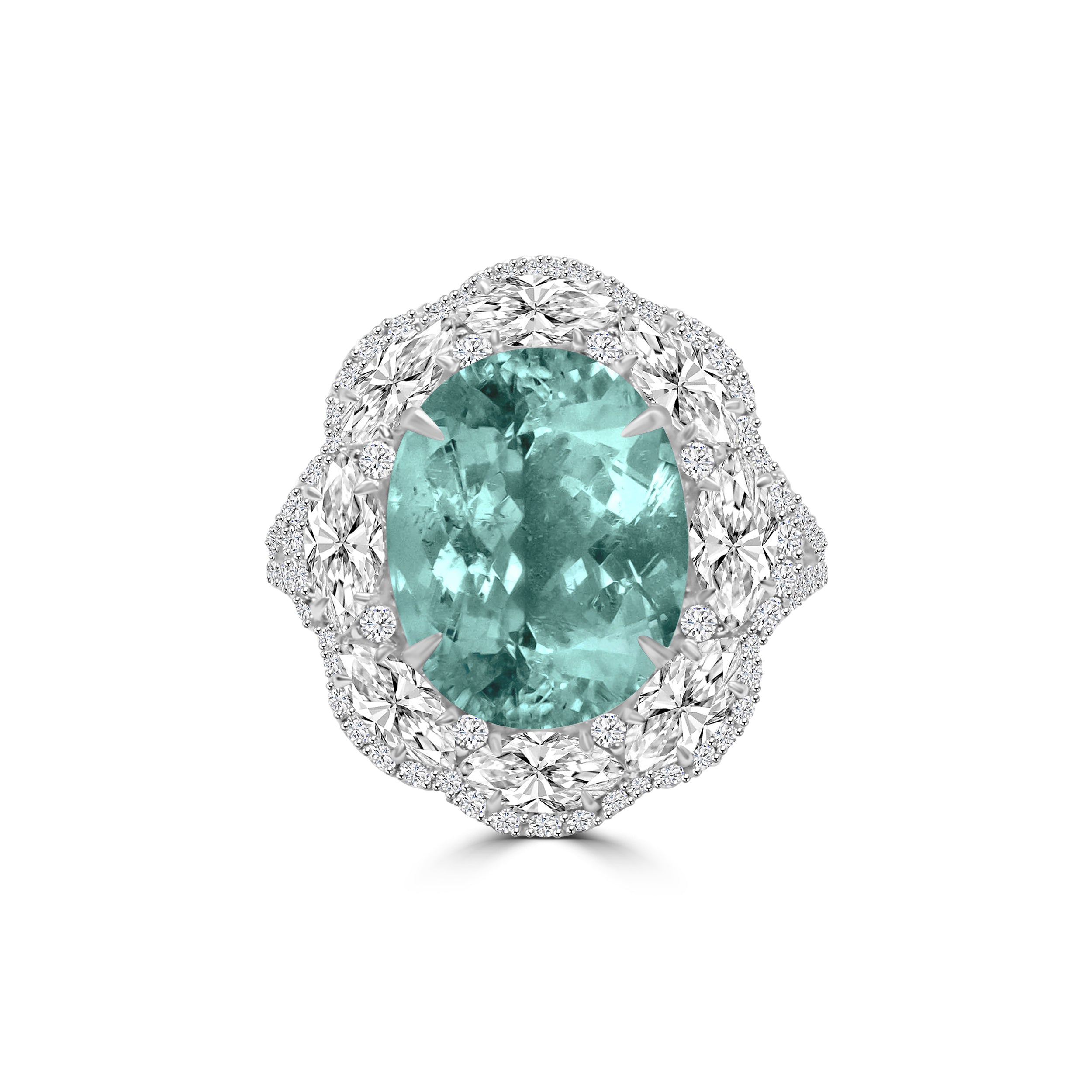 Elevate your elegance with this exquisite indicolite Green Tourmaline Ring. The centerpiece is a stunning indicolite tourmaline, renowned for its mesmerizing blue green hue, surrounded by an array of marquise and brilliant diamonds. The intricate diamond setting highlights the rich color of the tourmaline, creating a truly captivating piece. Perfect for making a statement at any special event.