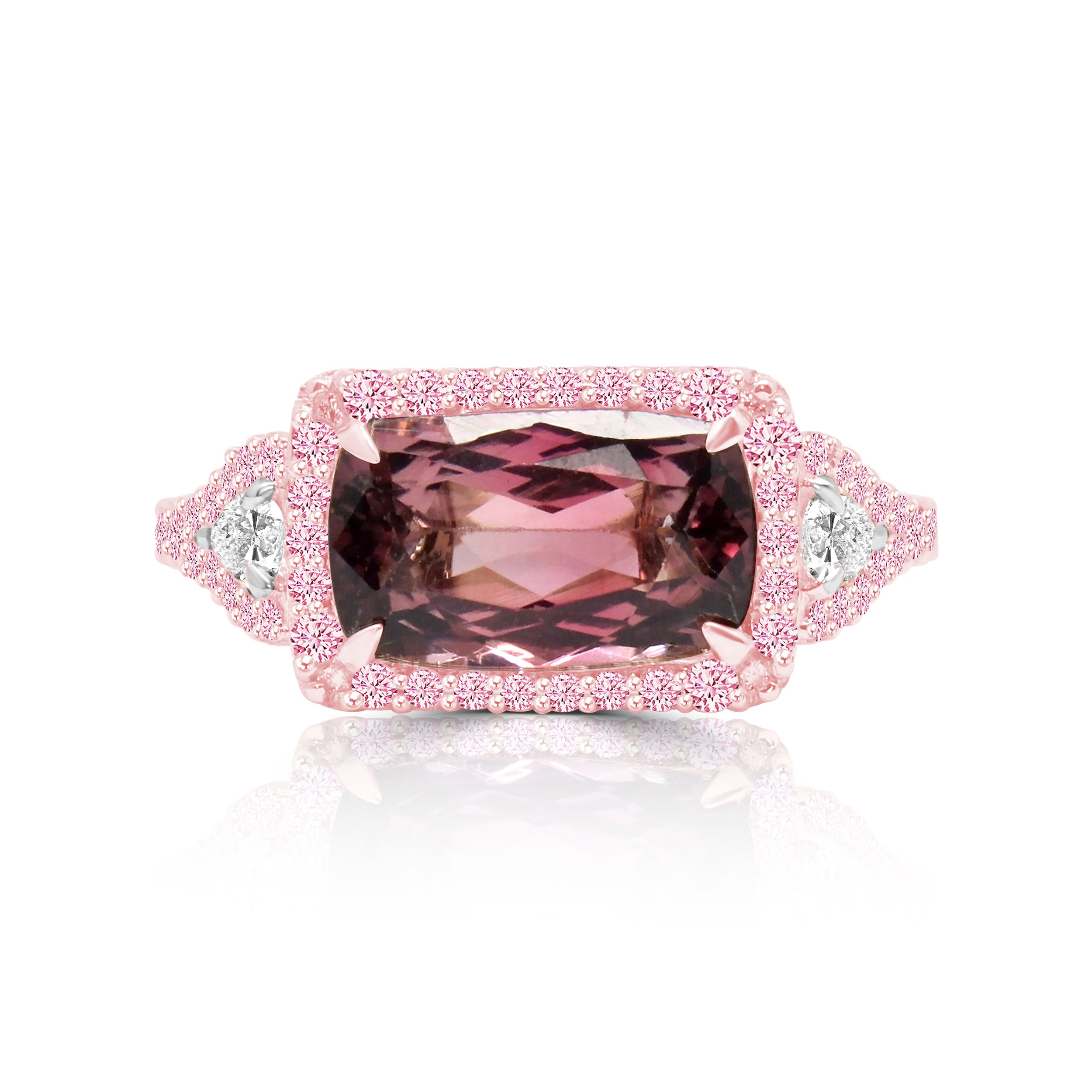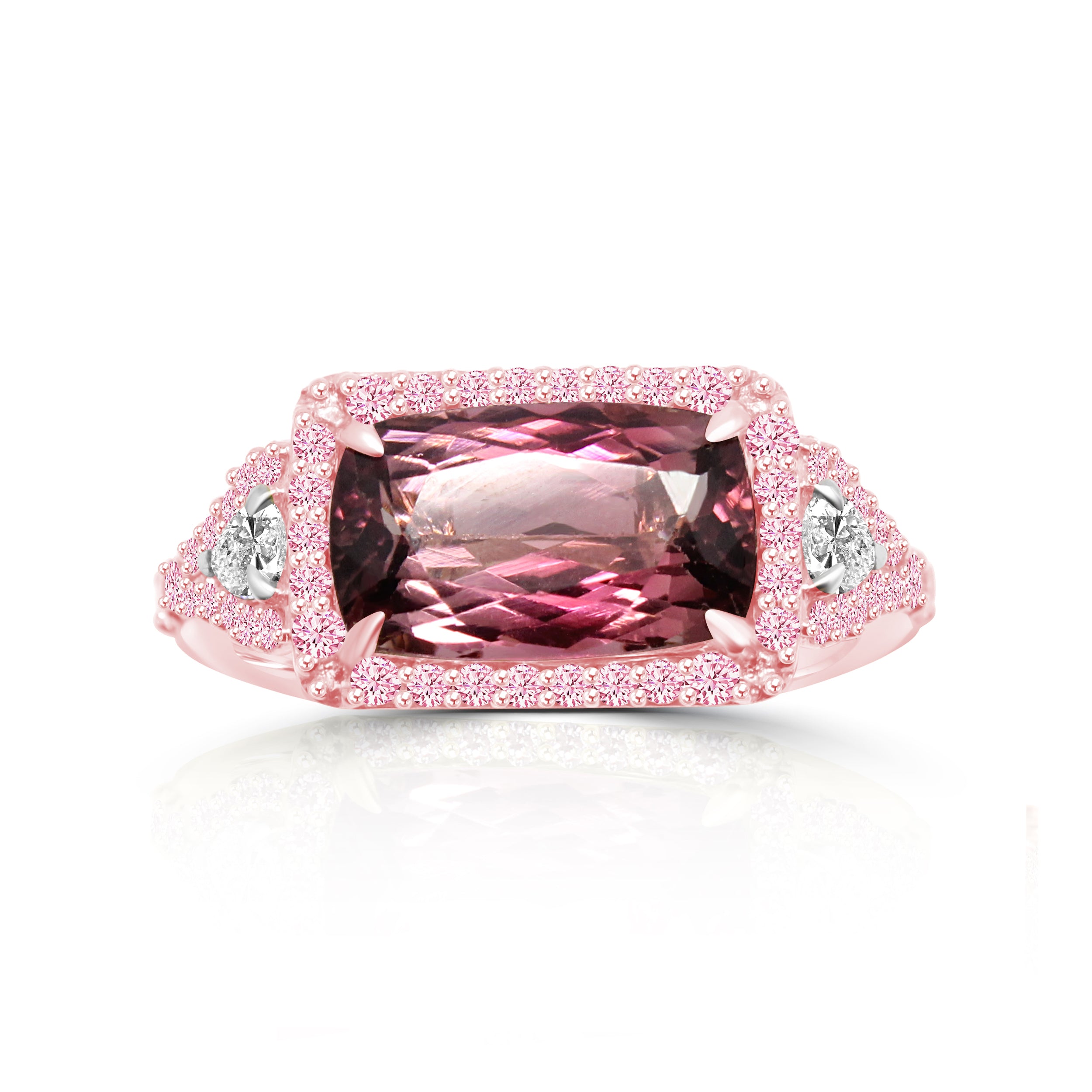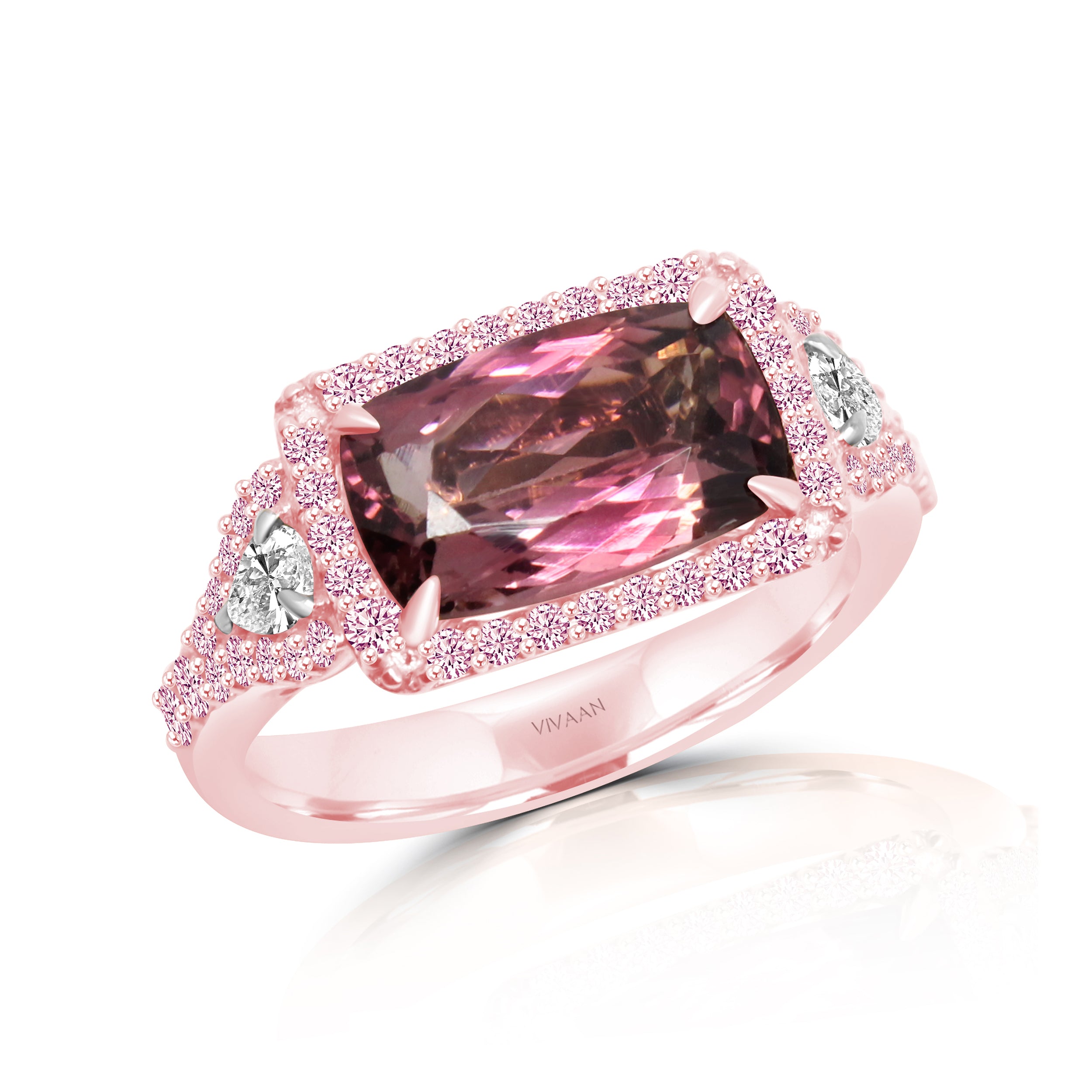 Illuminate your style with our stunning tourmaline ring featuring natural pink diamonds and pear-shaped diamonds. This exquisite piece highlights the subtle pink red hues of the tourmaline, elegantly complemented by the sparkling natural pink and pear-shaped diamonds. Crafted with precision, this ring radiates luxury and sophistication, making it a timeless addition to any jewelry collection. Elevate your look with this captivating design, perfect for any special occasion.