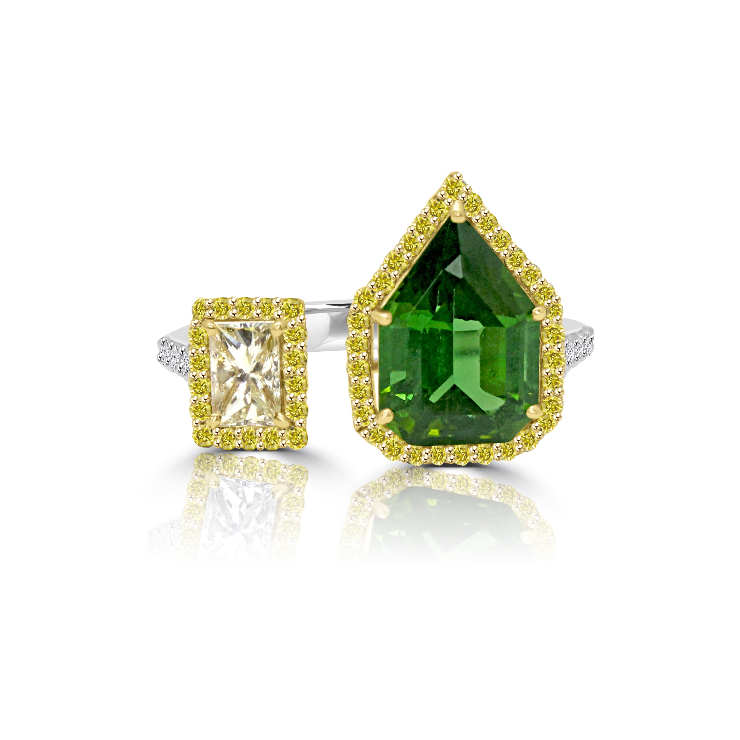 Introducing GLAZE, a stunning collaboration of Natural, Rare, & Exotic Green Tourmaline & Rectangular Princess Diamond adored with Canary & Brilliant Diamonds set in 18k White Gold. Style yourself with a one-of-a-kind jewelry piece that is exotic, unique, and oh-so-gorgeous!