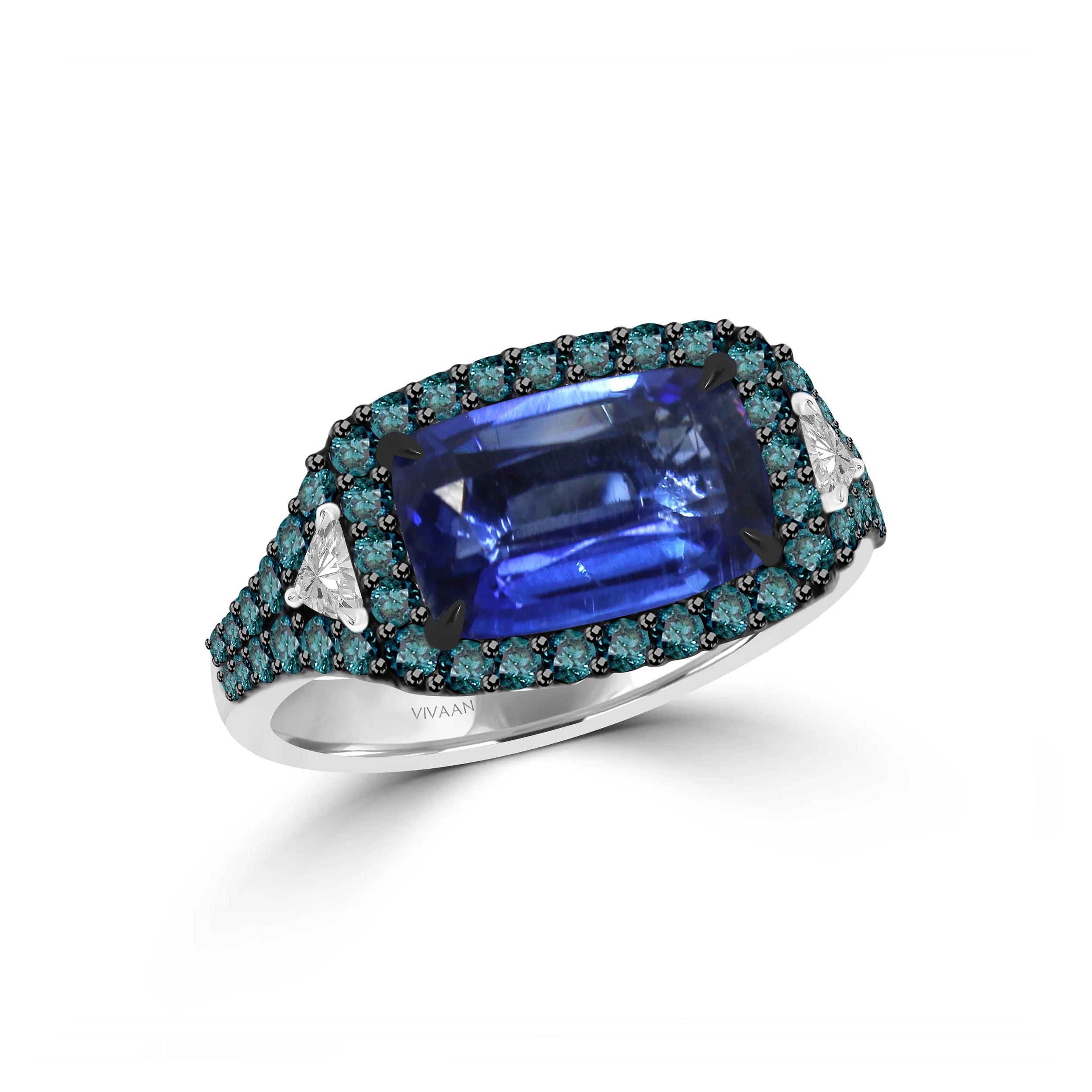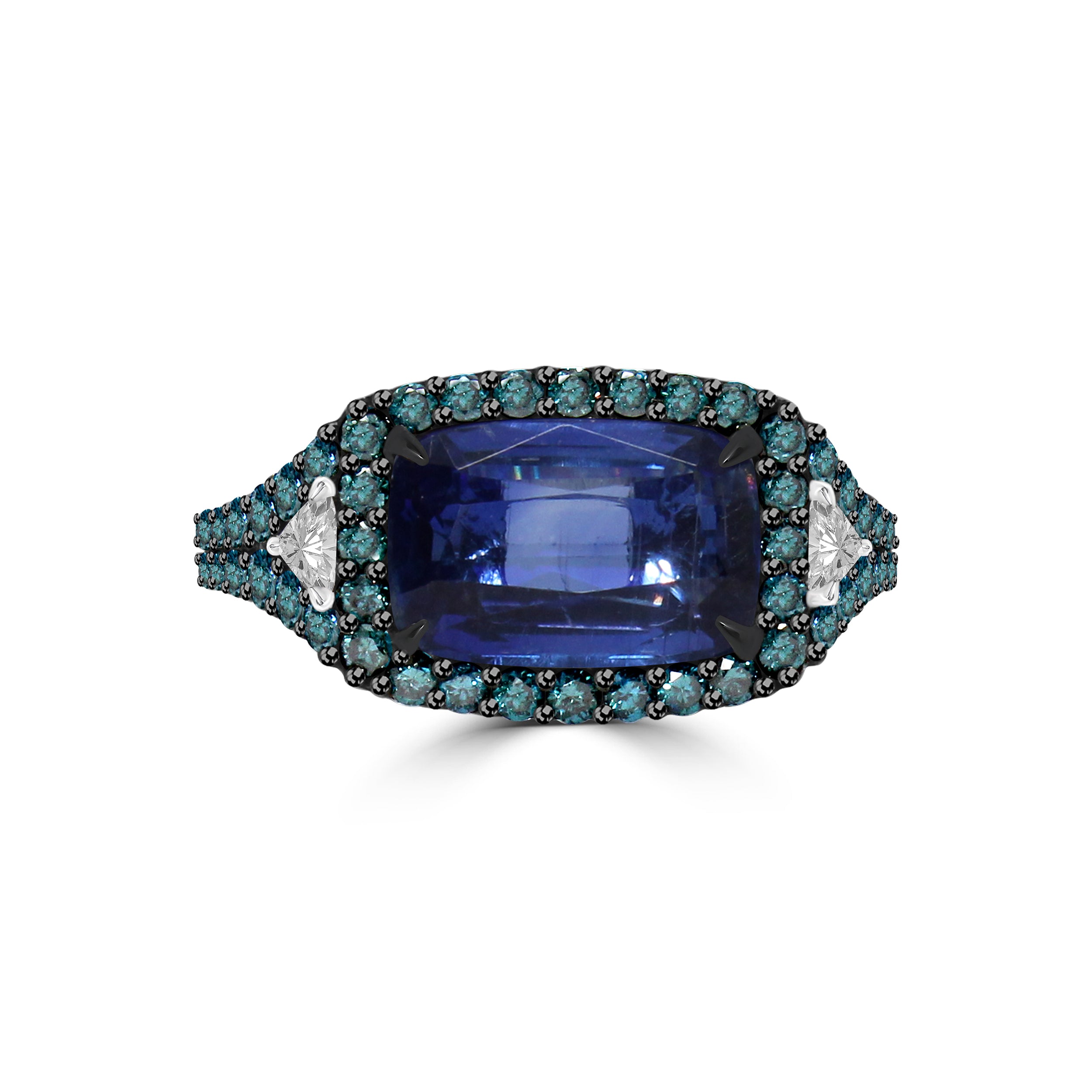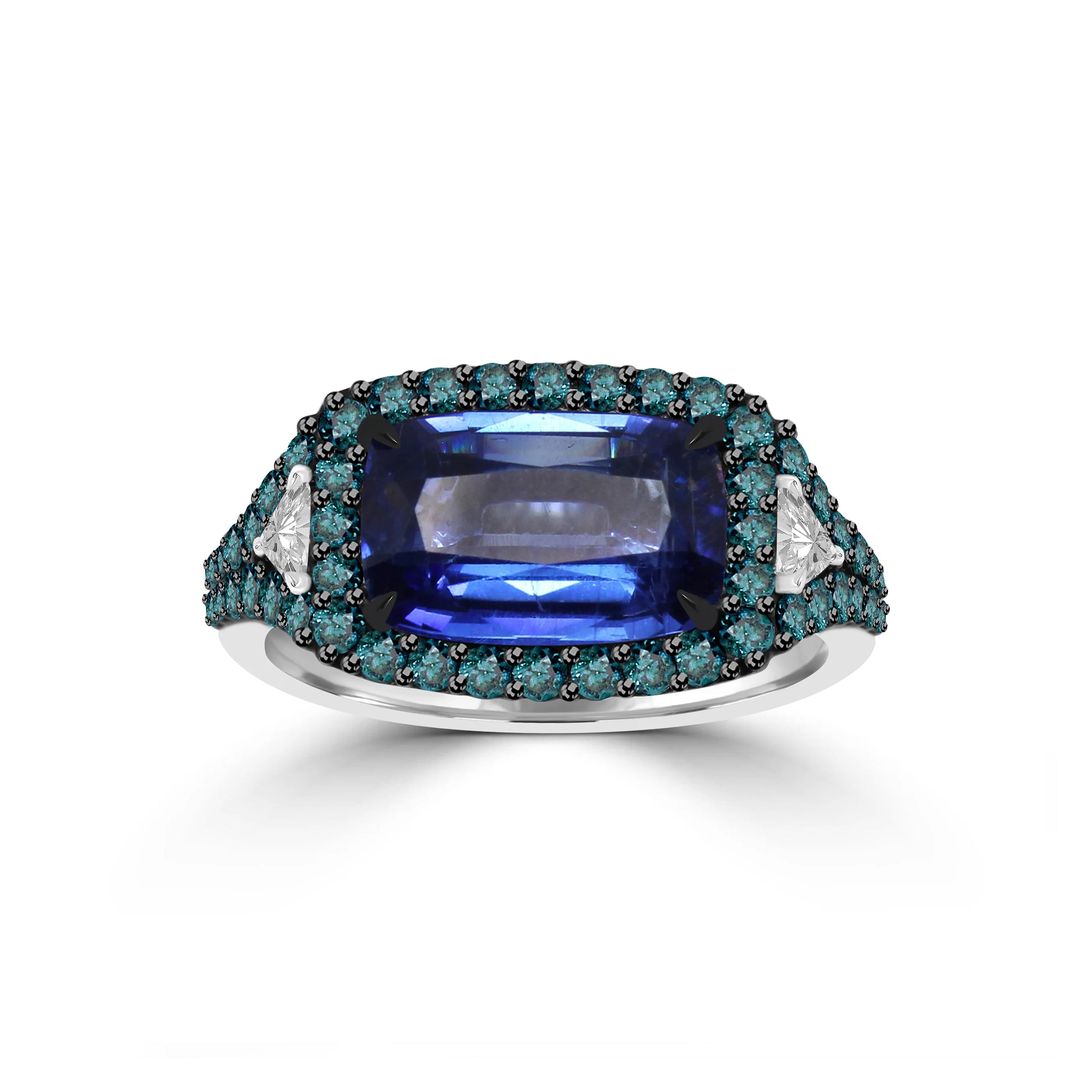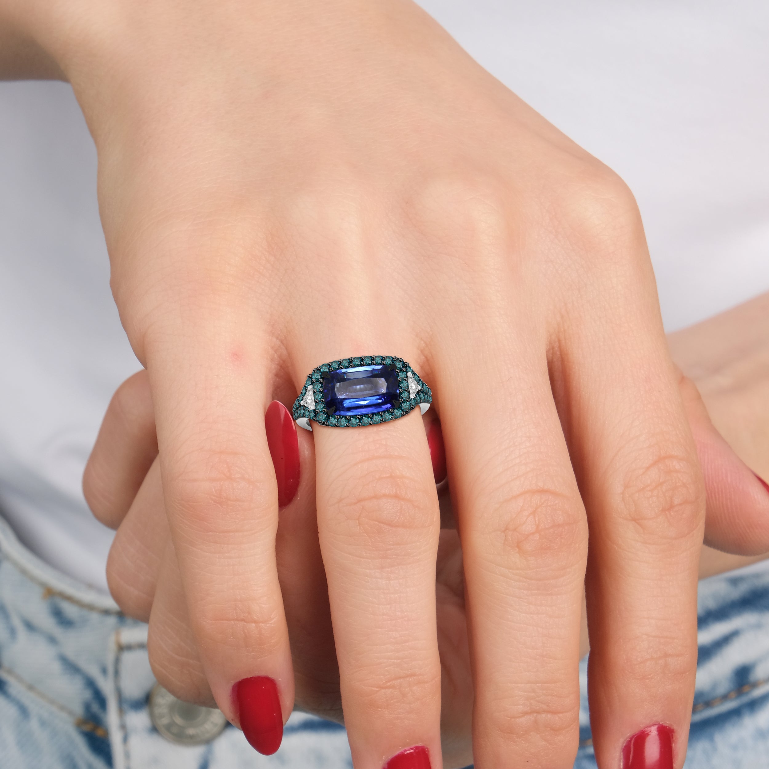 Elevate your elegance with this exquisite Glaze Blue Kyanite Ring, a true masterpiece set in 18K white gold. The center stone features a rare and captivating Kyanite known for its mesmerizing deep blue hue, radiating a sophisticated charm. Paired with the finest fancy cut diamonds and enhanced by treated blue diamonds, this ring is designed to make a bold statement.