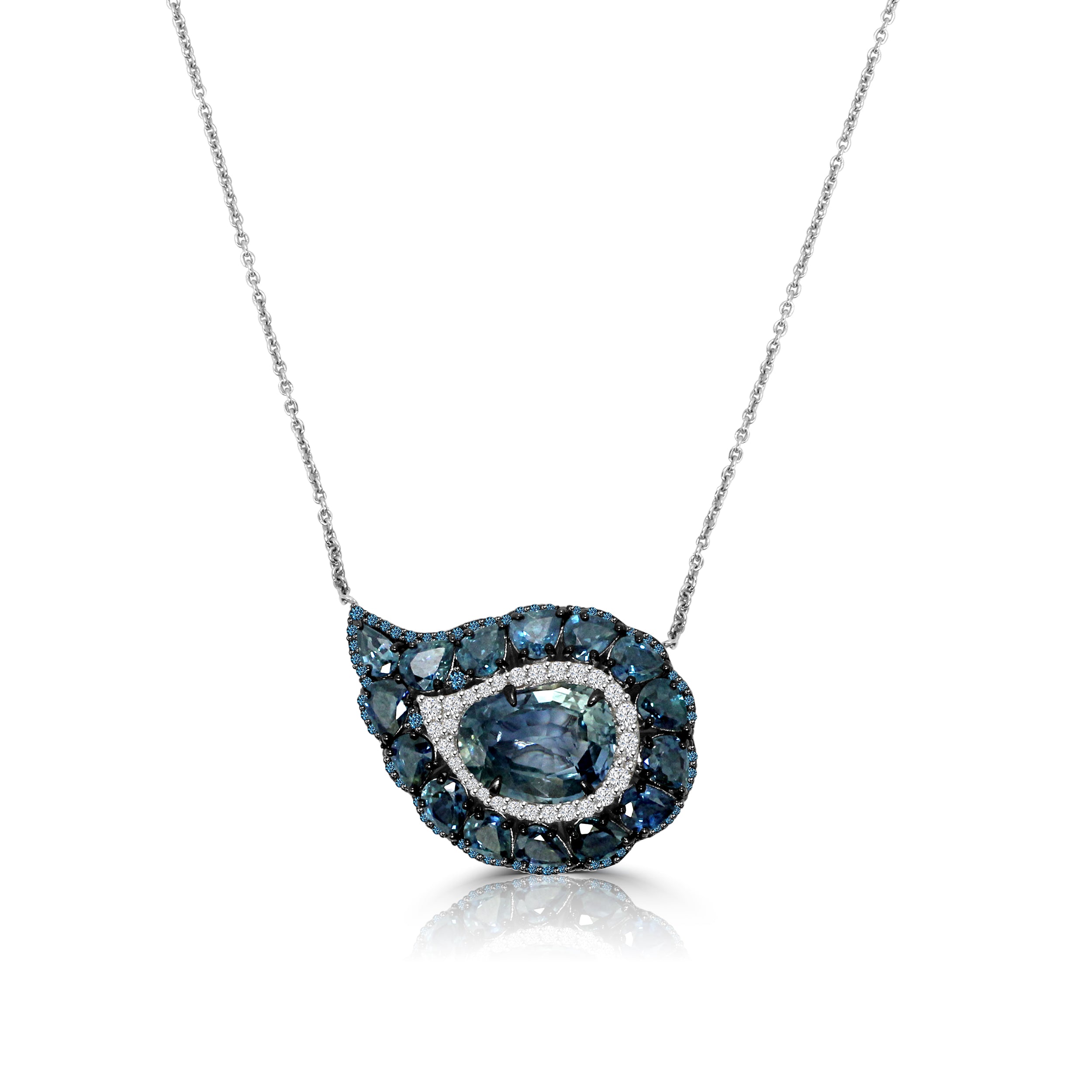 The Azure Paisley Green Sapphire Pendant Necklace showcases a graceful paisley design, symbolizing eternal beauty and charm. Mesmerizing blue-green sapphires take center stage, radiating vibrant hues reminiscent of serene oceans and lush landscapes. Accented with sparkling blue and brilliant diamonds, the composition exudes sophistication and refinement.