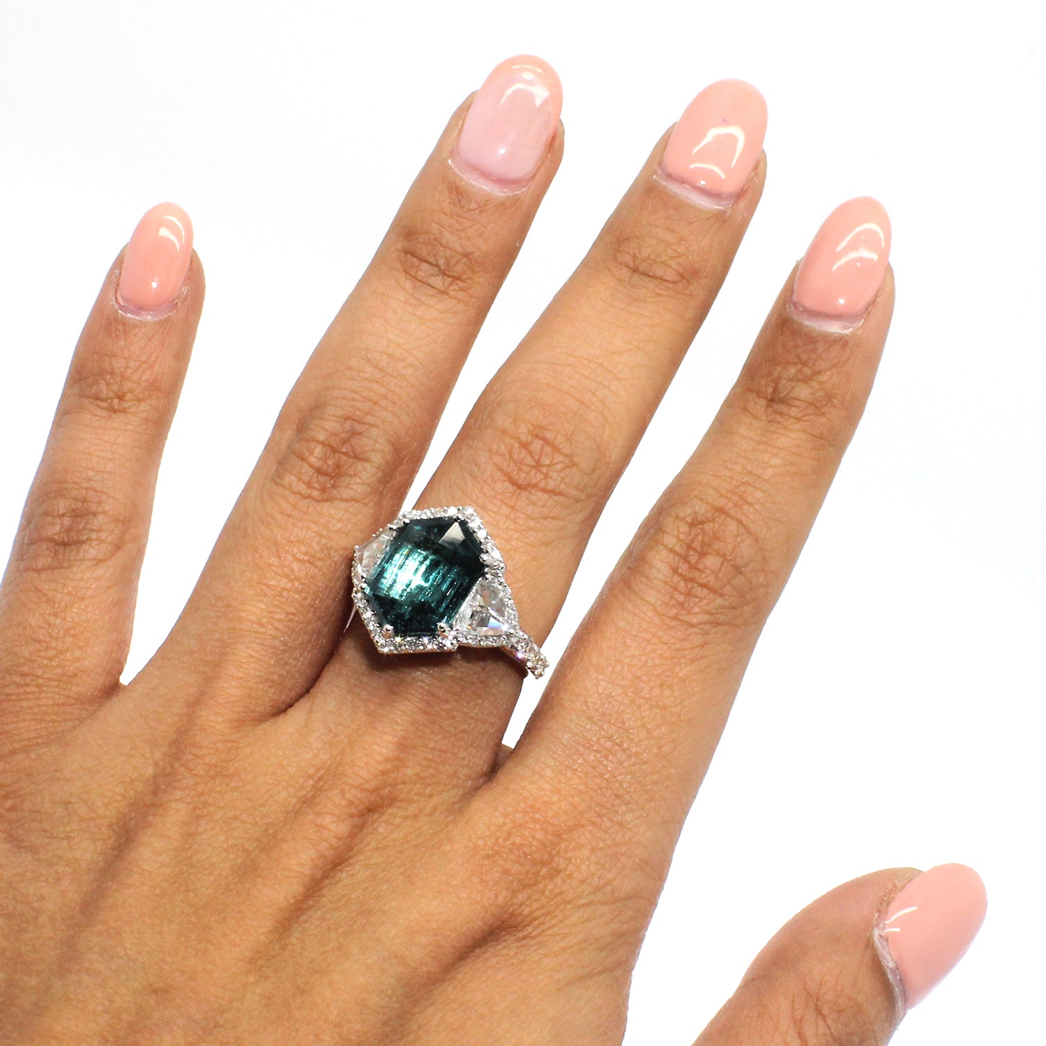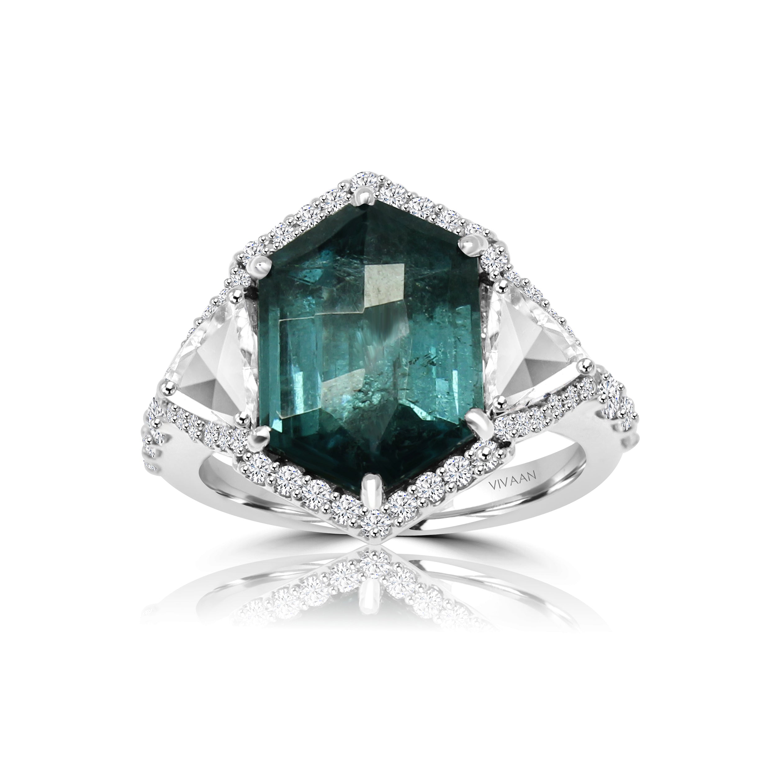 Cocktail ring featuring fancy shape mesmerizing Green Tourmaline with triangular Rose Cut Diamonds perfectly complimenting it. The Brilliant Cut Diamonds add a bling to this 18K White Gold ring.