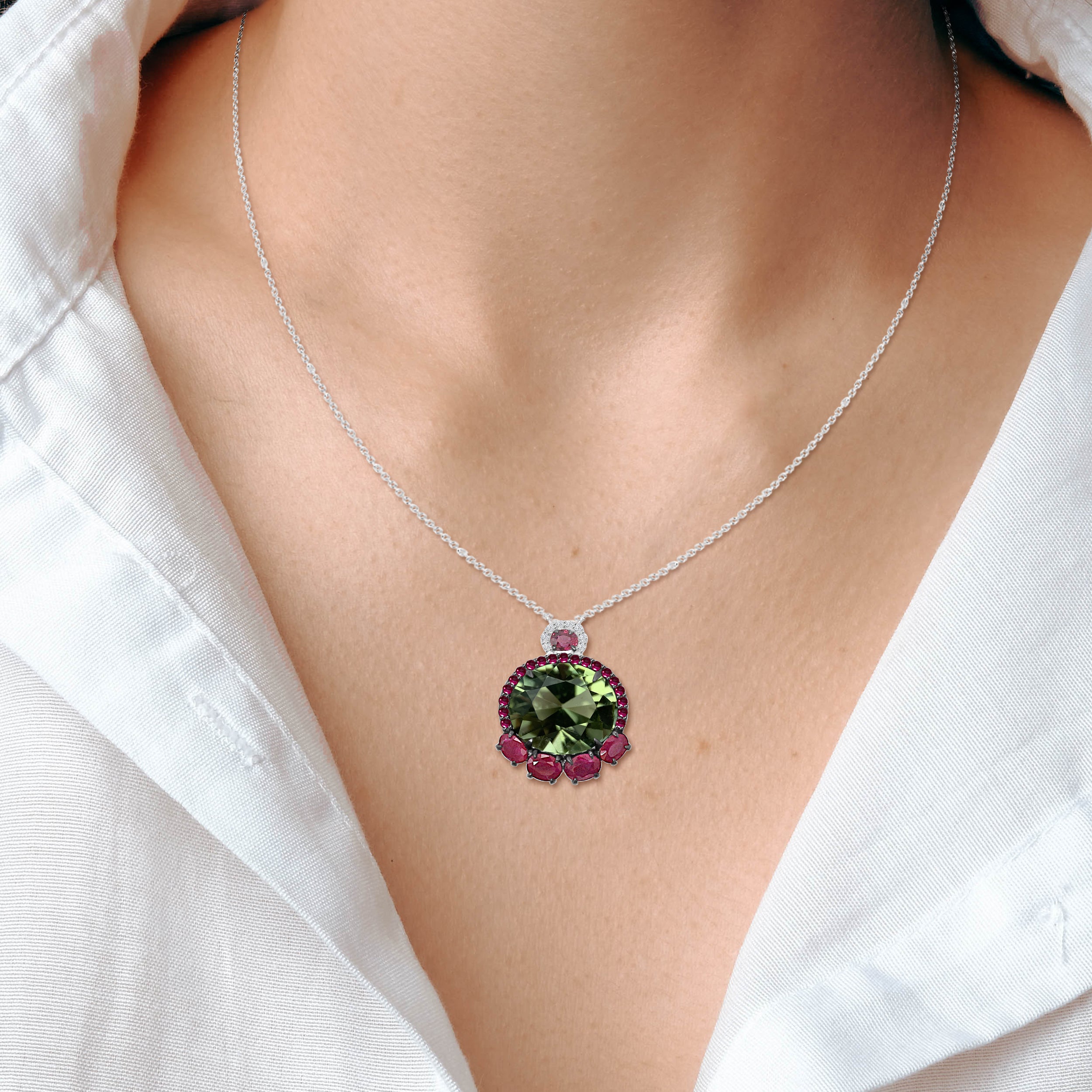 The Eden Bloom Green Tourmaline Pendant Necklace embodies understated beauty and refined craftsmanship. At its heart lies a sophisticated muted green tourmaline, exuding earthy charm and timeless allure. Accented by a vibrant ruby and shimmering diamonds, this elegant composition offers a captivating contrast of tones and textures.