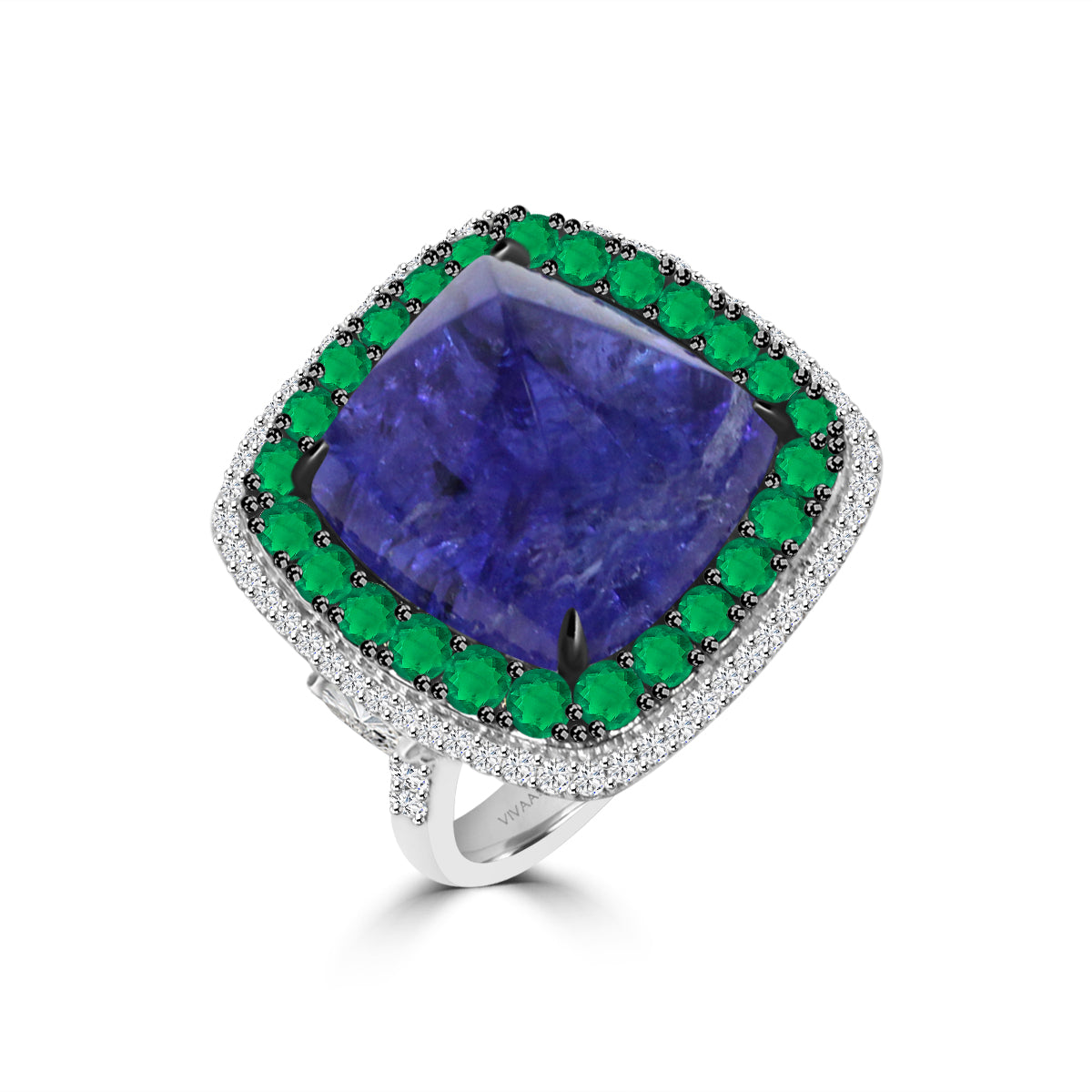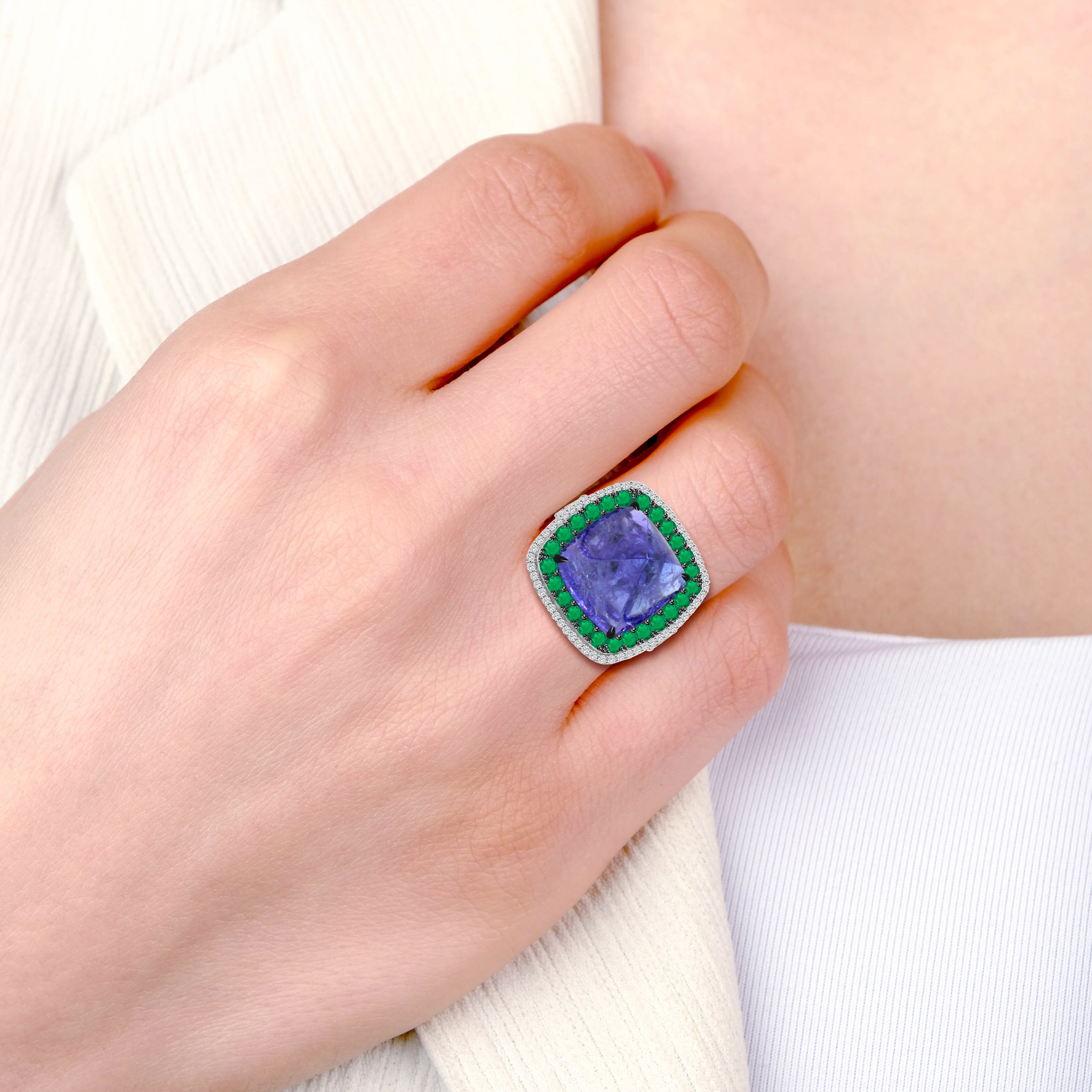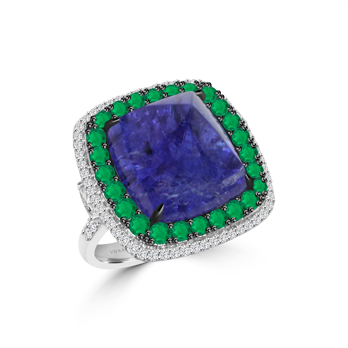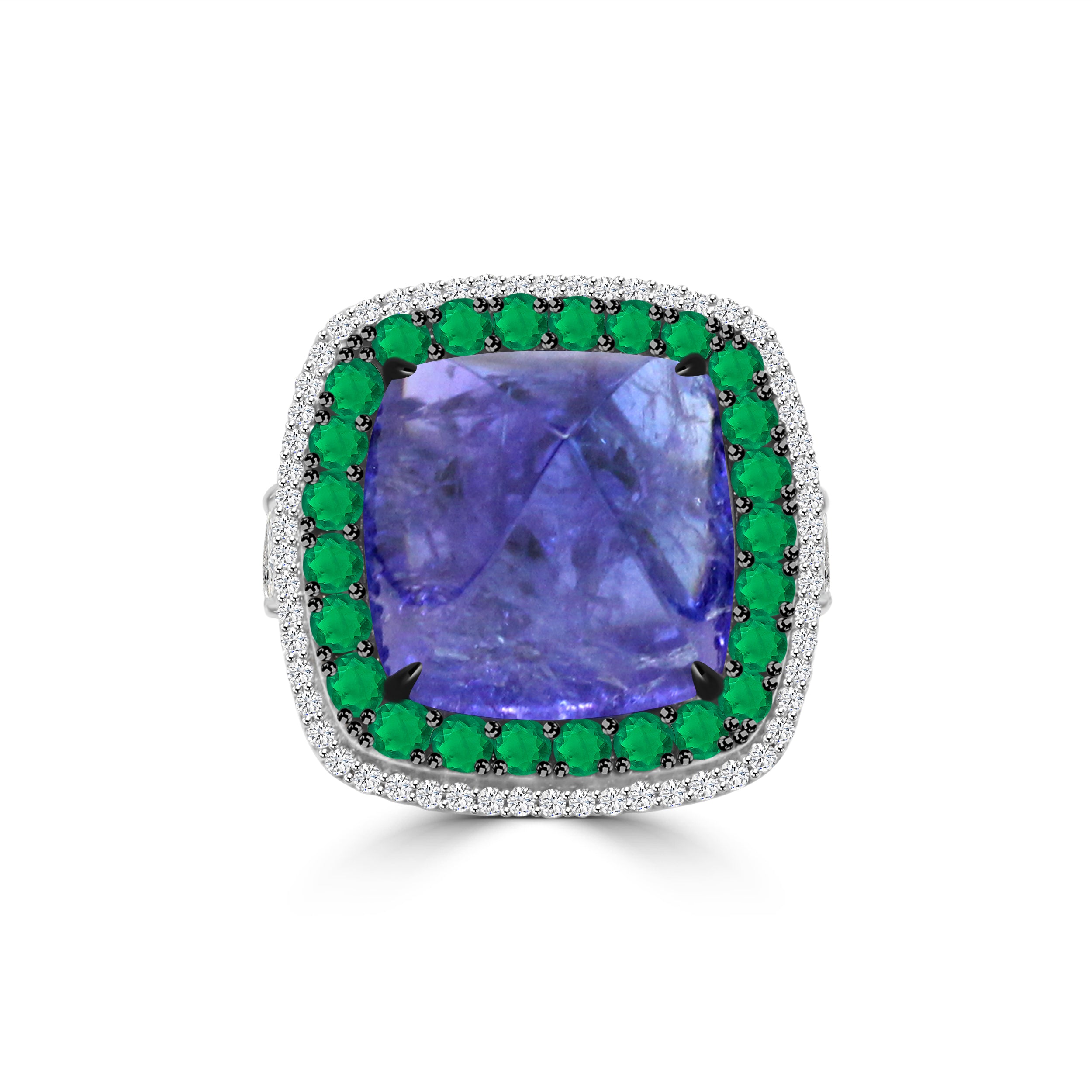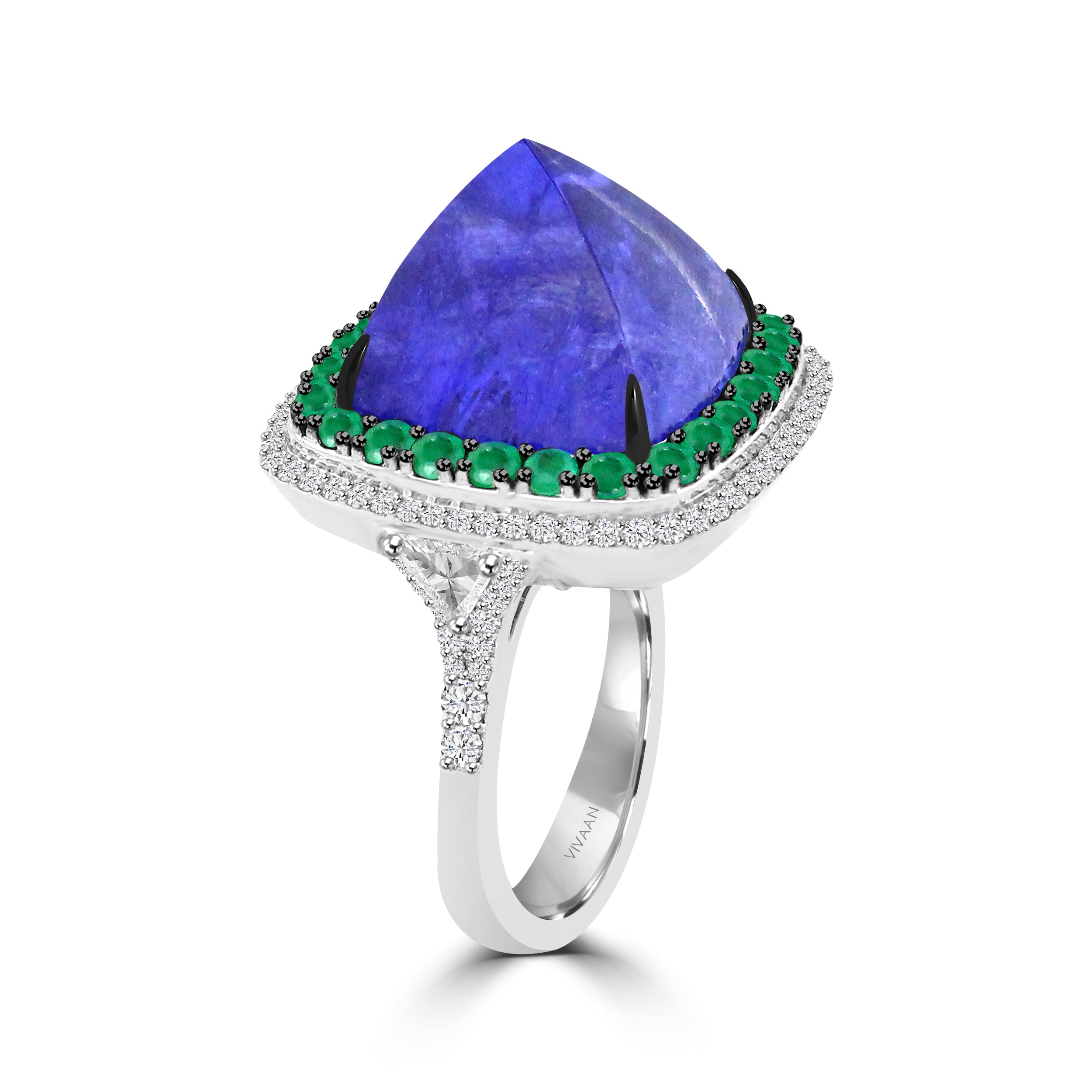 Experience the captivating beauty of our unique Tanzanite Ring, featuring a stunning pyramid shaped tanzanite accented with vibrant emeralds and brilliant diamonds. The design is further enhanced by trillion-cut diamonds on the sides, creating a sophisticated and dazzling effect. This ring combines vivid color and exceptional sparkle, making it a remarkable addition to any collection.