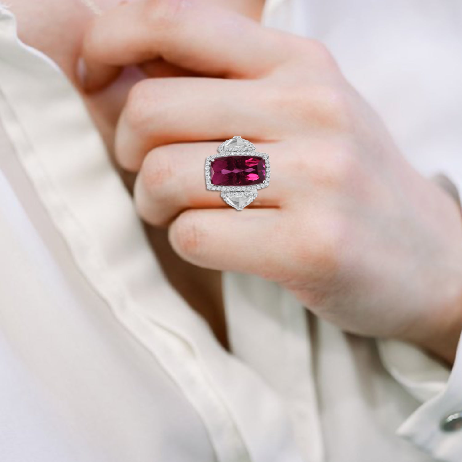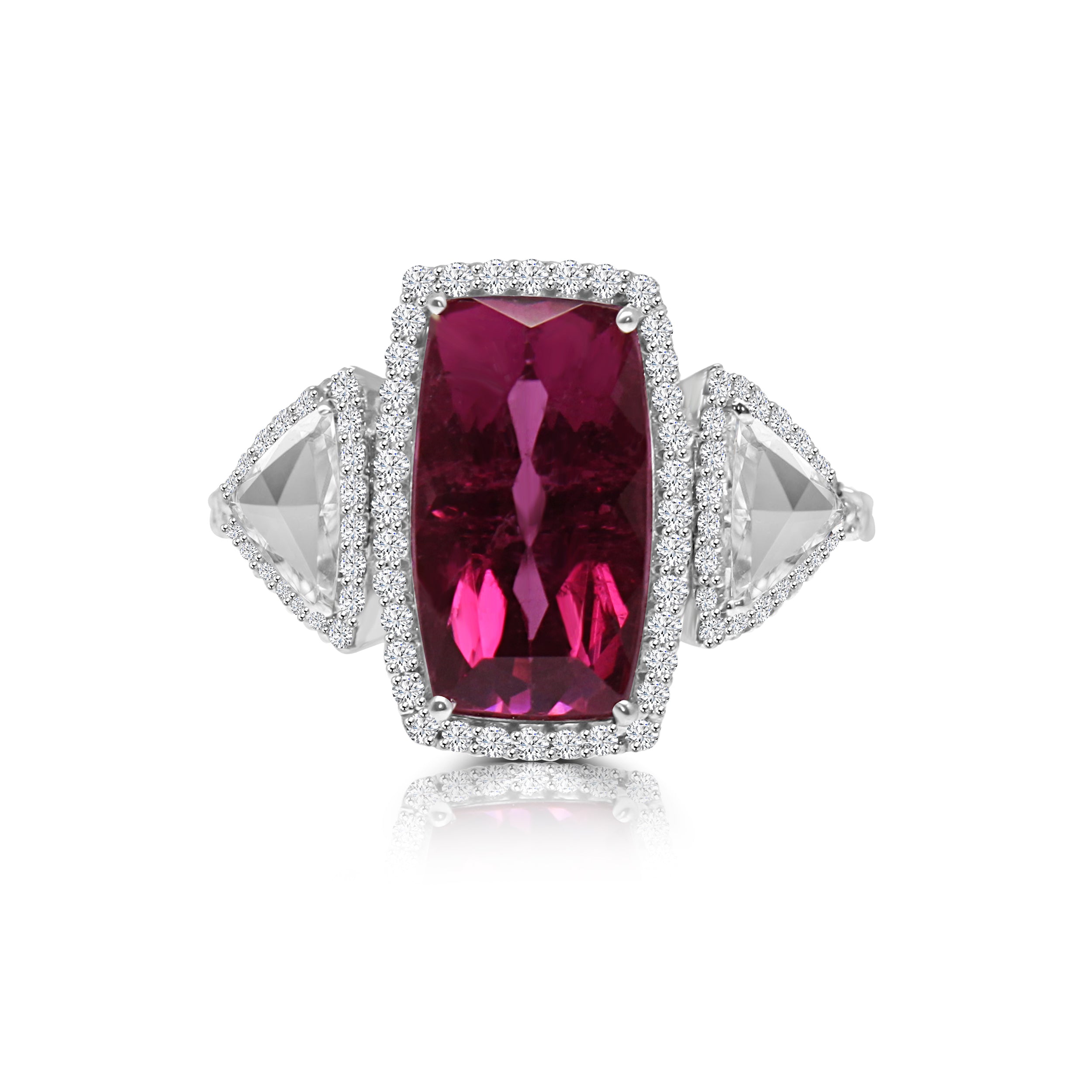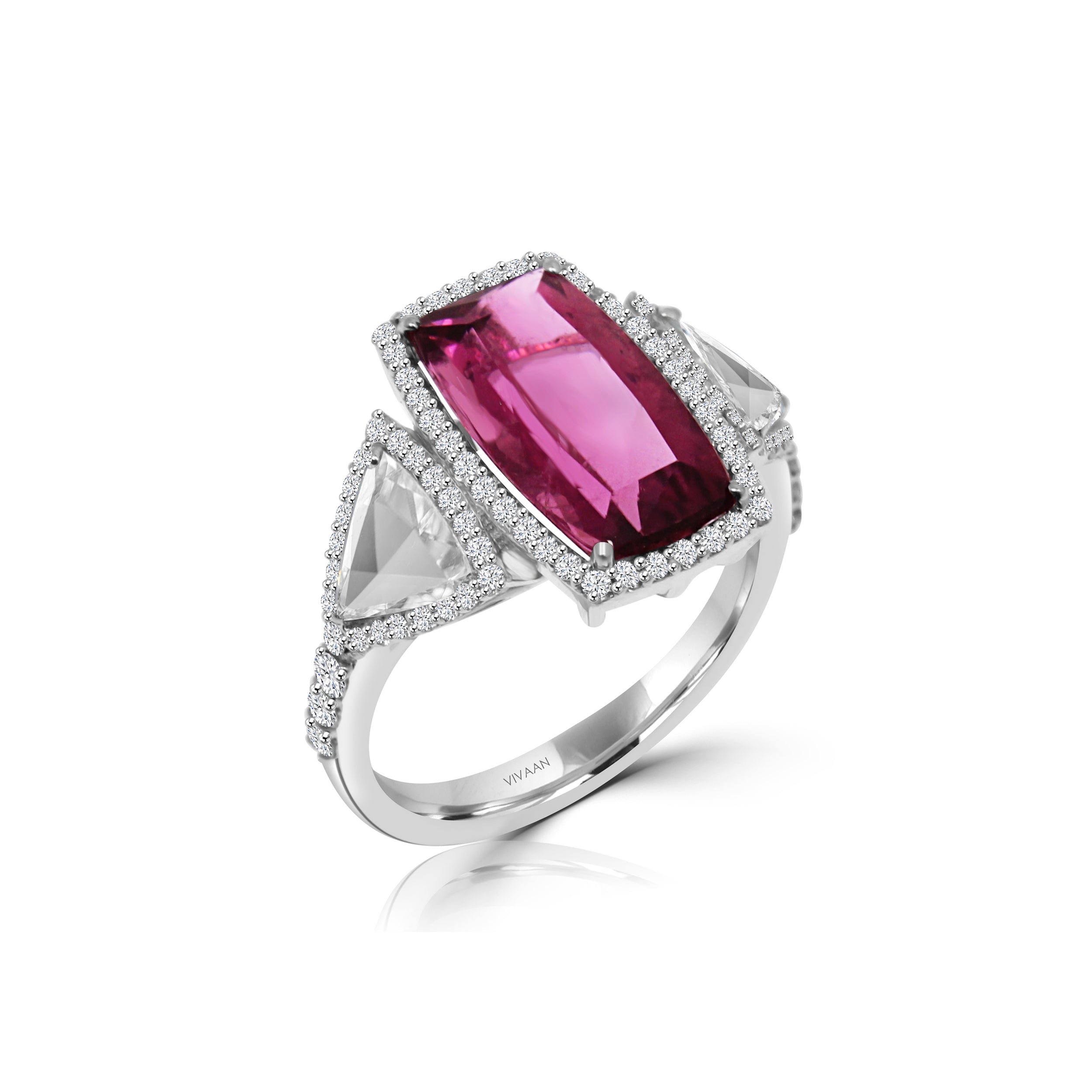 Statement ring featuring vibrant pink tourmaline surrounded with brilliant diamonds and complimented by triangle rose cut diamonds on sides.