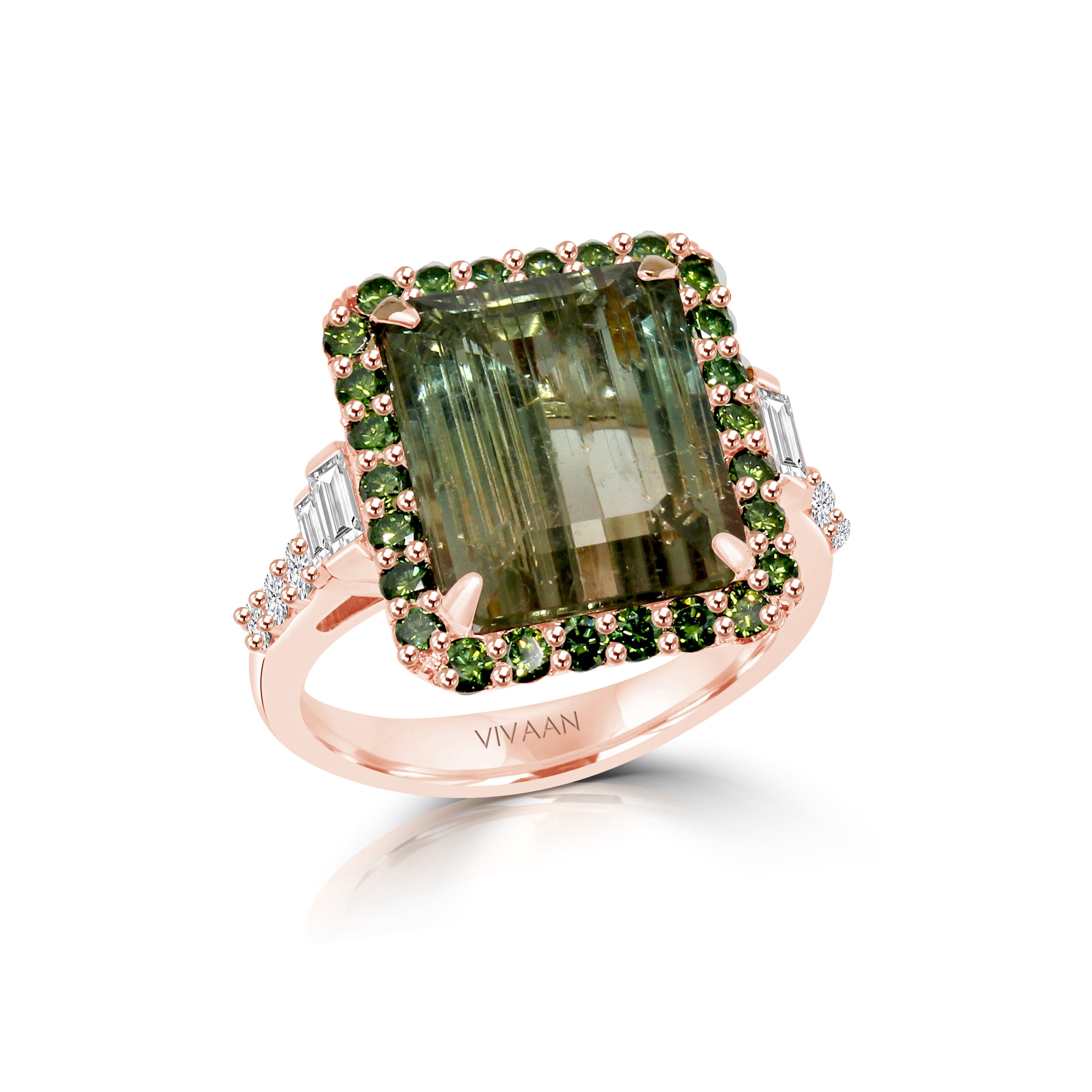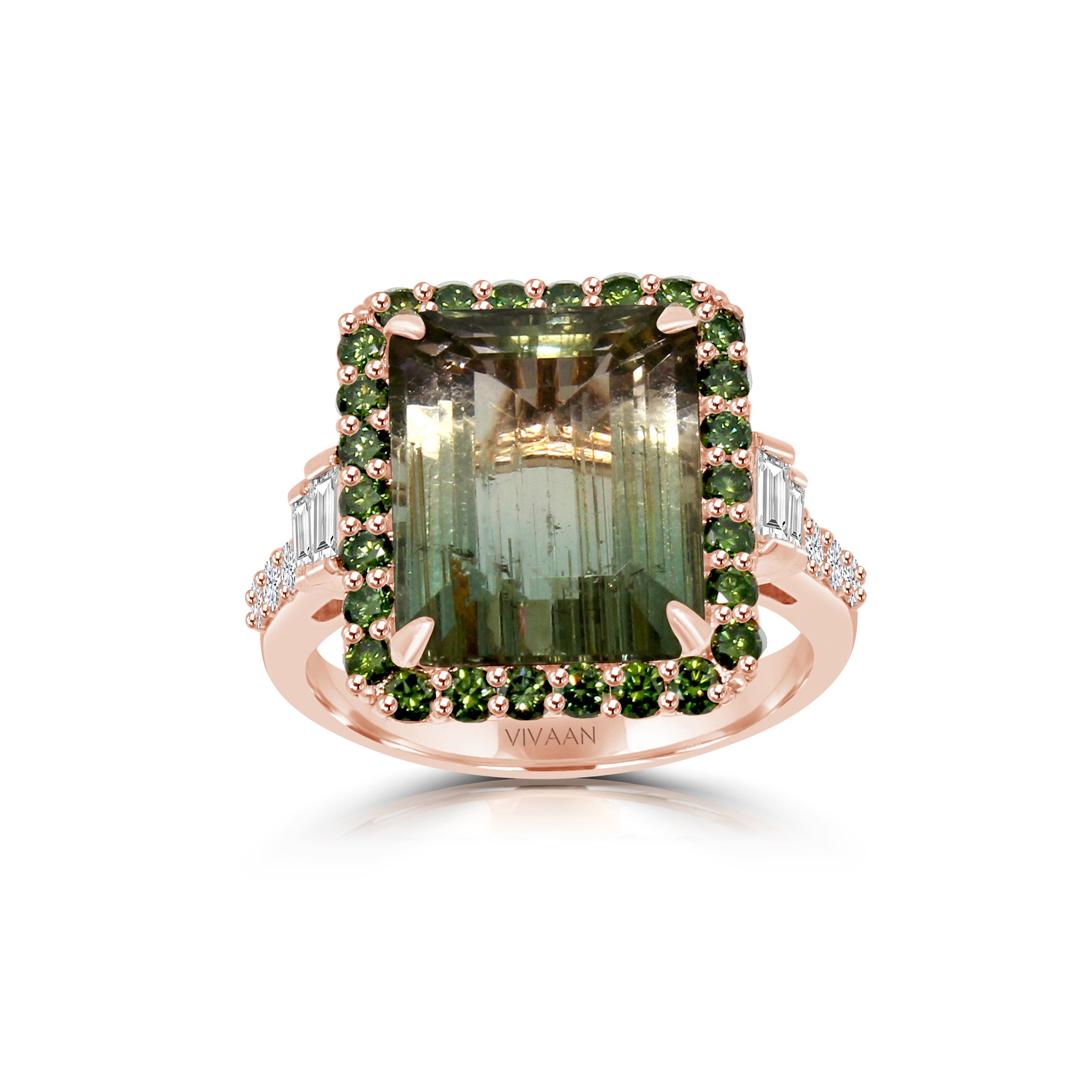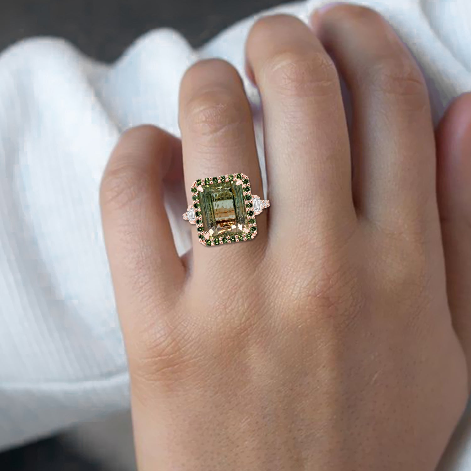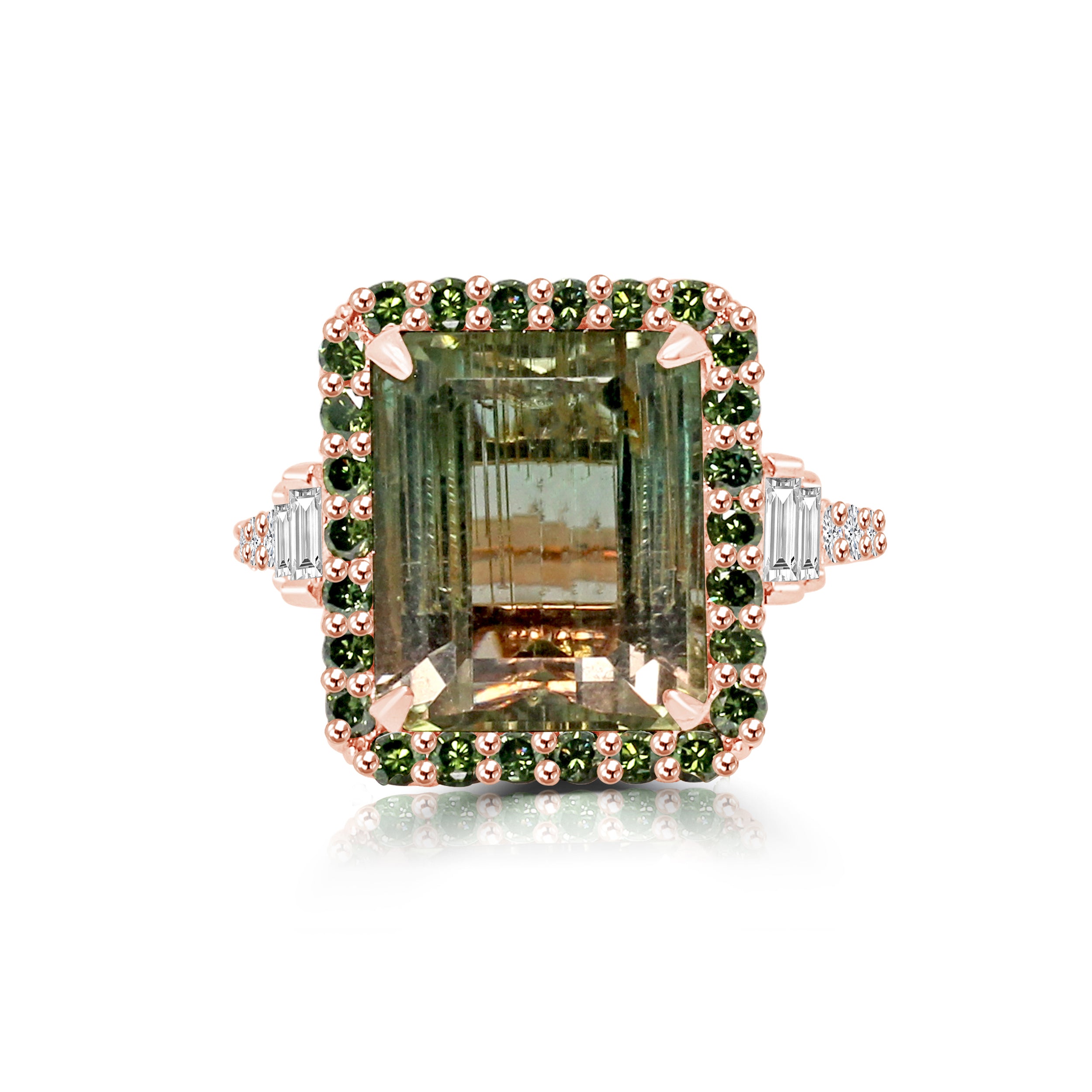 Tourmaline framed in blue diamonds accented with diamond baguettes and brilliant diamonds set in 18k Rose Gold.