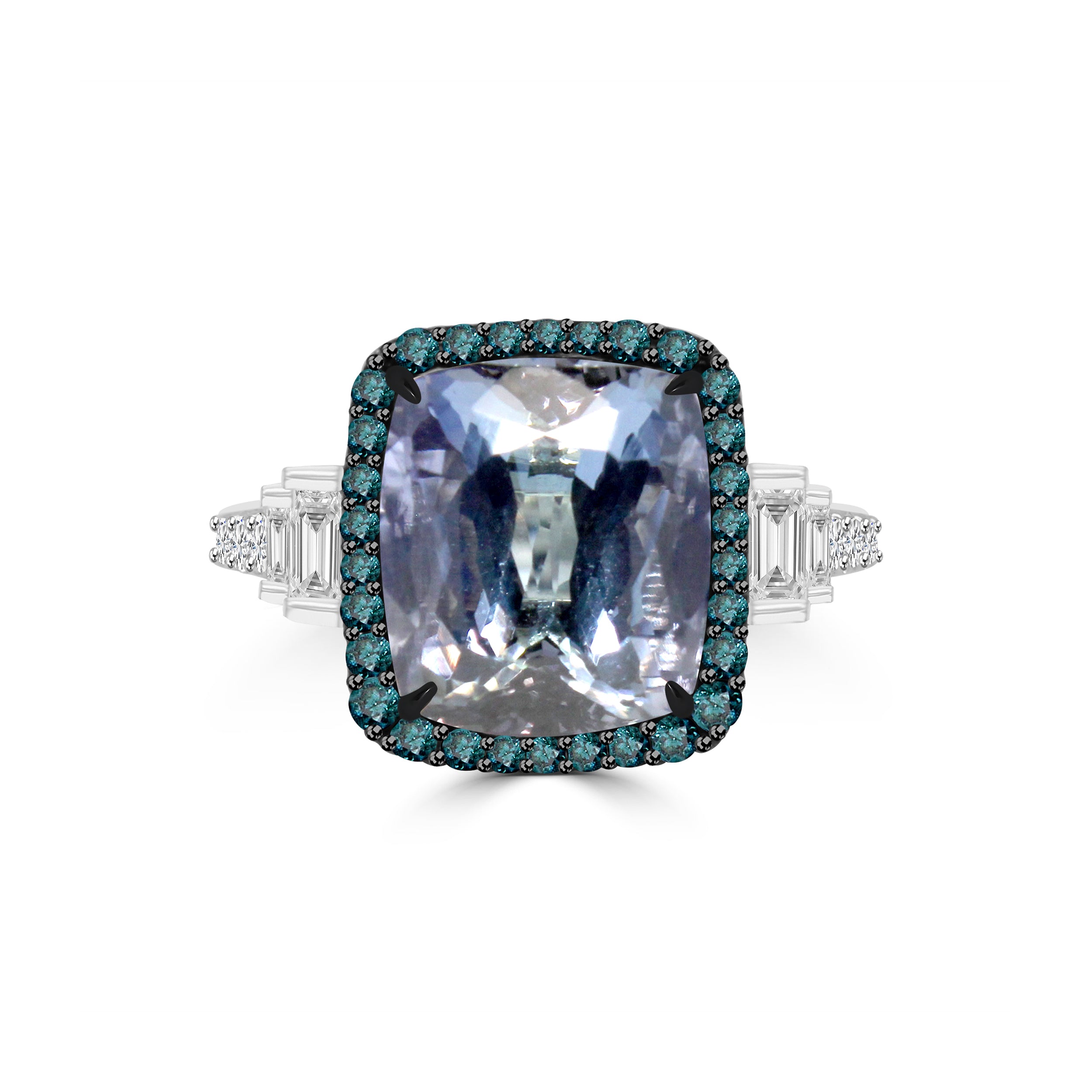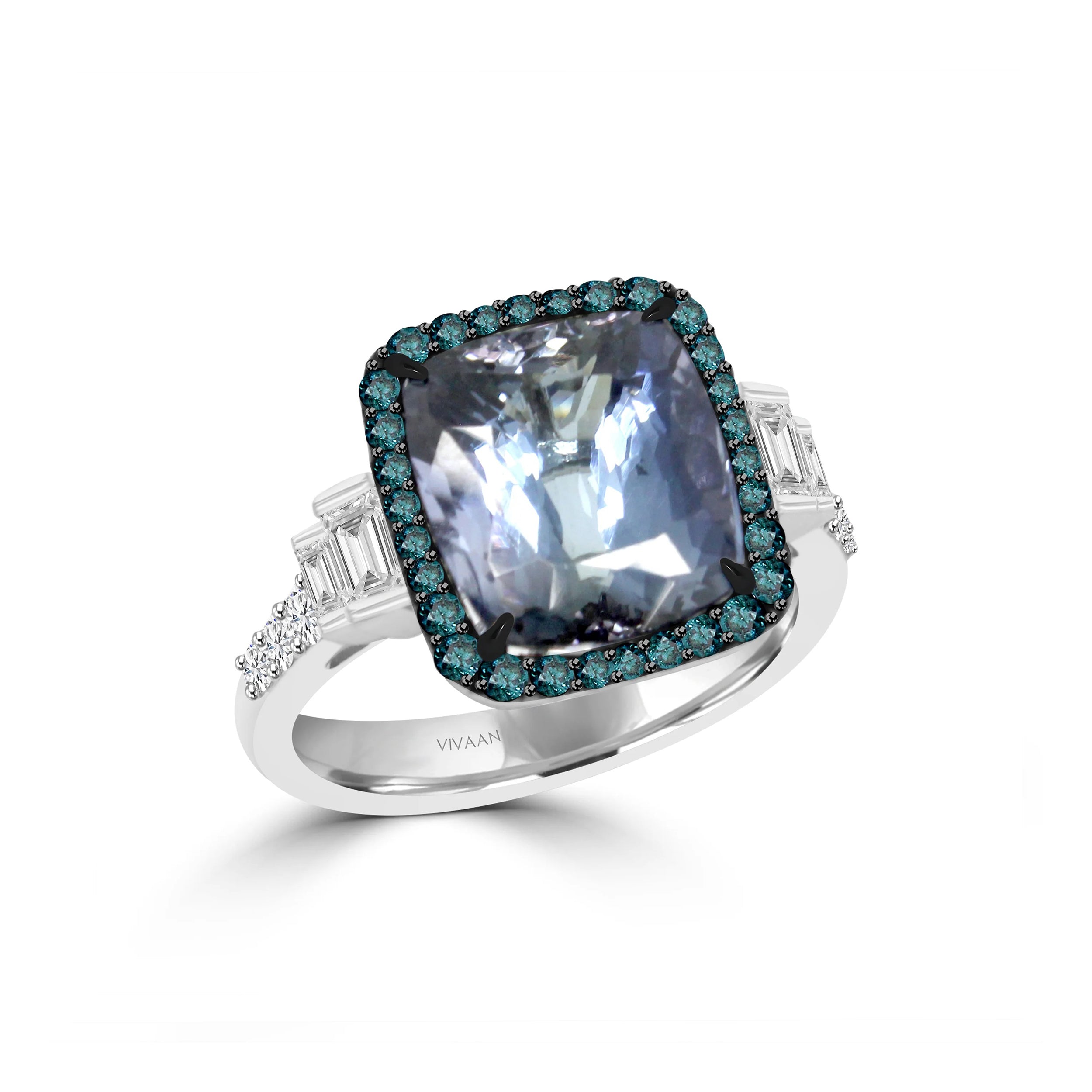 The JUNIPER ring is a timeless expression of elegance and grace. At its center, a captivating tanzanite exudes depth and brilliance, encircled by a halo of enchanting blue diamonds. The shank is adorned with a perfect balance of white brilliant-cut and baguette diamonds, adding layers of sparkle and refinement. Set in luxurious 18K white gold, this masterpiece is designed to dazzle from every angle.