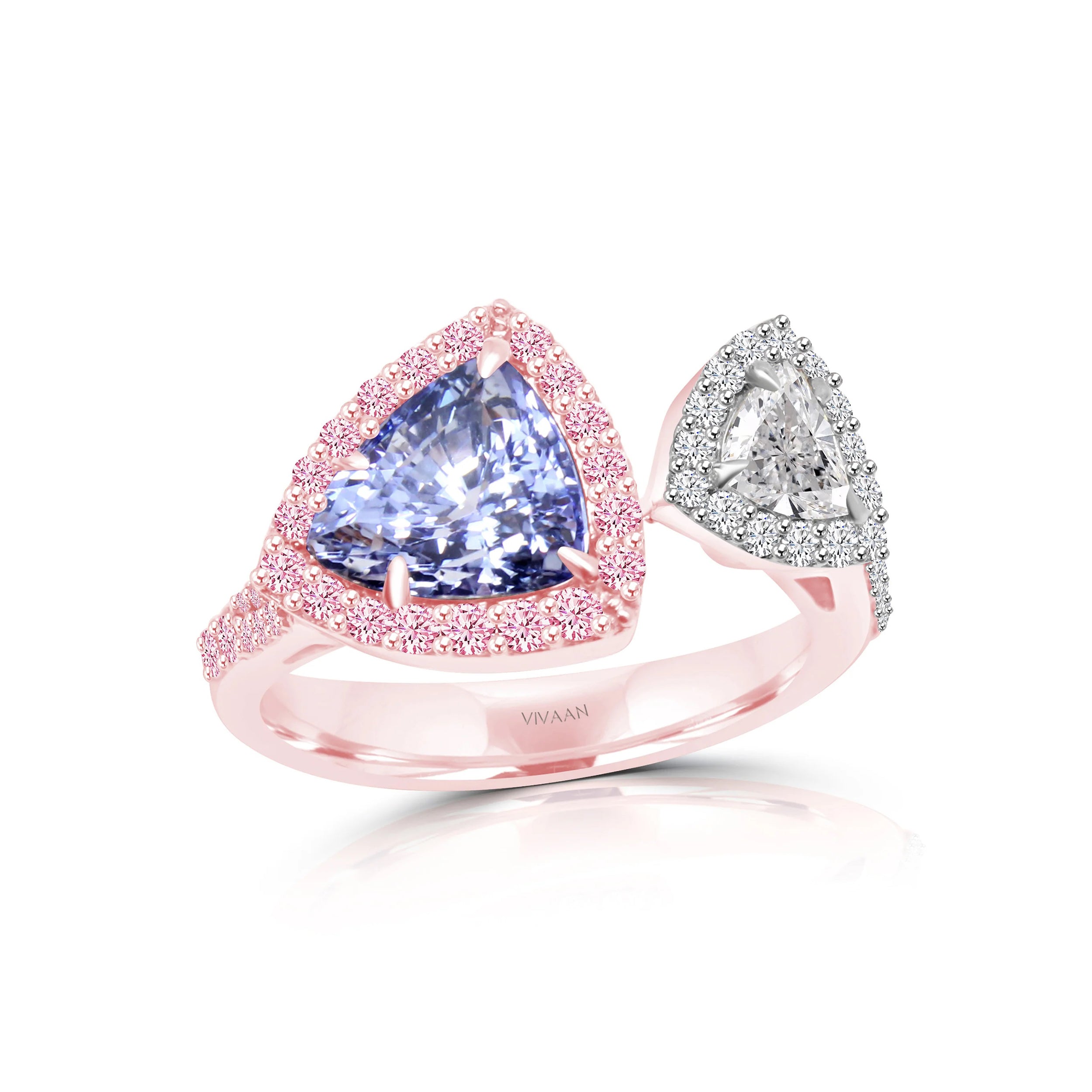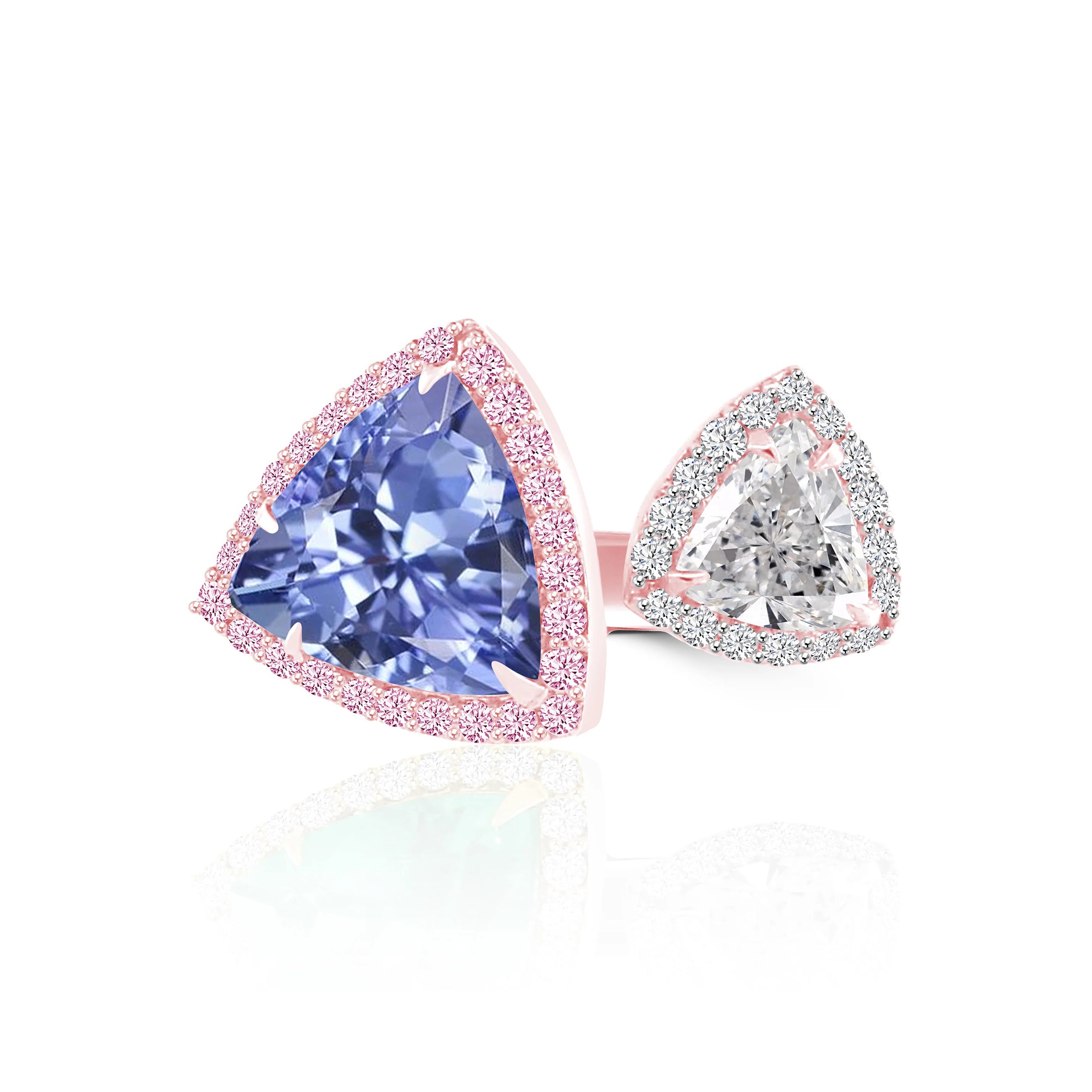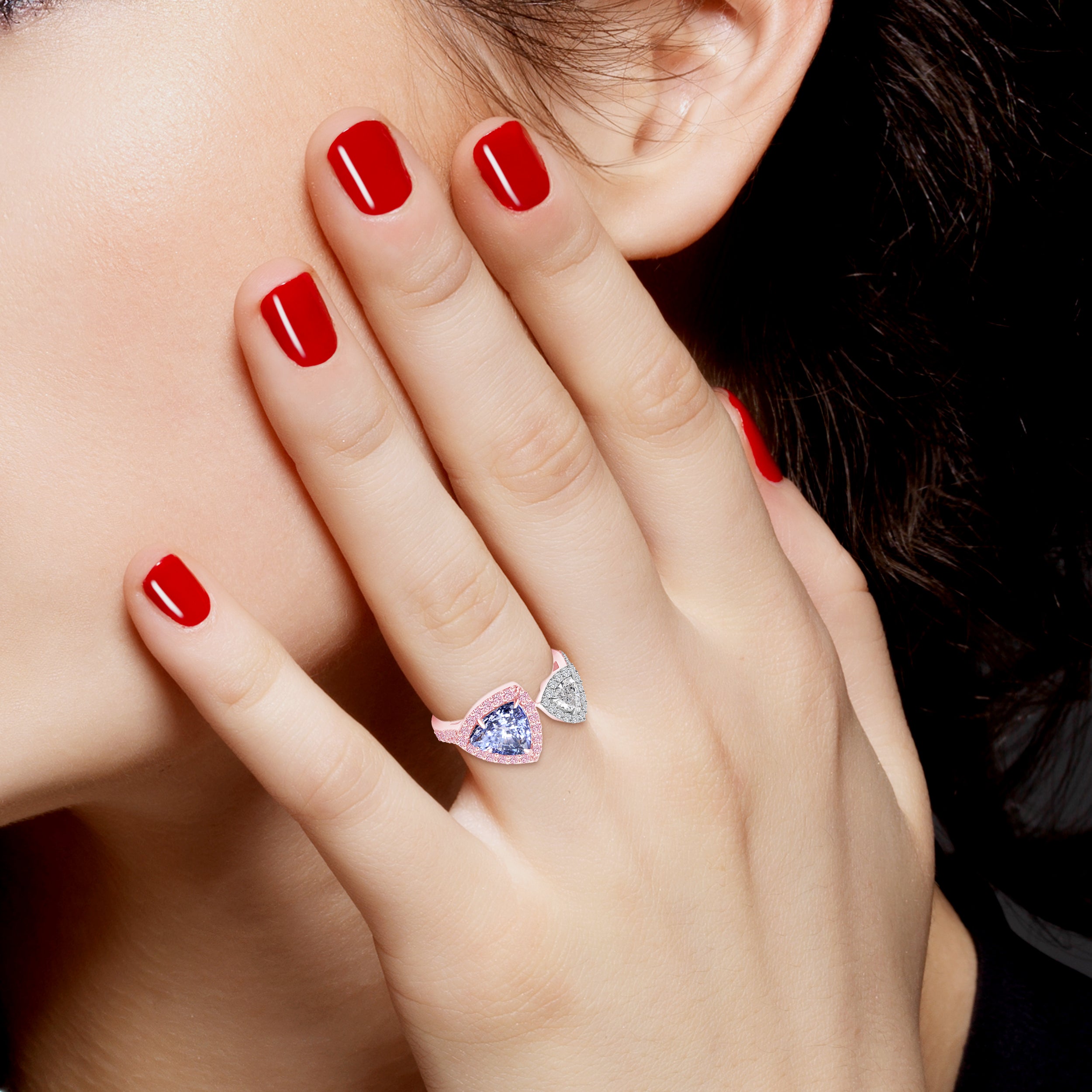 This exquisite Toi-Moi ring features a stunning tanzanite complimented with fancy-shaped diamond. The design is further enriched with natural pink diamonds and brilliant diamonds, creating a harmonious blend of vibrant colors and exceptional sparkle. This luxurious piece beautifully combines the deep blue hues of the tanzanite with the delicate pink and brilliant diamonds, resulting in a captivating and elegant design.
