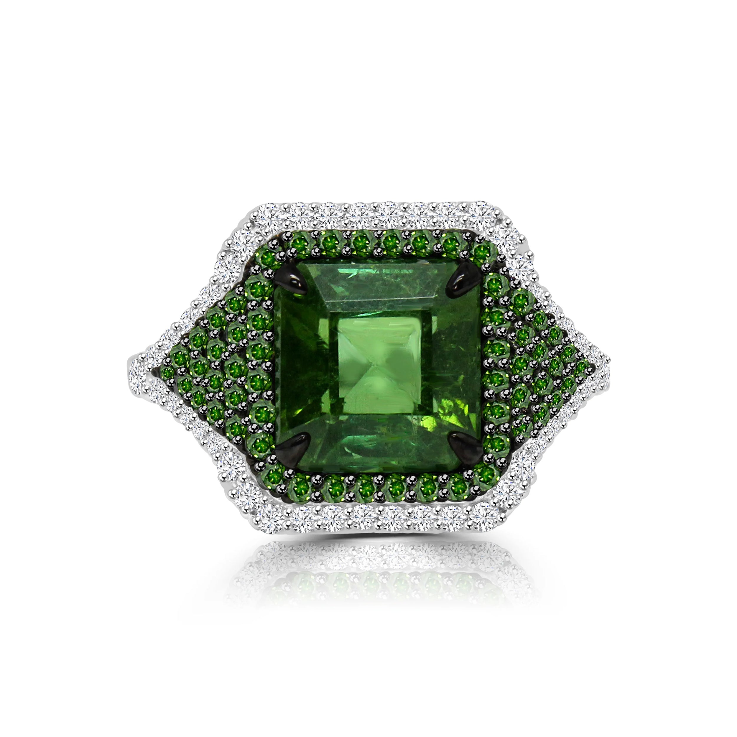 Make a bold statement with LIME - a daring green tourmaline cocktail ring surrounded by green diamonds and accented with brilliant diamonds, that challenges you to take risks and live life to the fullest. Step out of your comfort zone with this perfect blend of green and white diamonds set in 18K white gold. Feel the energy and live life on the edge with LIME.