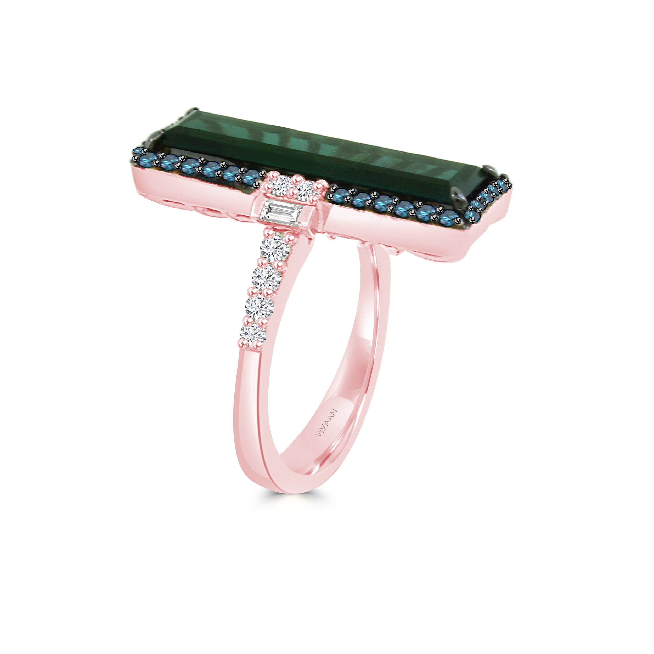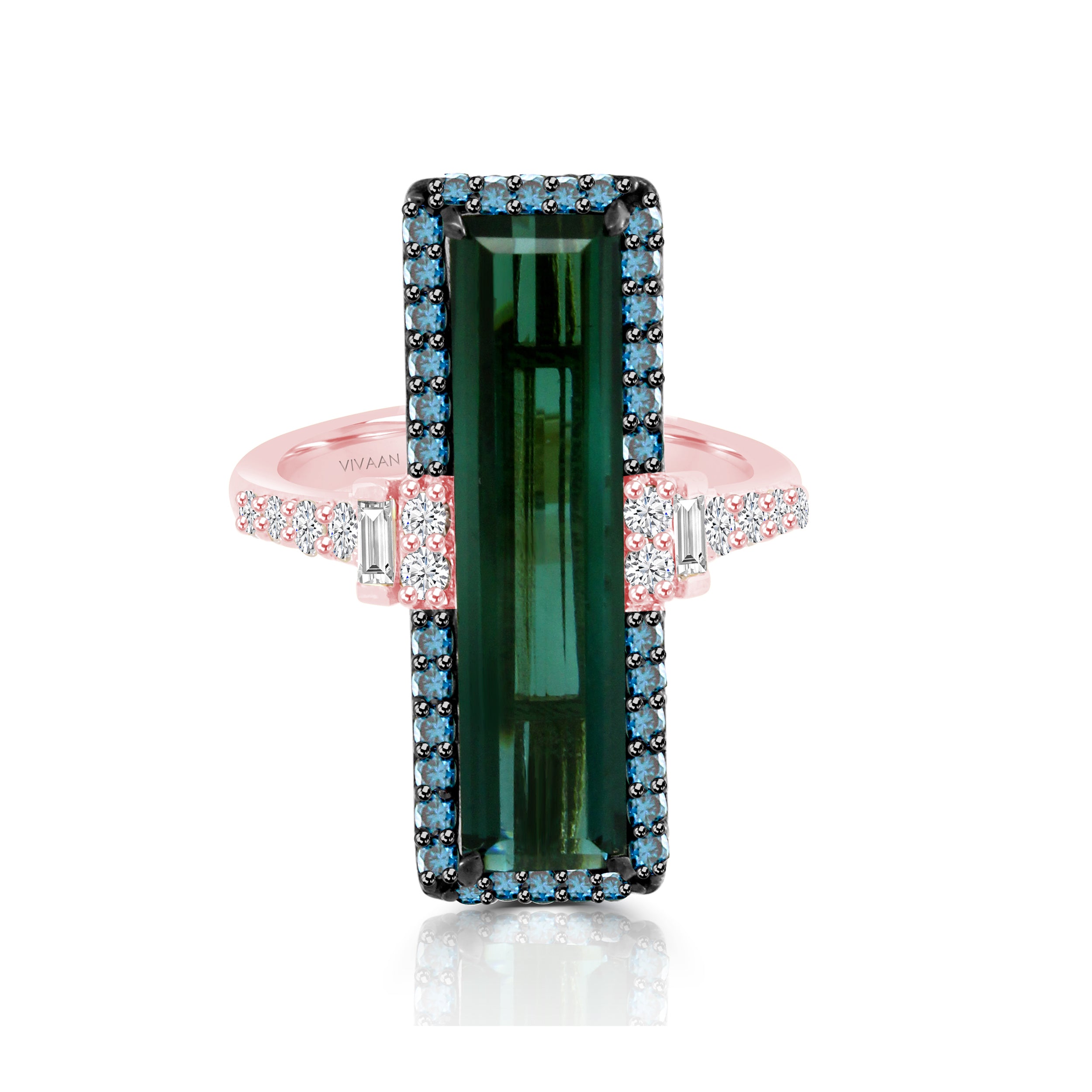 Adorn your finger with a MABEL ring and sparkle like a dream! Crafted with 18K gold, this beautiful piece features a bright green tourmaline surrounded by a halo of brilliant pink baguette diamonds and a treated blue diamond. Treat yourself—you deserve it!