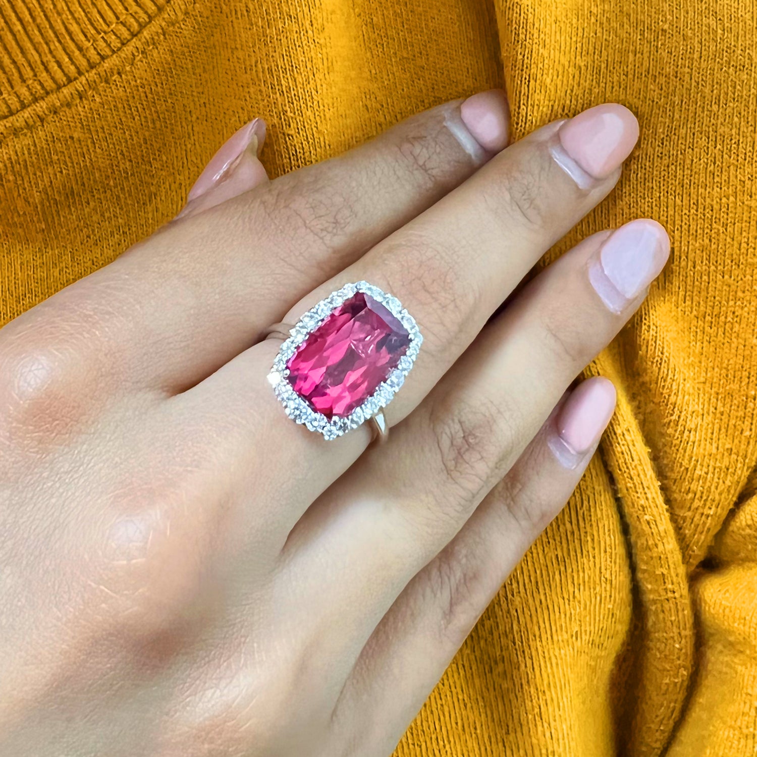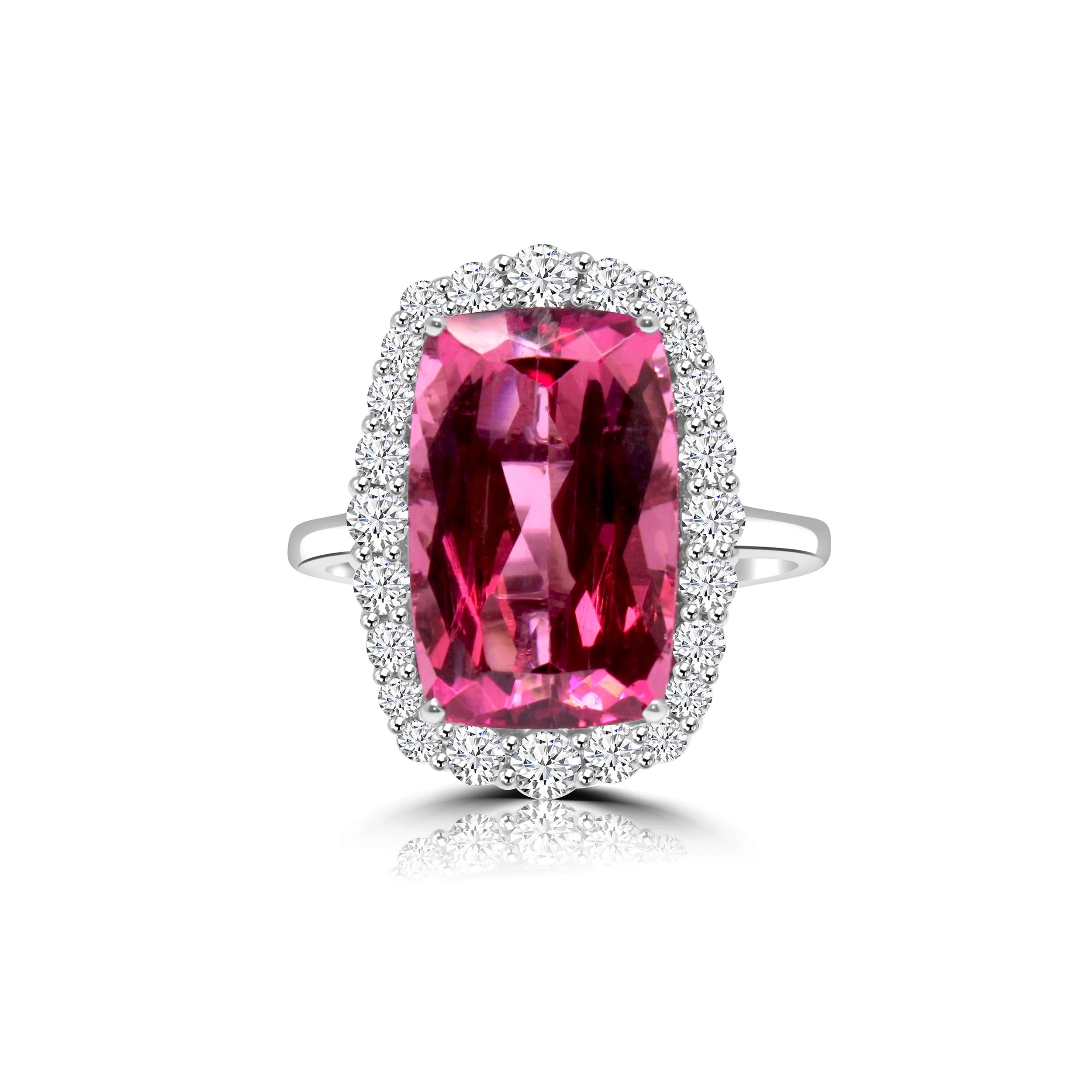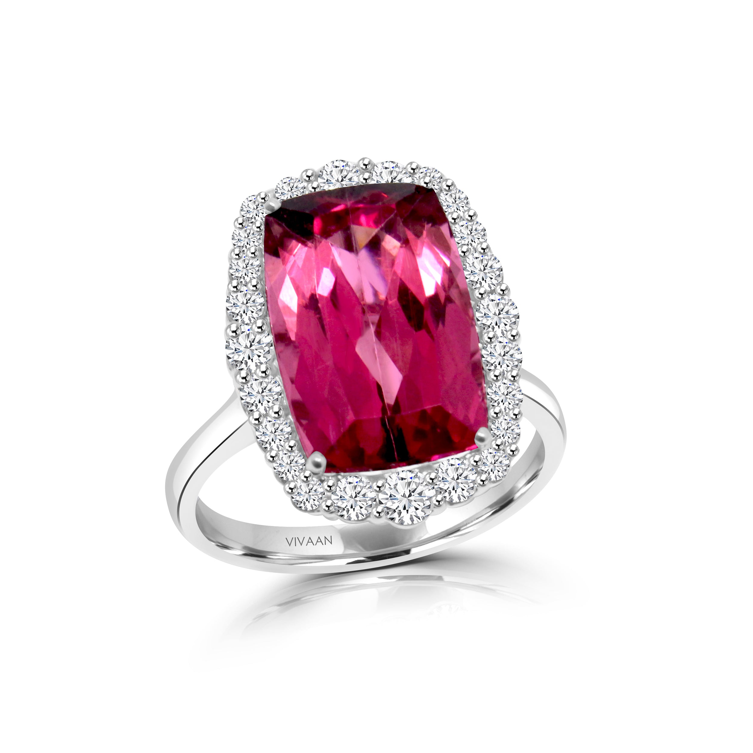 Vibrant Pink Tourmaline beautifully framed in Brilliant Diamonds and set on a 18K White Gold Ring.