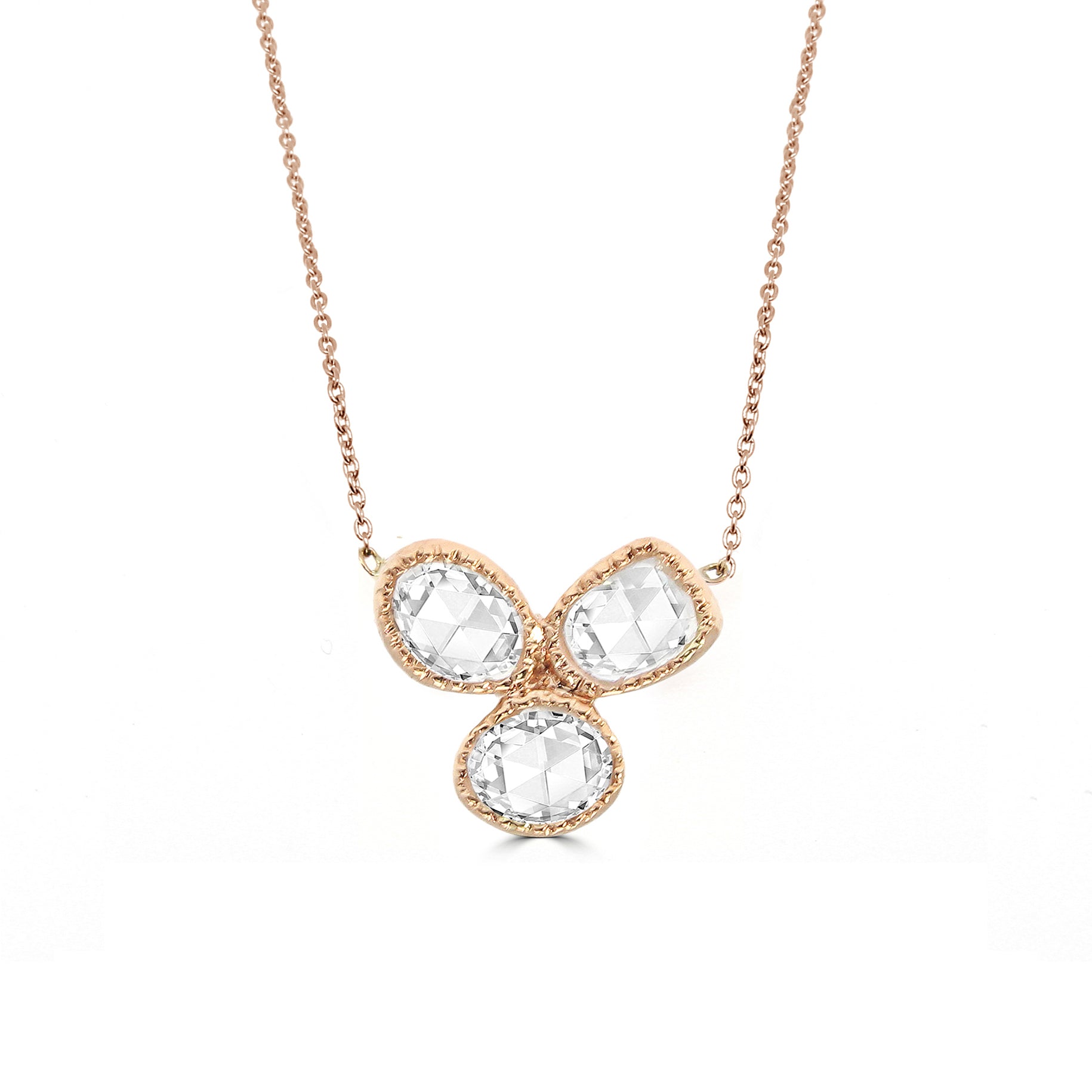 Romantic and timeless, this three-petal flower MAYA necklace is a delicate celebration of beauty and grace. Each petal is adorned with a softly glowing rose-cut diamond, elegantly set in a warm 18K rose gold bezel. Fine milgrain detailing traces the edges, adding vintage-inspired charm and intricate texture to the design. Suspended from a slender chain, this floral pendant exudes softness, sparkle, and feminine sophistication—perfect for everyday elegance or a touch of refined romance.