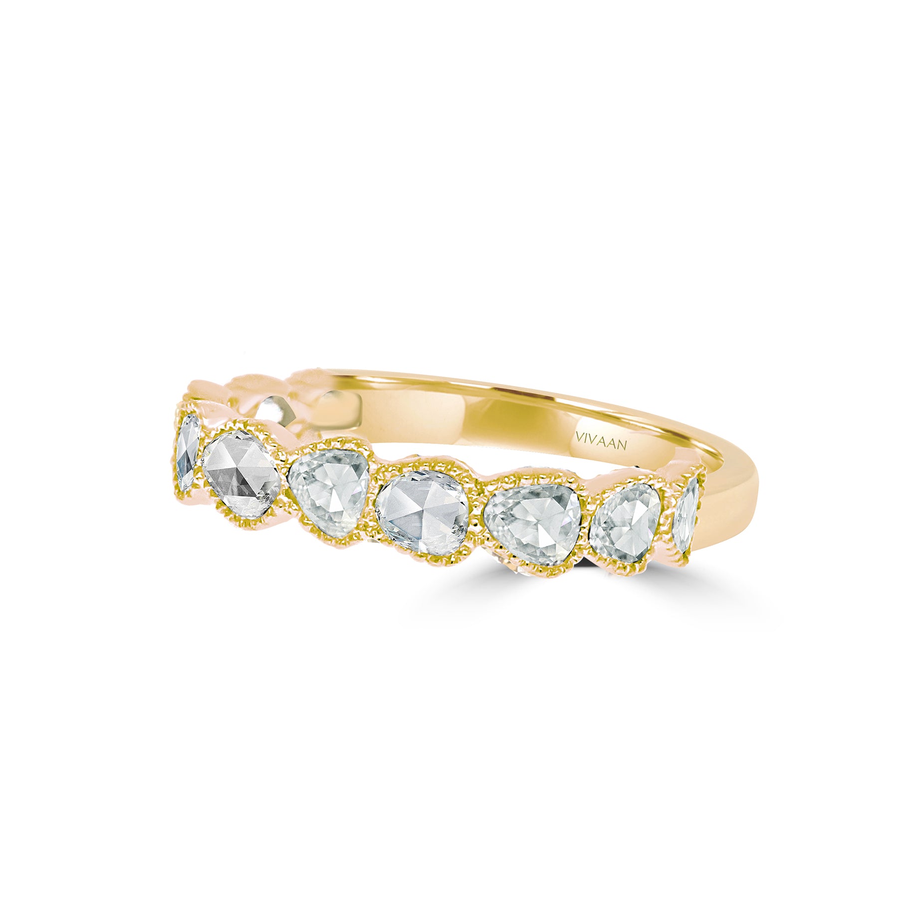 Radiating vintage charm and golden warmth, this exquisite MAYA ring showcases a harmonious arrangement of mixed-shape rose-cut diamonds, delicately set halfway along the band. Each diamond is encased in a rich 18K yellow gold bezel, with fine milgrain detailing tracing the edges—adding texture, elegance, and a timeless touch. The soft sparkle of the rose-cut diamonds pairs beautifully with the intricate craftsmanship, making this ring a graceful standalone piece or a romantic addition to any stack.