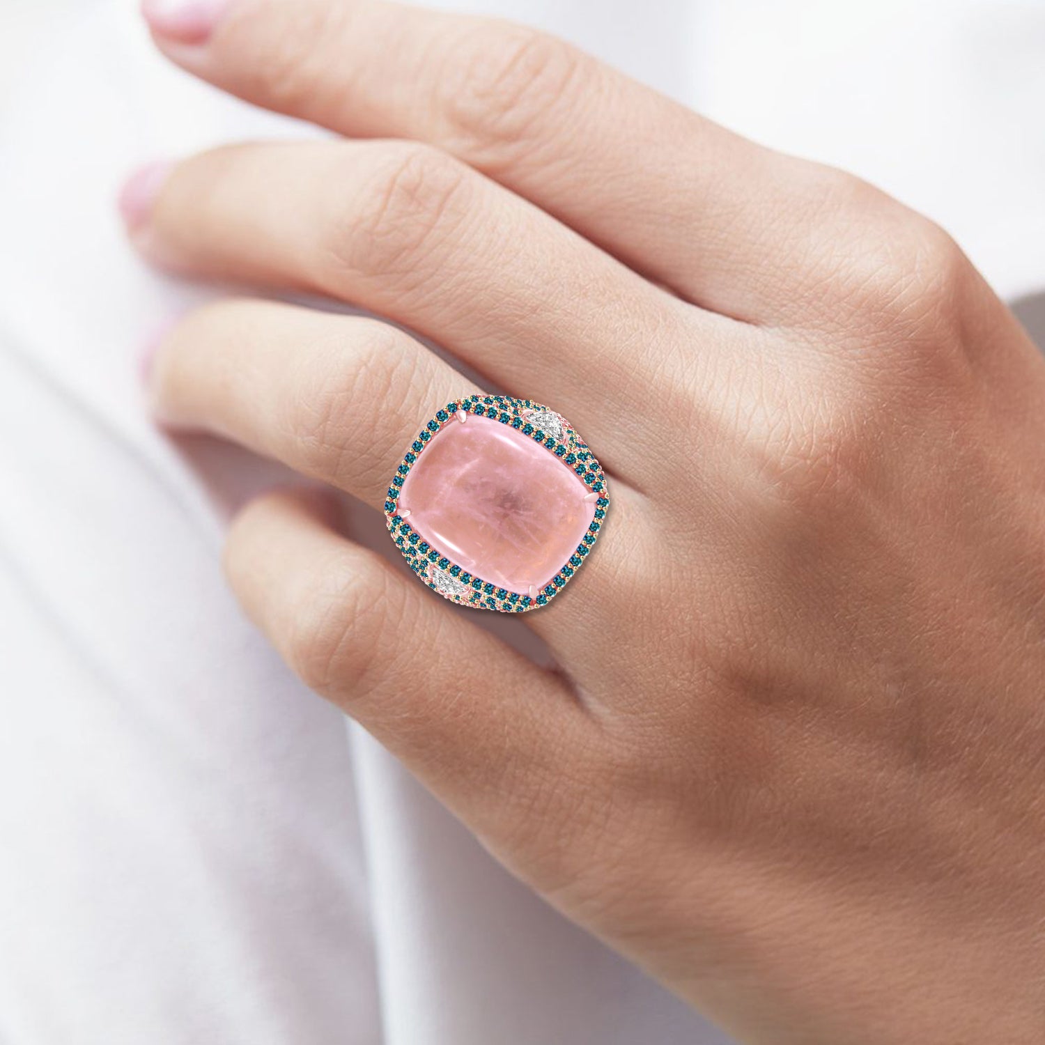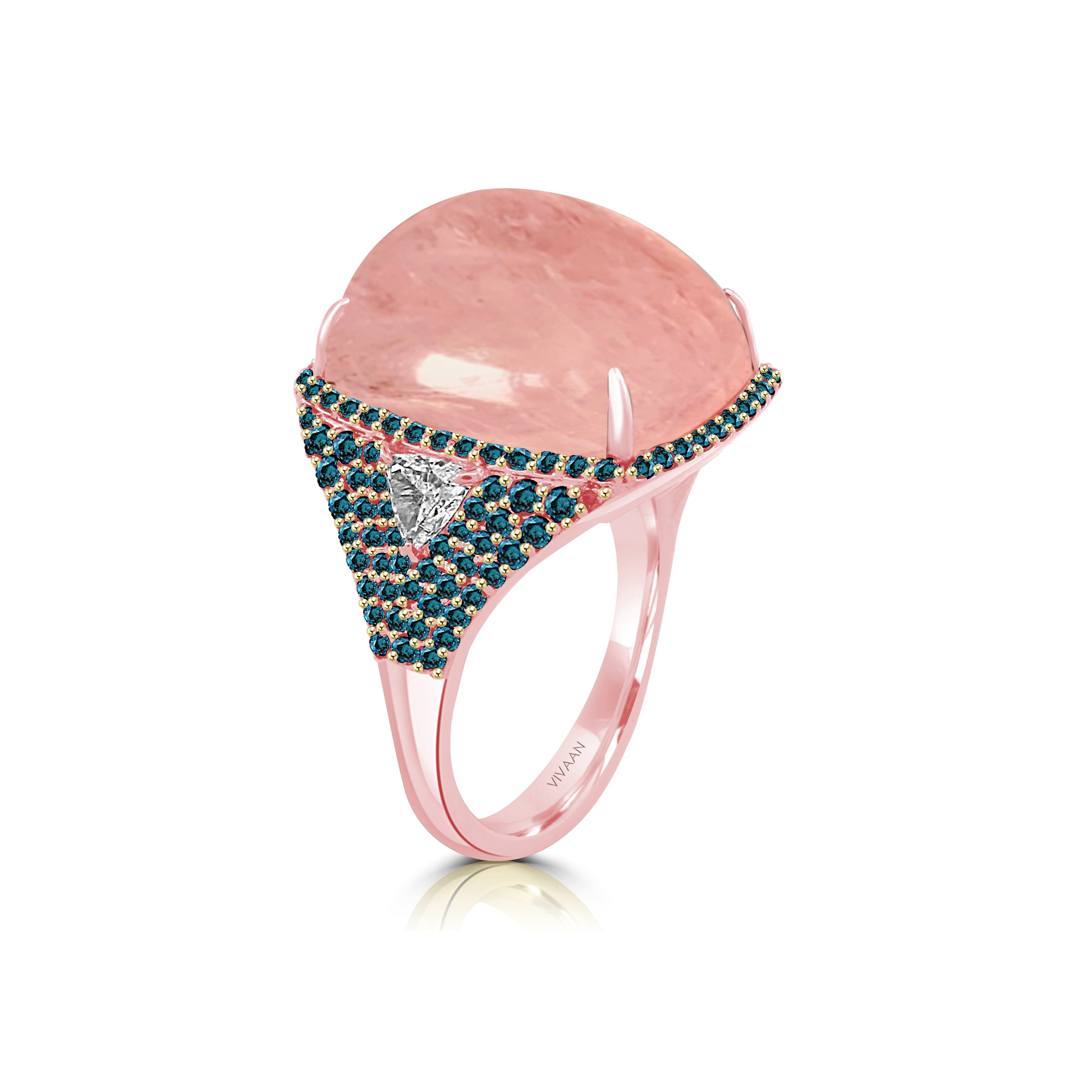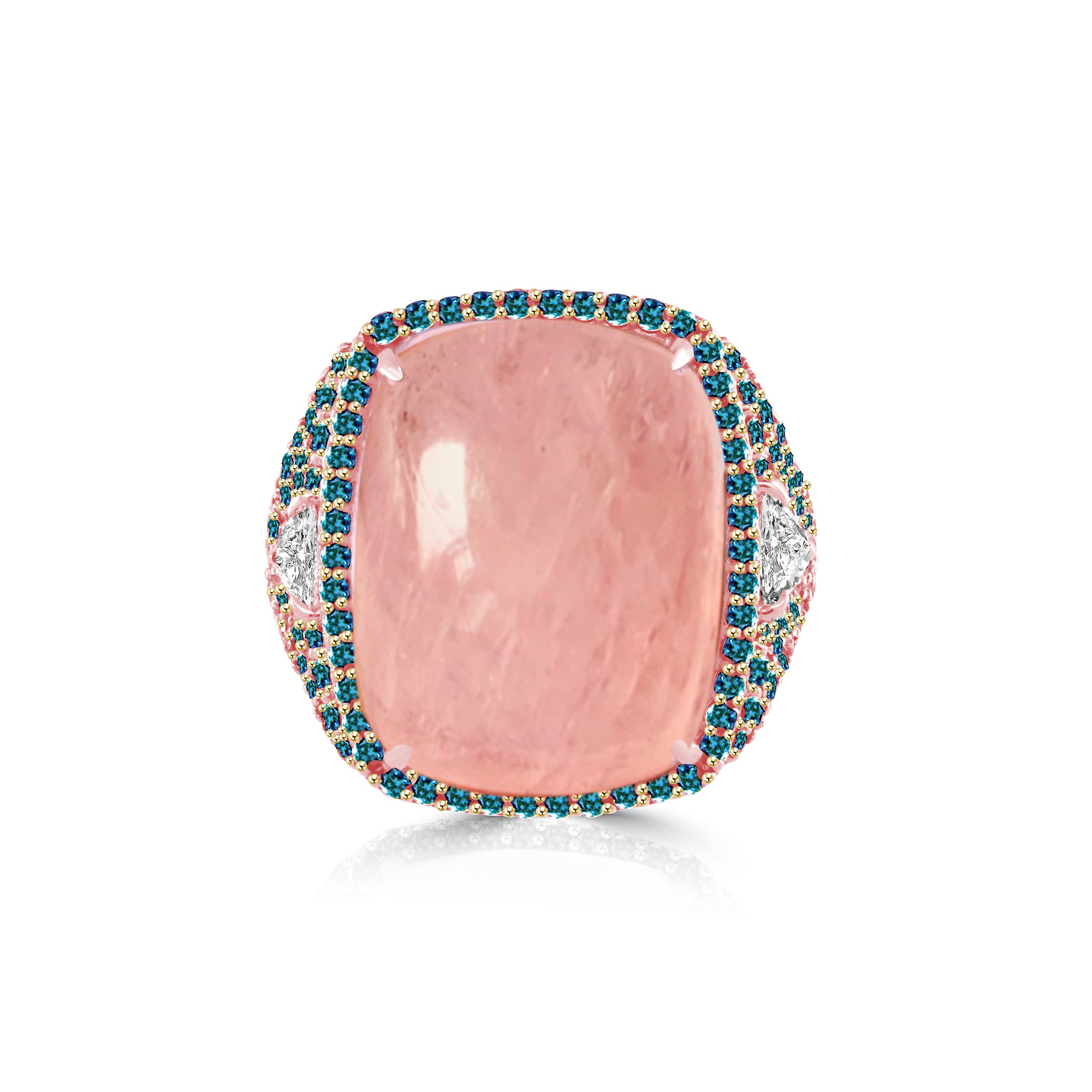 This ELIS ring is like a shot of sunshine for your finger! Crafted with an eye-catching cabochon morganite centerpiece and dazzling trillion and blue diamond accents, set it 18K yellow gold for a modern, exquisite design. Get ready to sparkle and shine!