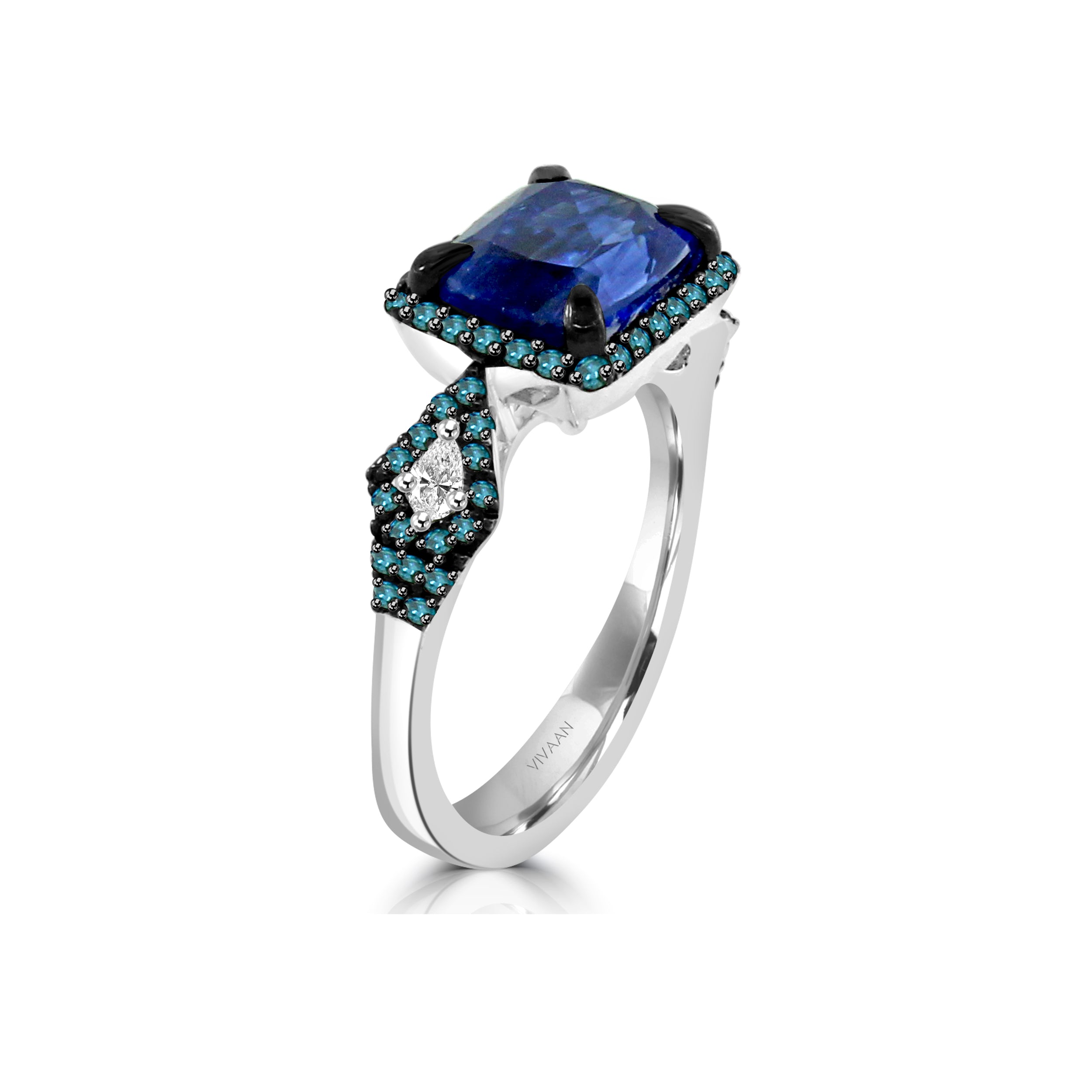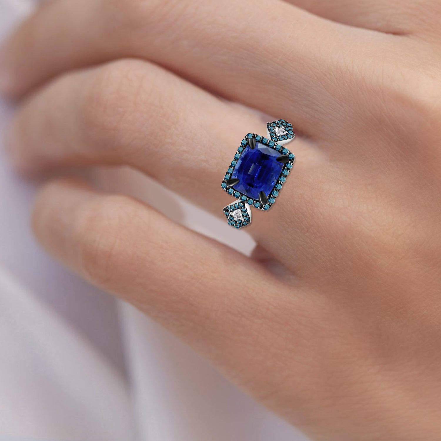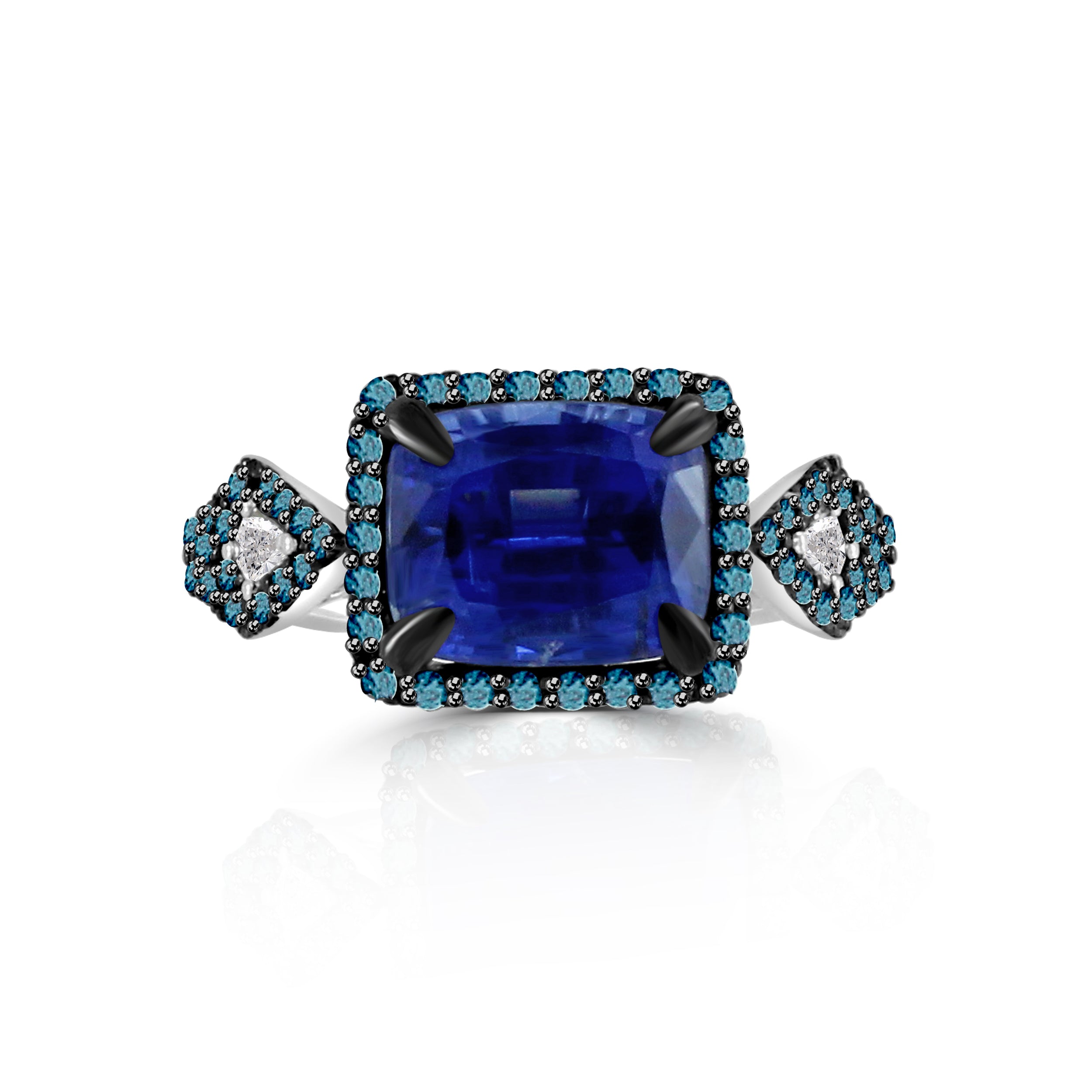 This KINITE ring is the perfect symbol of your commitment. Featuring a TRILLION diamond & a BLUE diamond in sleek 18k white gold, this NAVY ring will have them swooning like never before! Show them your love with this gorgeous piece. !!!