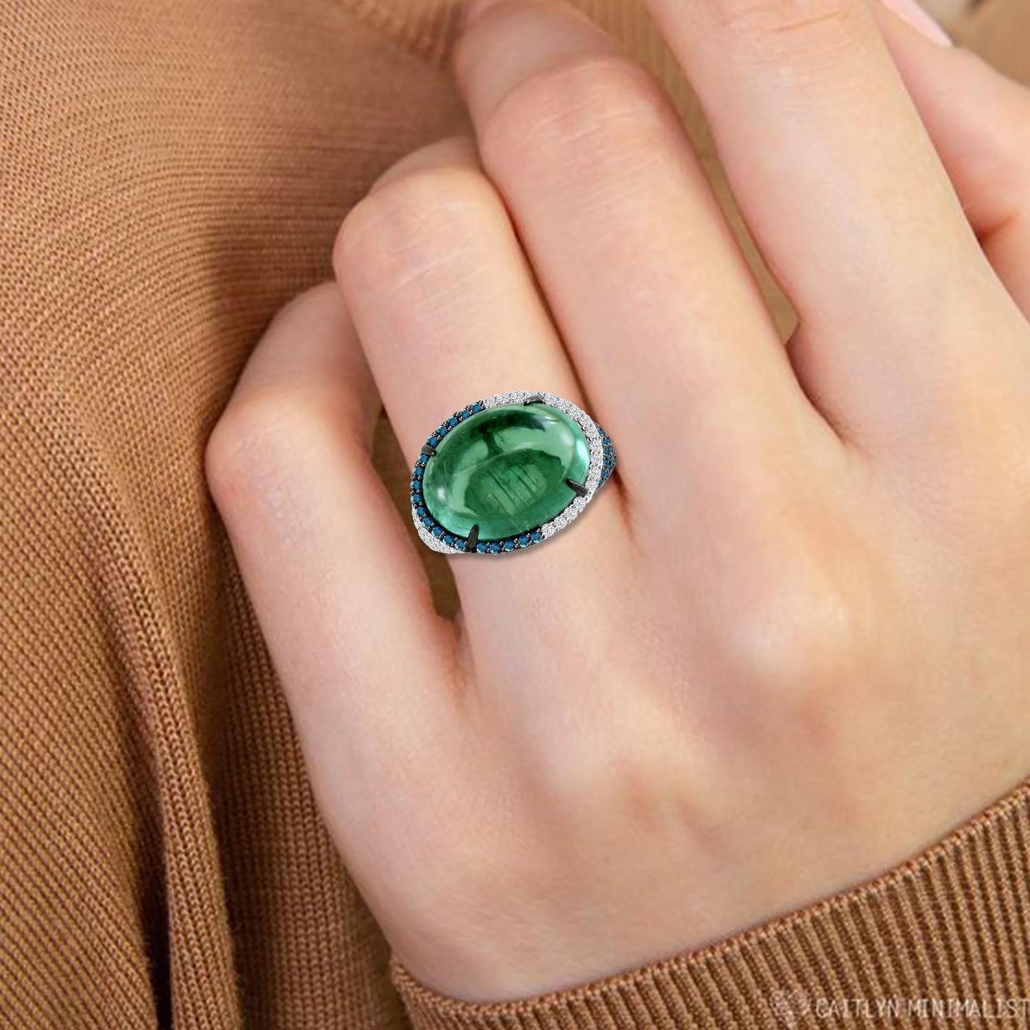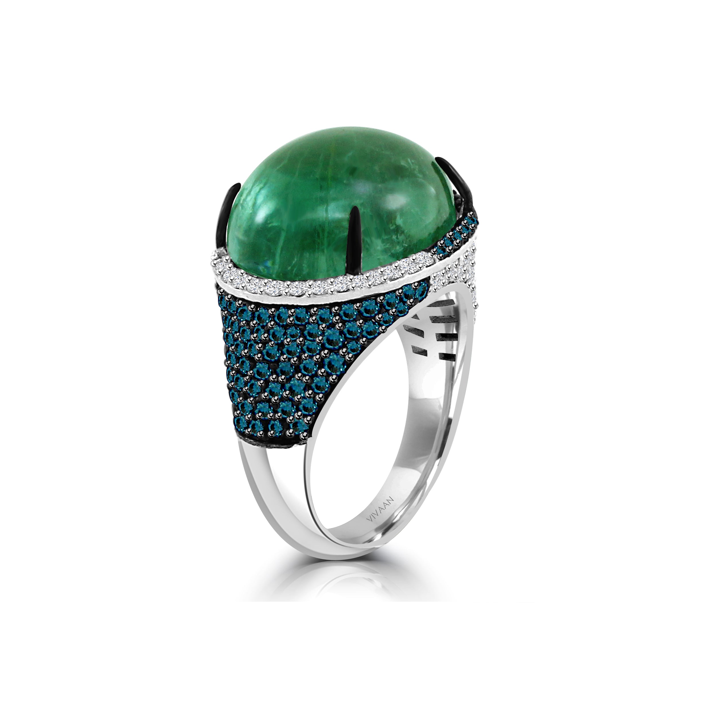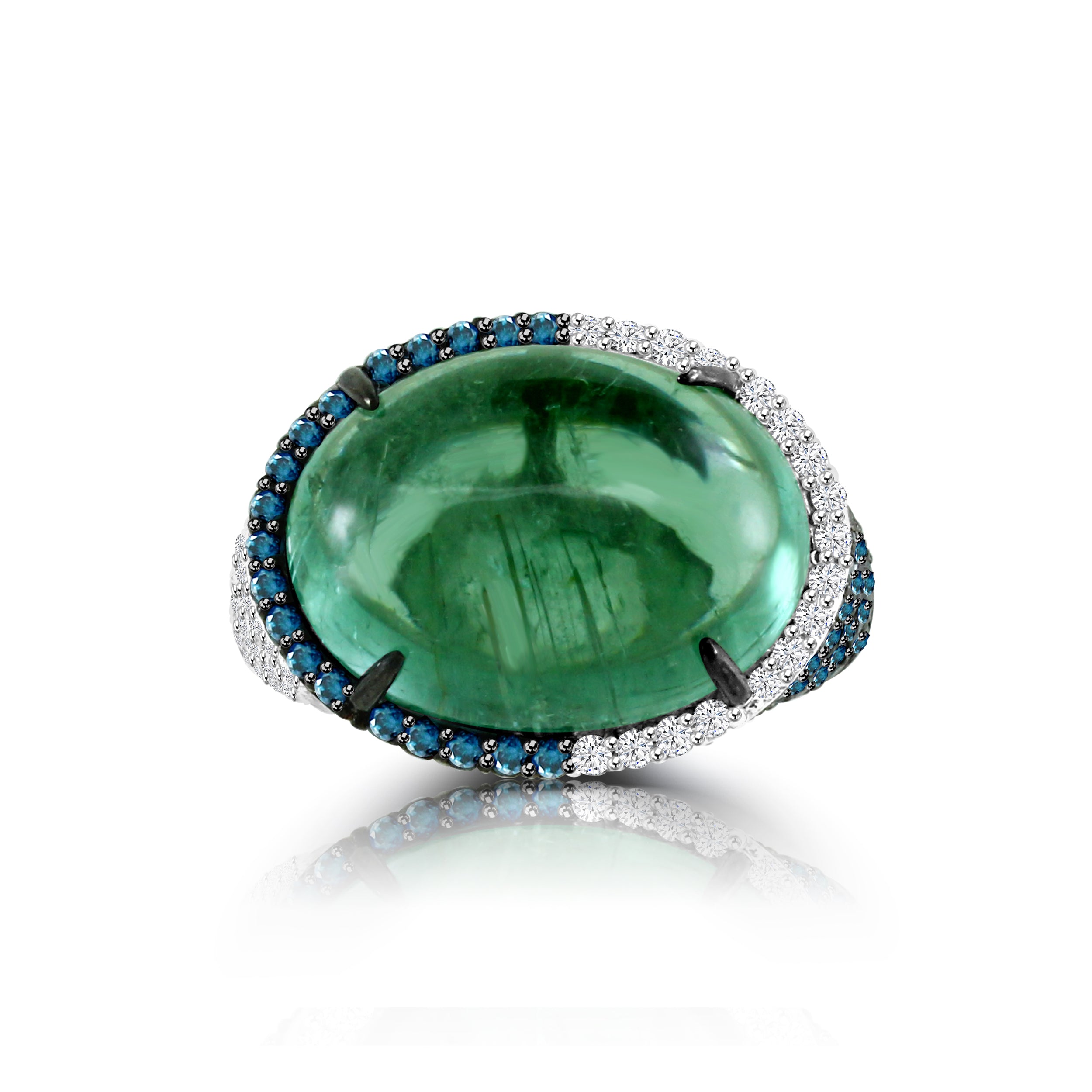 Be the highlight of the party with this Nugget! This 18K white gold ring features an indicolite cabochon tourmaline, complemented by treated blue diamonds and sparkling rose cut and brilliant diamonds. Stand out in style with this dazzling stunner!