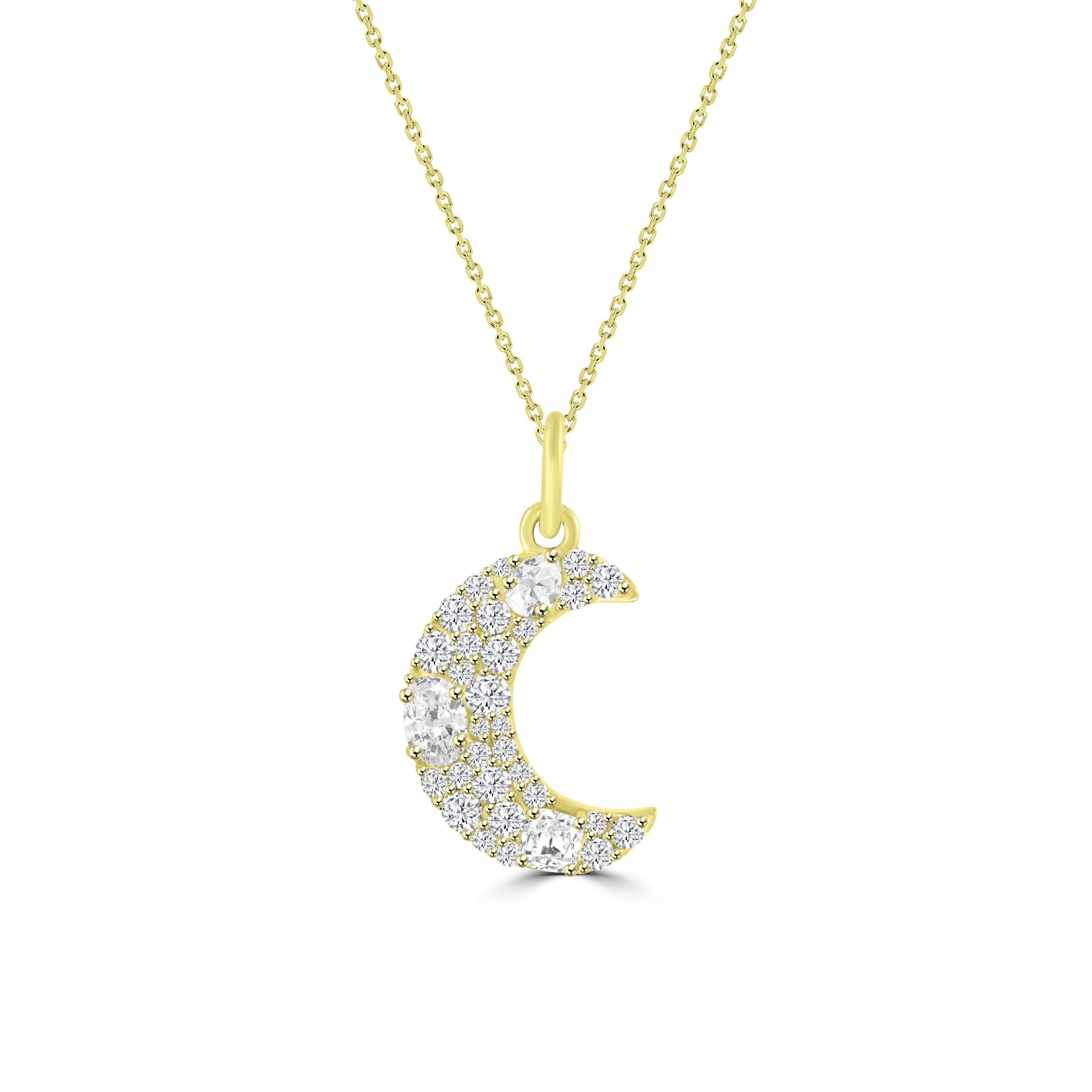 But the adventure doesn't end there. As you explore the Lunar Lullaby, a crescent moon pendant bathed in the golden glow of the celestial heavens, feel the magic of the night sky come alive. Each Old Mine and European Cut Diamond set within its embrace captures the essence of lunar radiance, casting a spell of enchantment upon all who behold it.