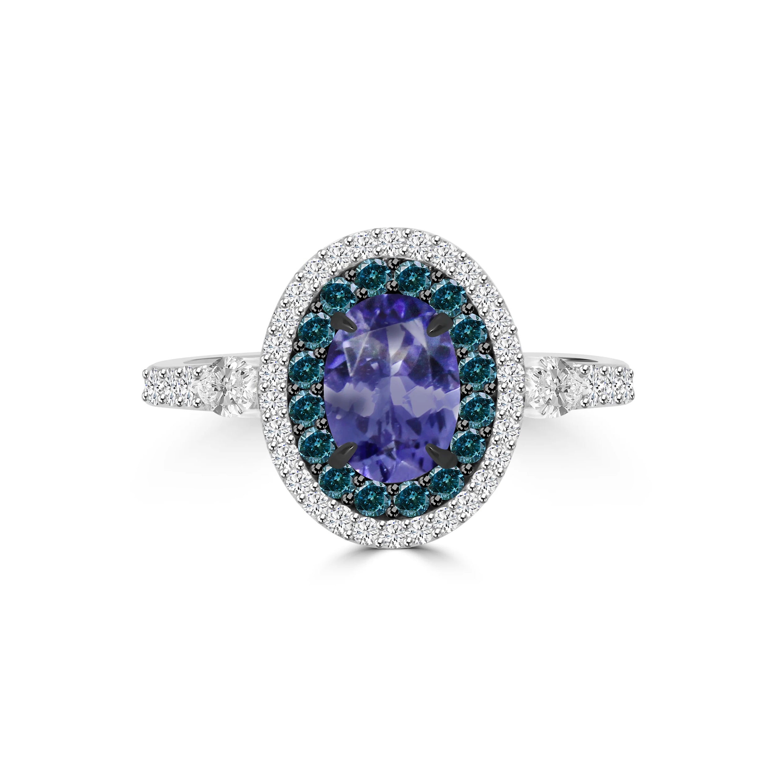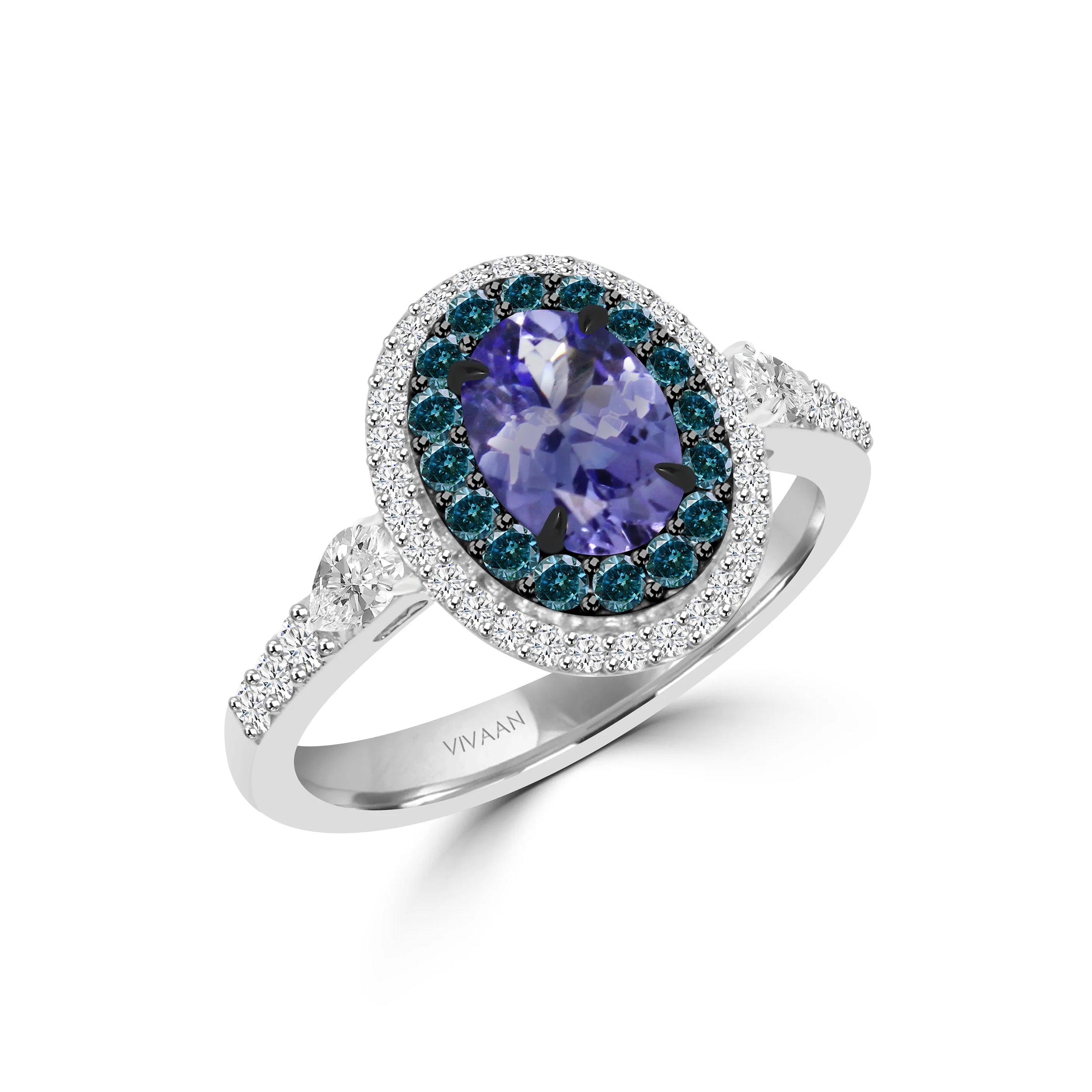 The *OLID* ring is a radiant testament to luxury and elegance. At its center, a stunning tanzanite shines with a deep, captivating violet-blue hue, exuding timeless beauty. Flanked by graceful pear-shaped diamonds on each side and encircled by a halo of blue and brilliant diamonds, this design creates a dazzling display of brilliance and color.