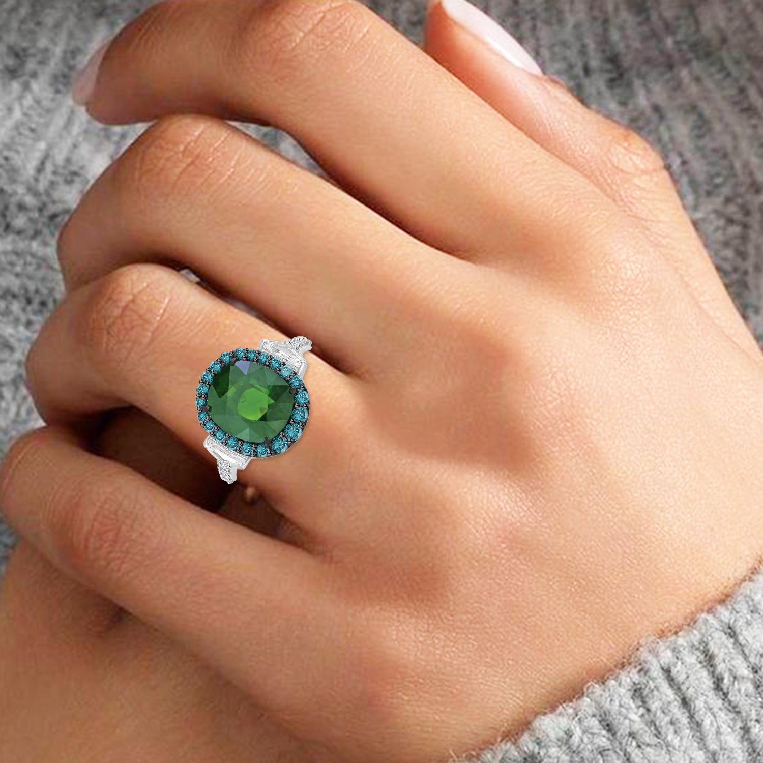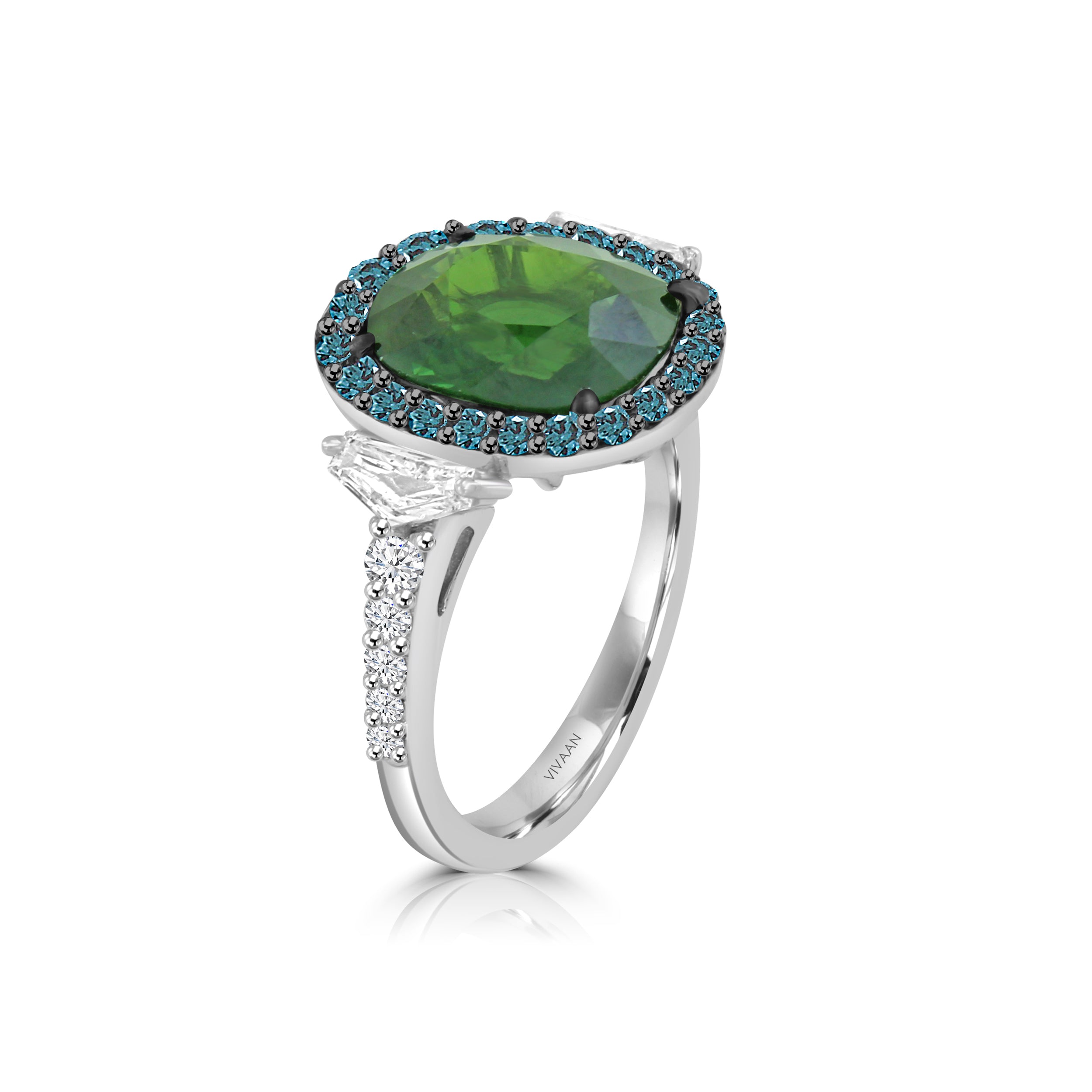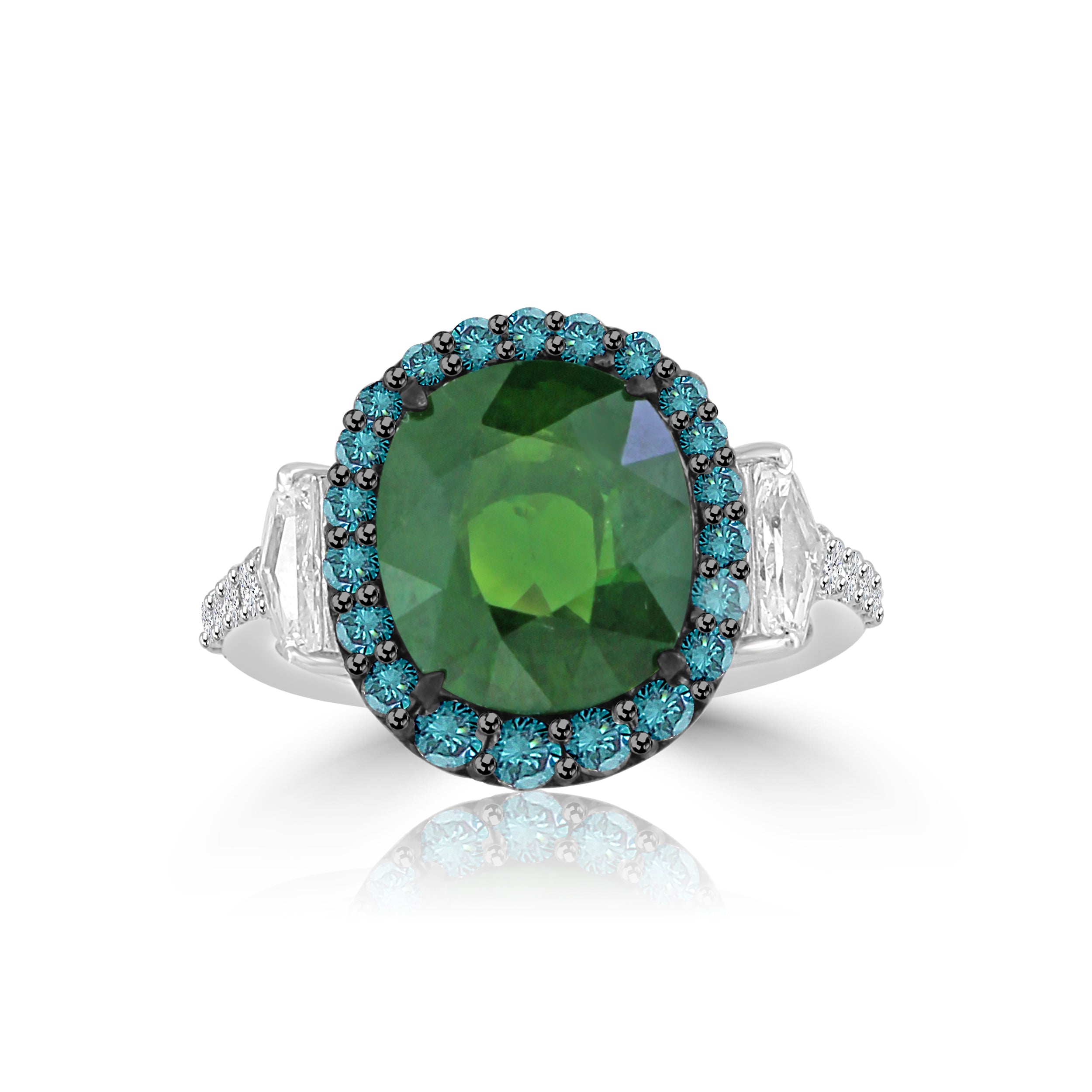 The unique miraculous color of green sapphire is perfectly complimented by blue diamonds surrounding it and accented by trillion cut diamonds and brilliant diamonds set in a ring of 18k white gold.