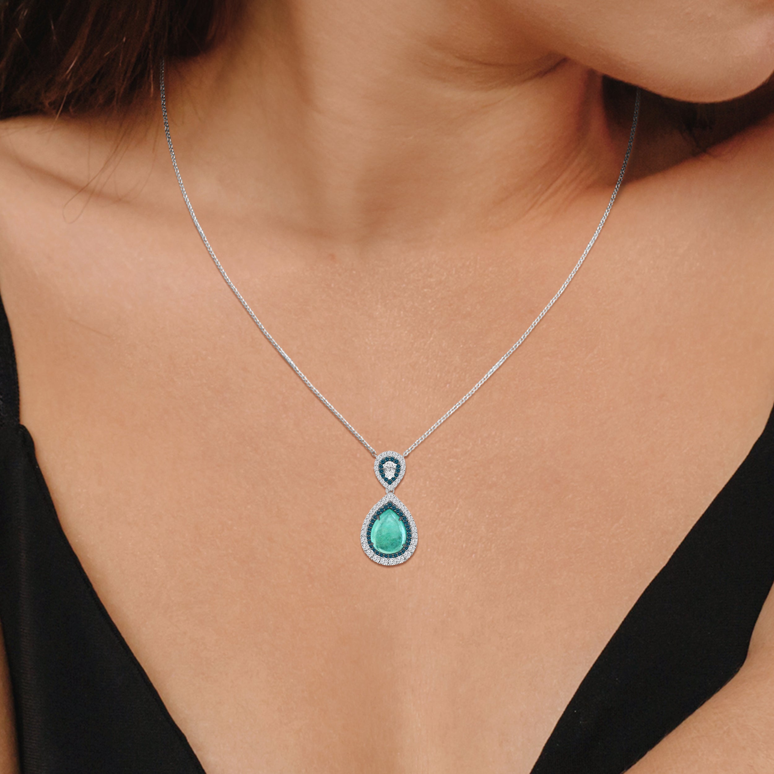 The Serenna Paraiba Tourmaline Necklace is a breathtaking expression of elegance and rarity. At its heart, a captivating Paraiba tourmaline cabochon glows with its signature luminous hue, evoking the serene beauty of tropical waters. Suspended gracefully from a pear-shaped diamond, it is framed by a dazzling halo of blue and brilliant diamonds, creating a harmonious symphony of sparkle and color.