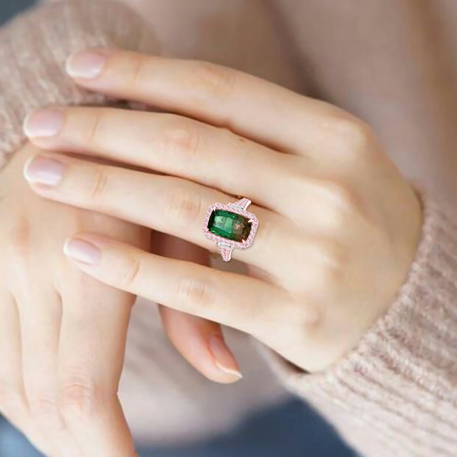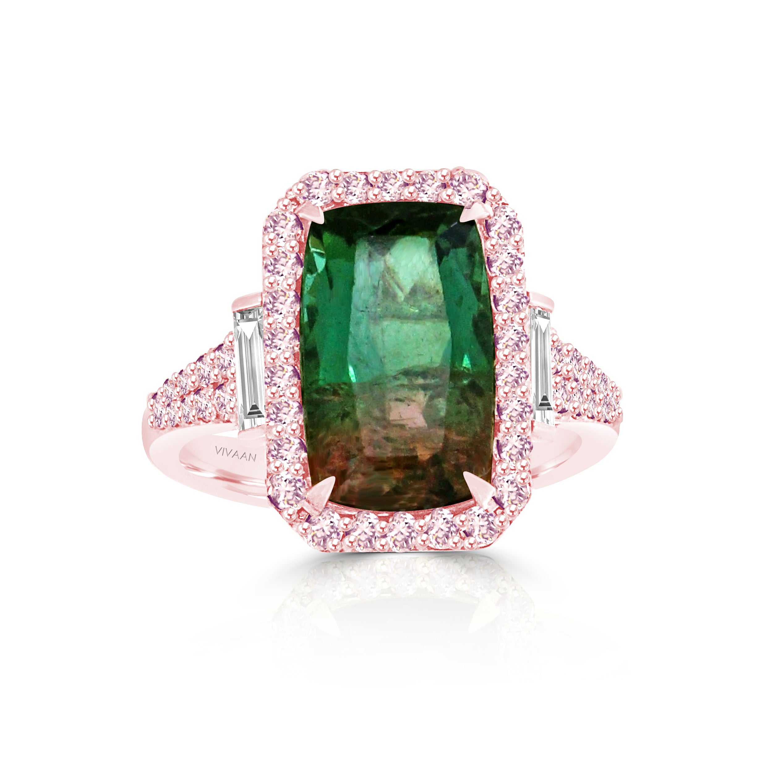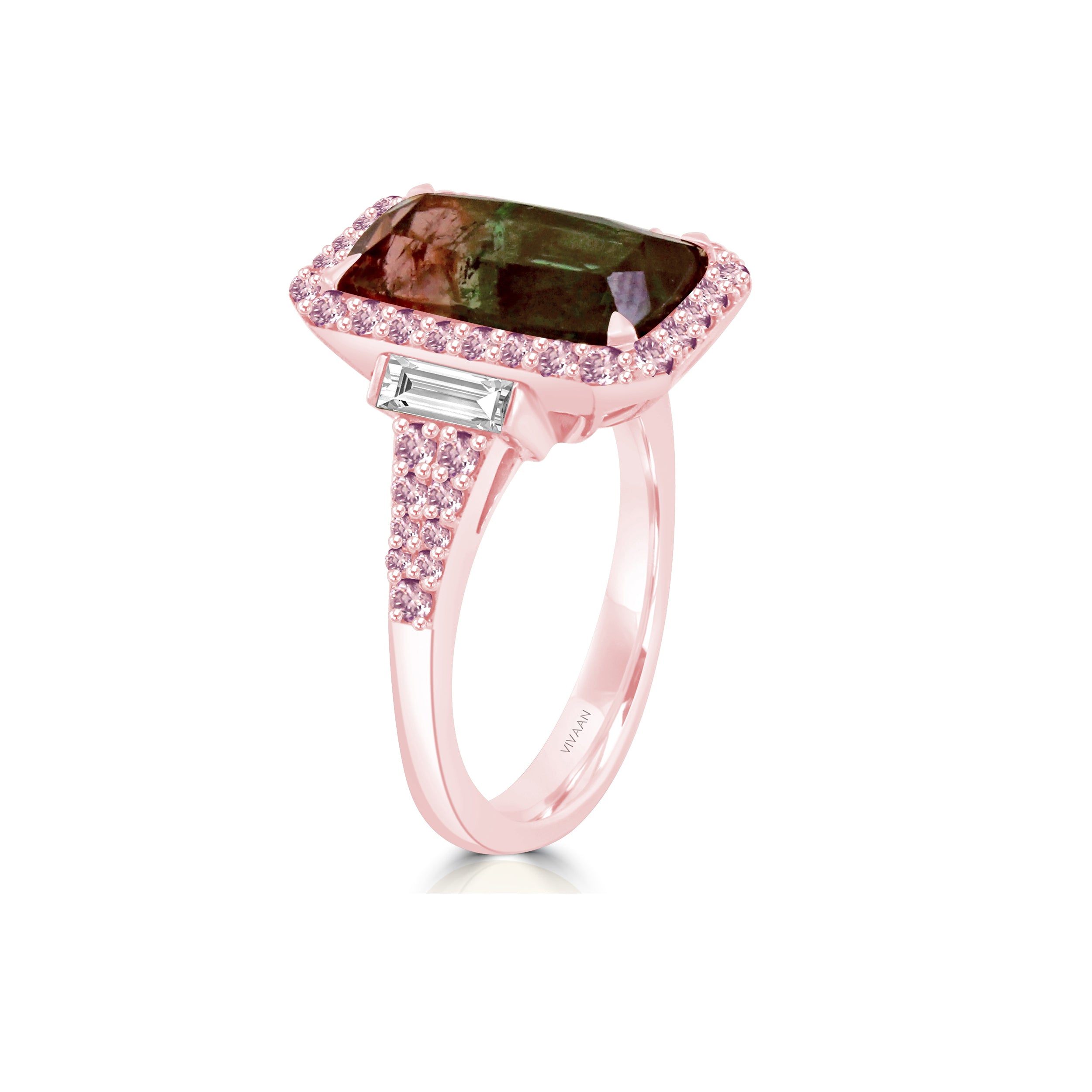 Feel the 'PETRICHOR' of jewels with this Tourmaline ring! Sparkling baguette diamonds and colorful pink diamonds in 18K rose gold come together to bring you the sweetest bling. Be sure to take a bite! ;)