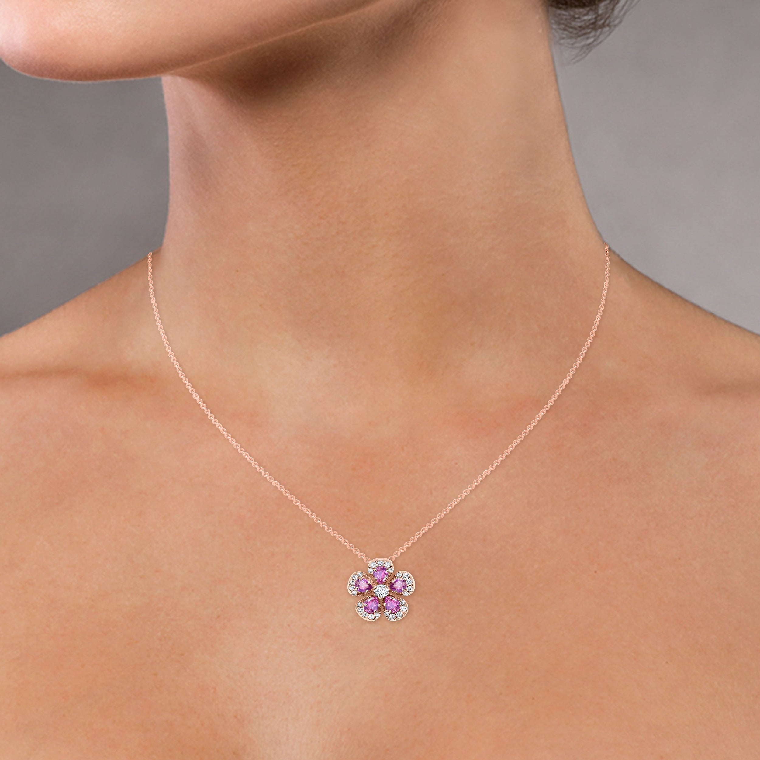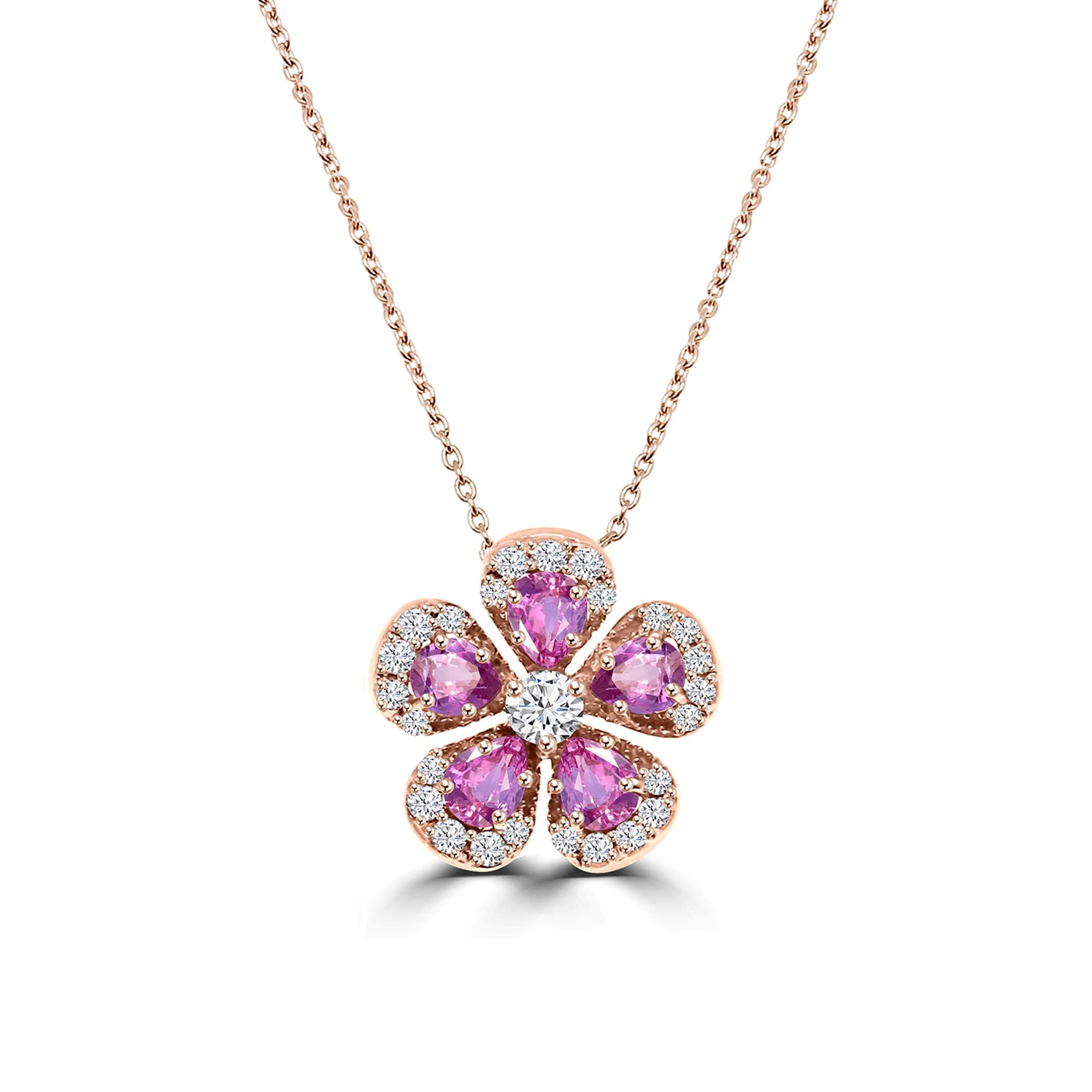 Inspired by the beauty of blooming flowers, this exquisite CHAMOMILE necklace showcases a graceful floral pendant set in warm rose gold. Five vibrant pink gemstones, shaped like delicate petals, are accentuated by a dazzling halo of diamonds. A single diamond at the center completes the enchanting design. The fine chain enhances the pendant’s charm, making it an ideal accessory for any occasion. Perfect as a romantic gift or a treasured keepsake, this necklace adds a touch of elegance and grace, capturing the essence of femininity in every sparkle.