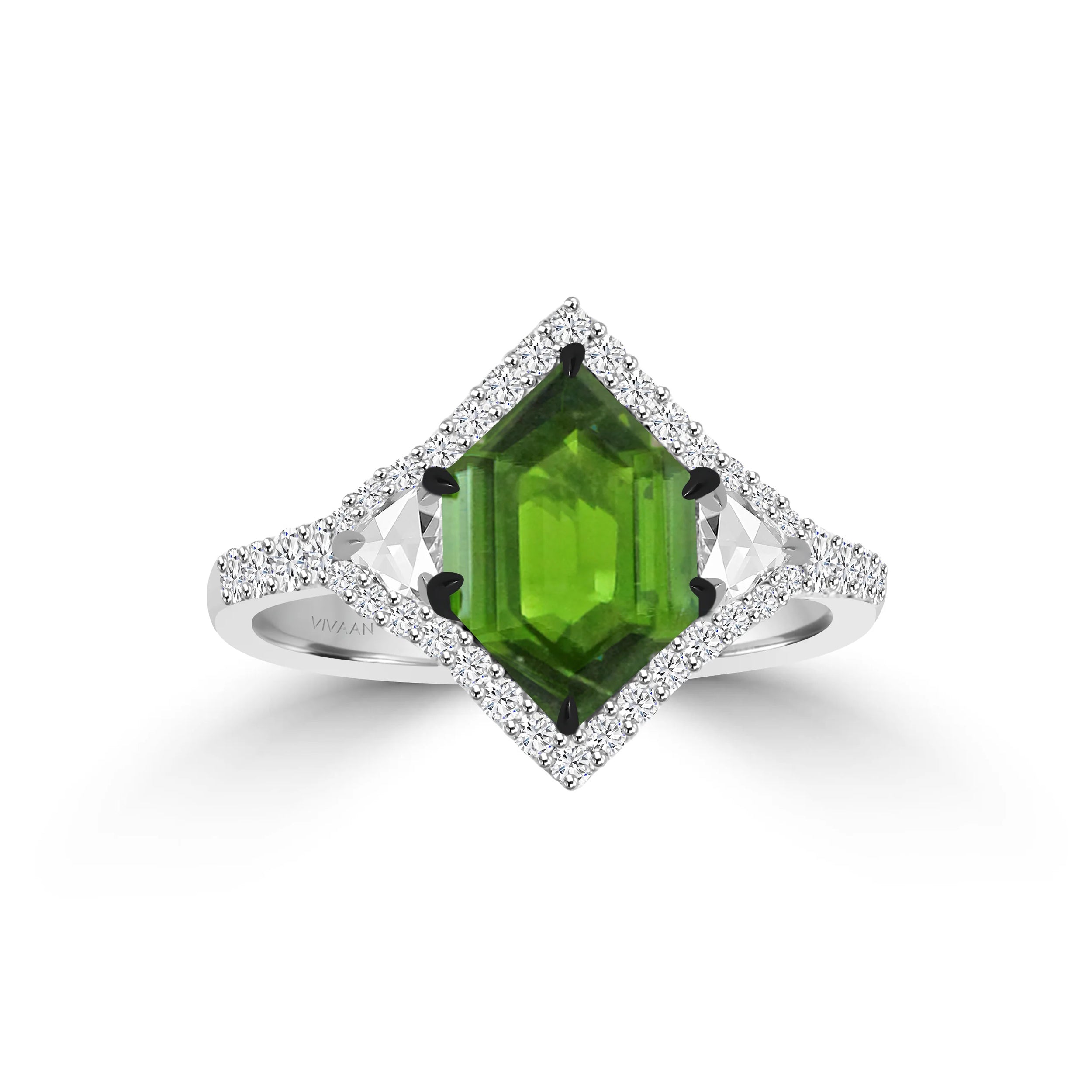 The "QUIXOTICA" ring is a bold and mesmerizing statement of artistry and elegance. At its heart lies a captivating indicolite tourmaline, showcasing deep, alluring shades of teal. Flanked by two rose-cut diamonds that exude vintage charm, the design is further enhanced by a sparkling array of brilliant-cut diamonds, creating a symphony of radiance and refinement.