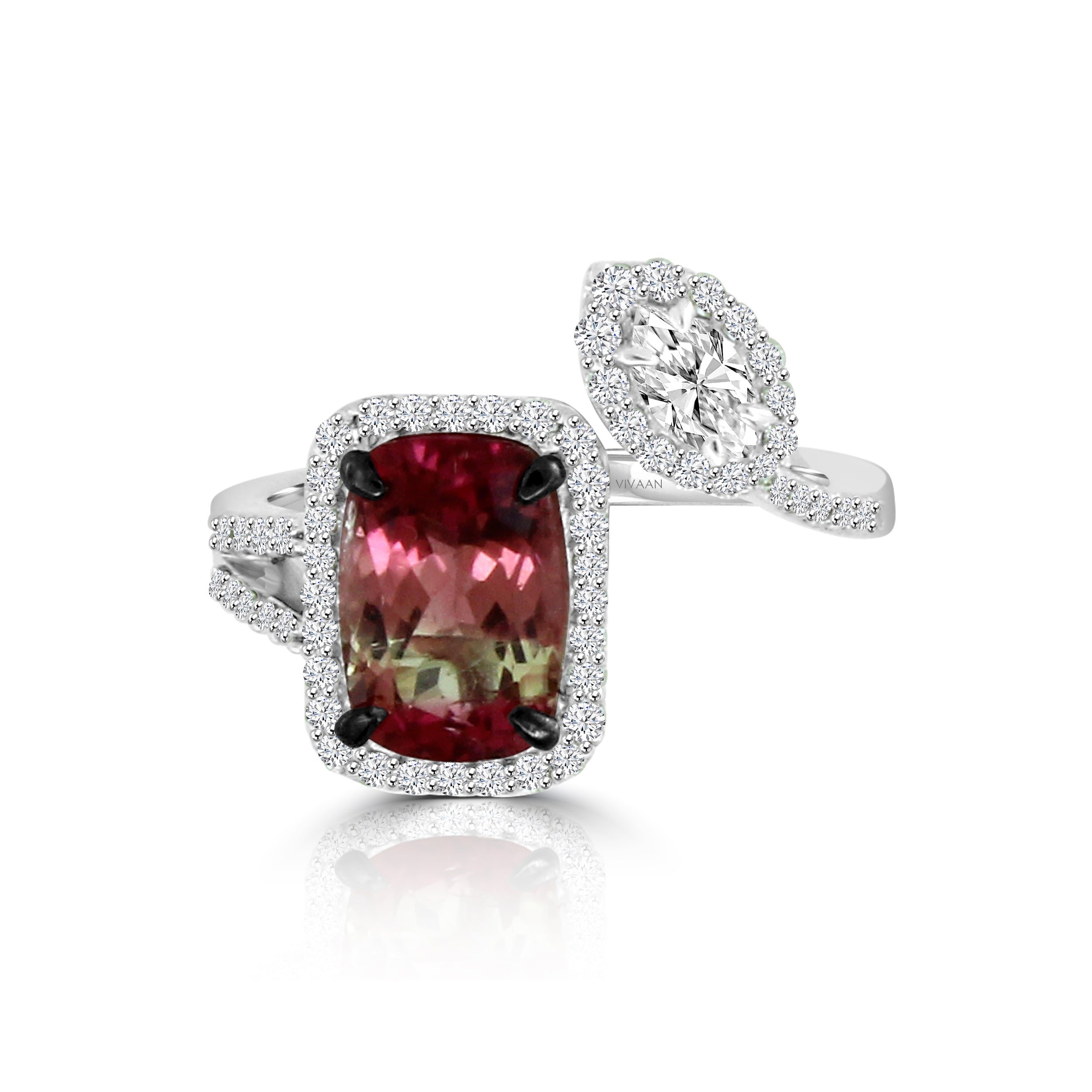 Stand out in style with this eye-catching RAH ring! Crafted from 18K white gold, it features a lustrous tourmaline centerpiece surrounded by marquise and brilliant diamonds. Shine day or night in this one-of-a-kind piece!