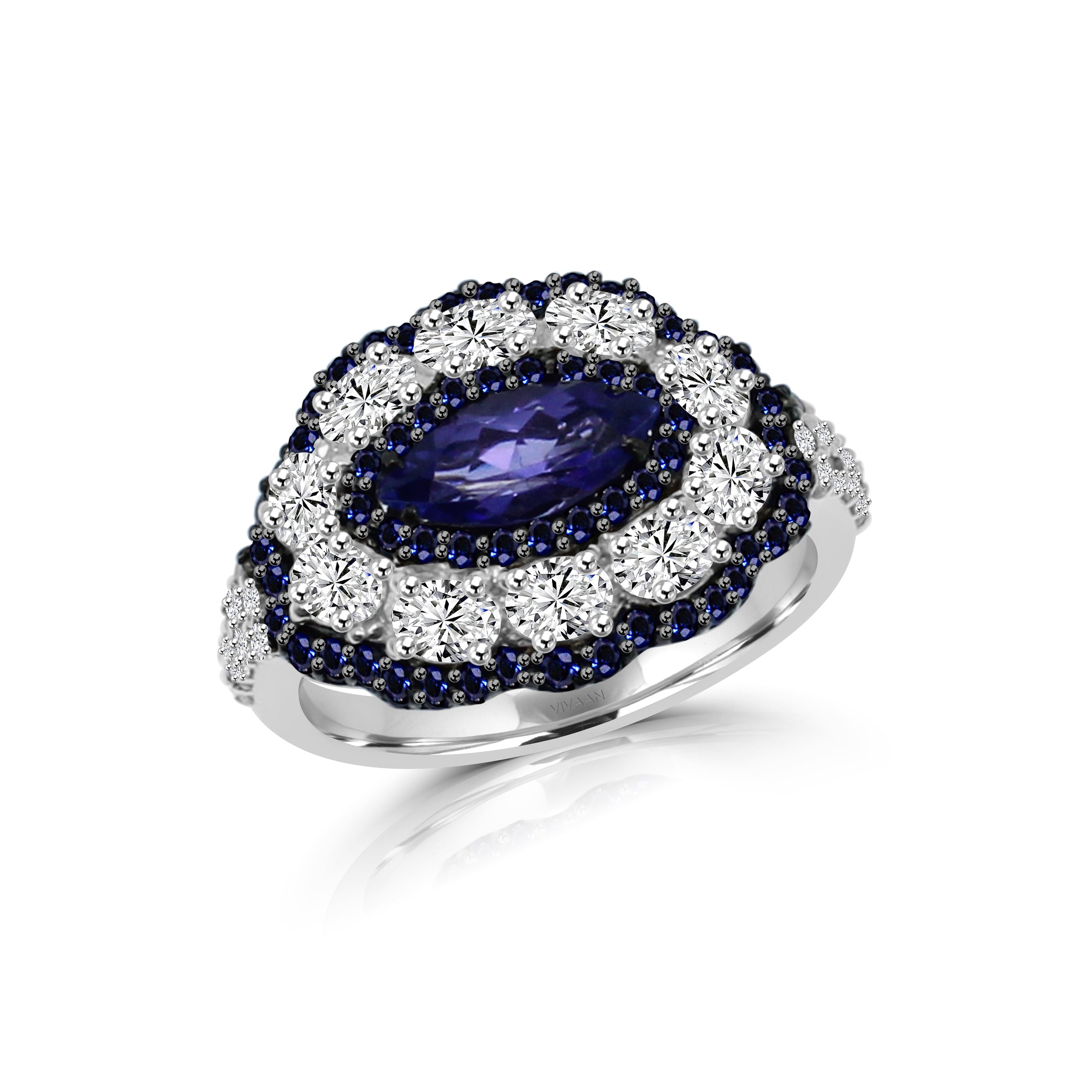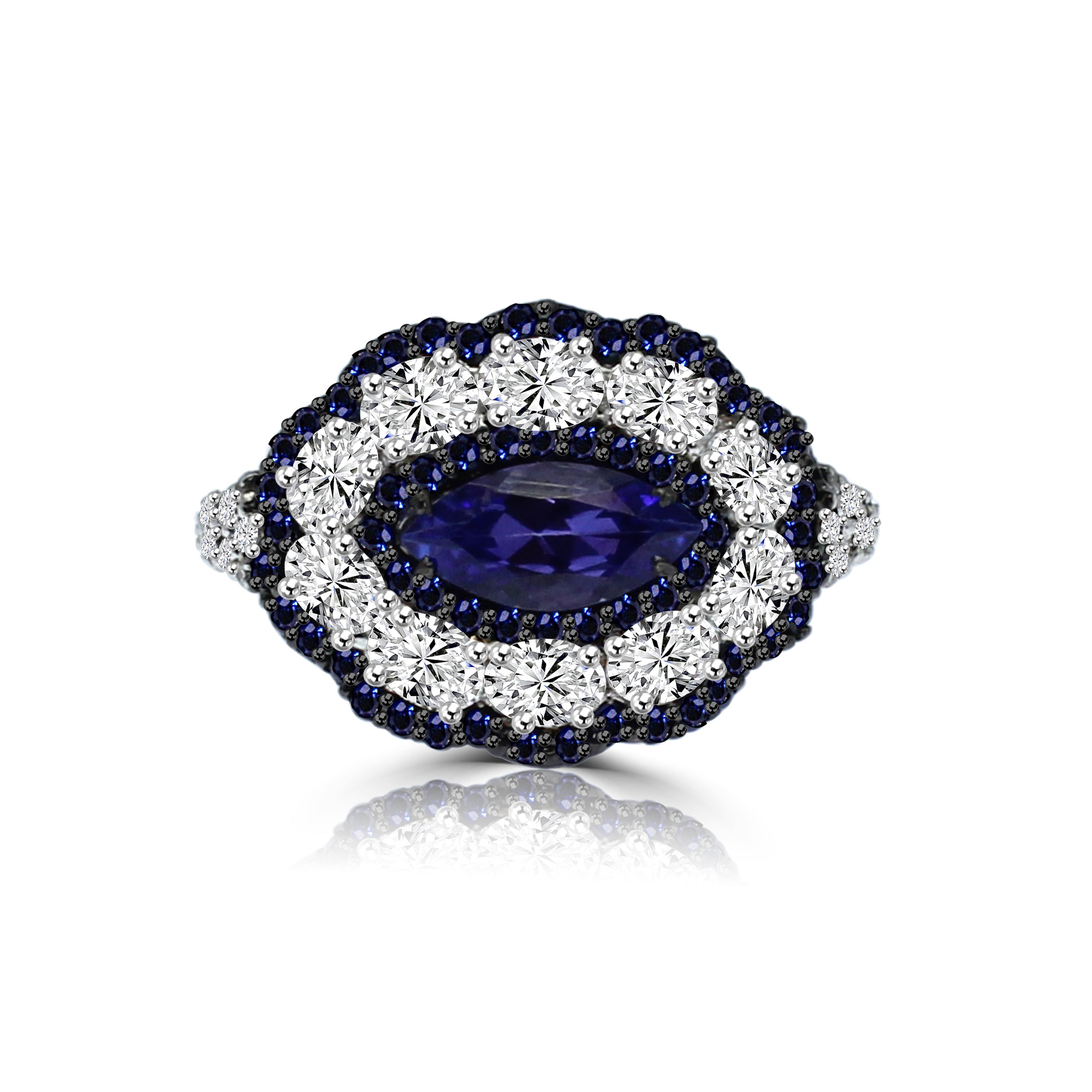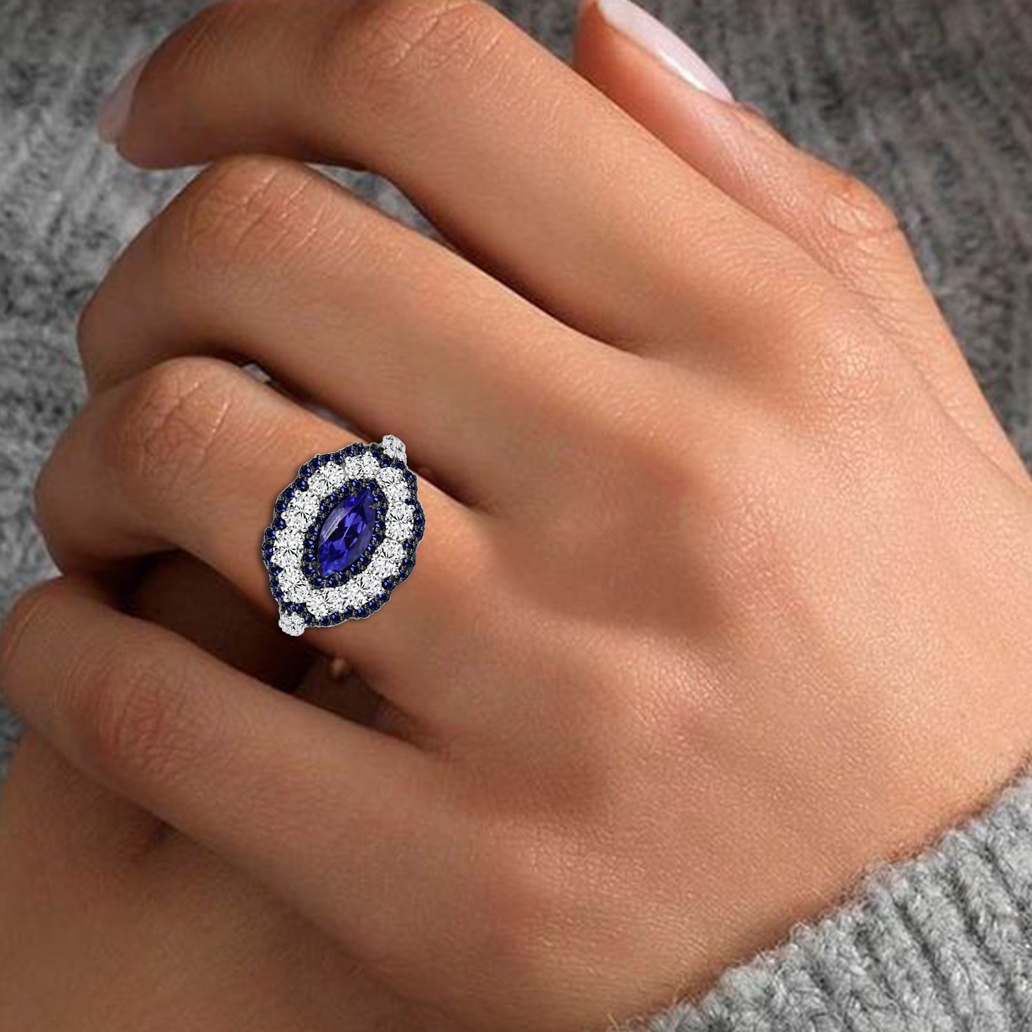 The magical marquise shape tanzanite surrounded with sapphire and brilliant diamonds scalloped on a ring in 18k gold.