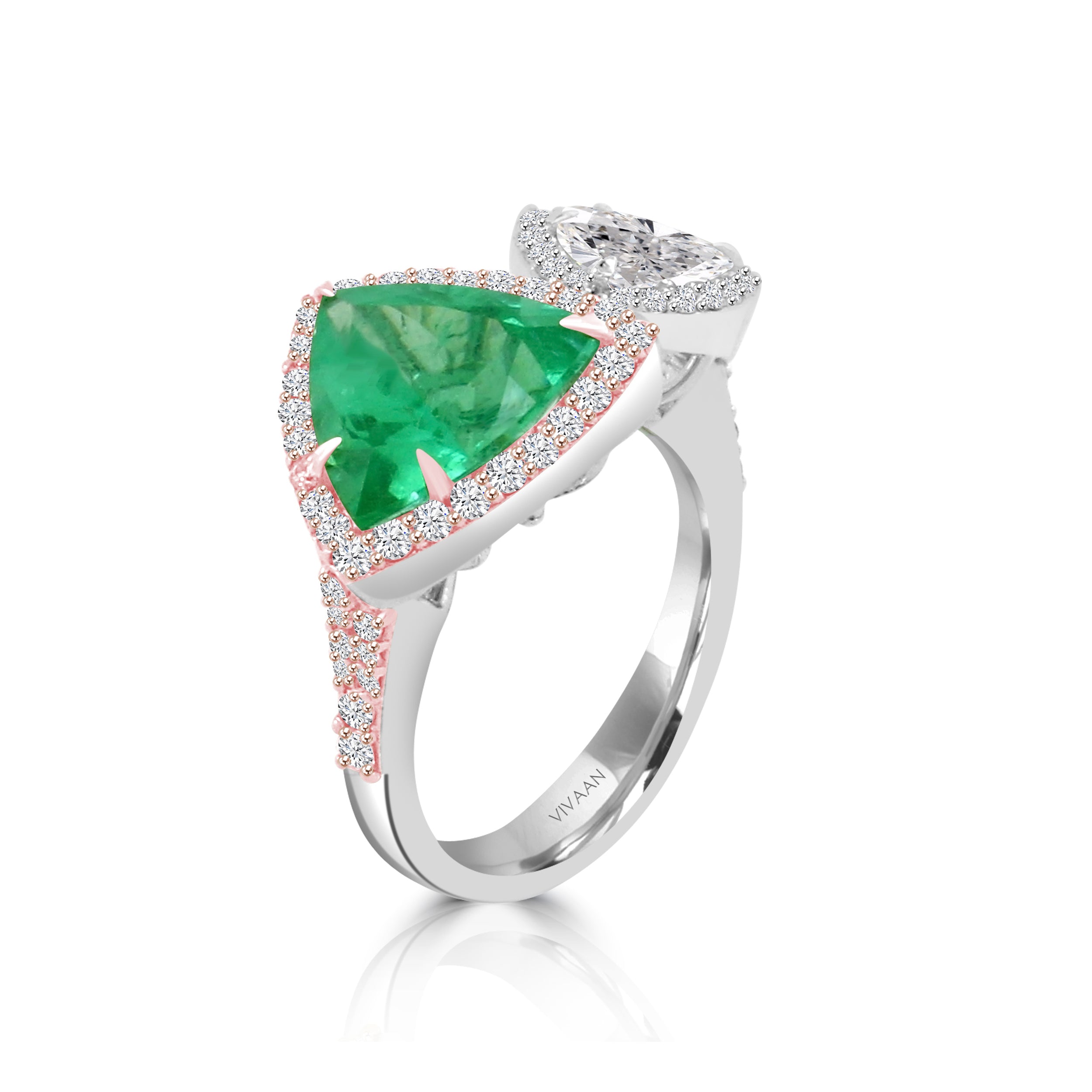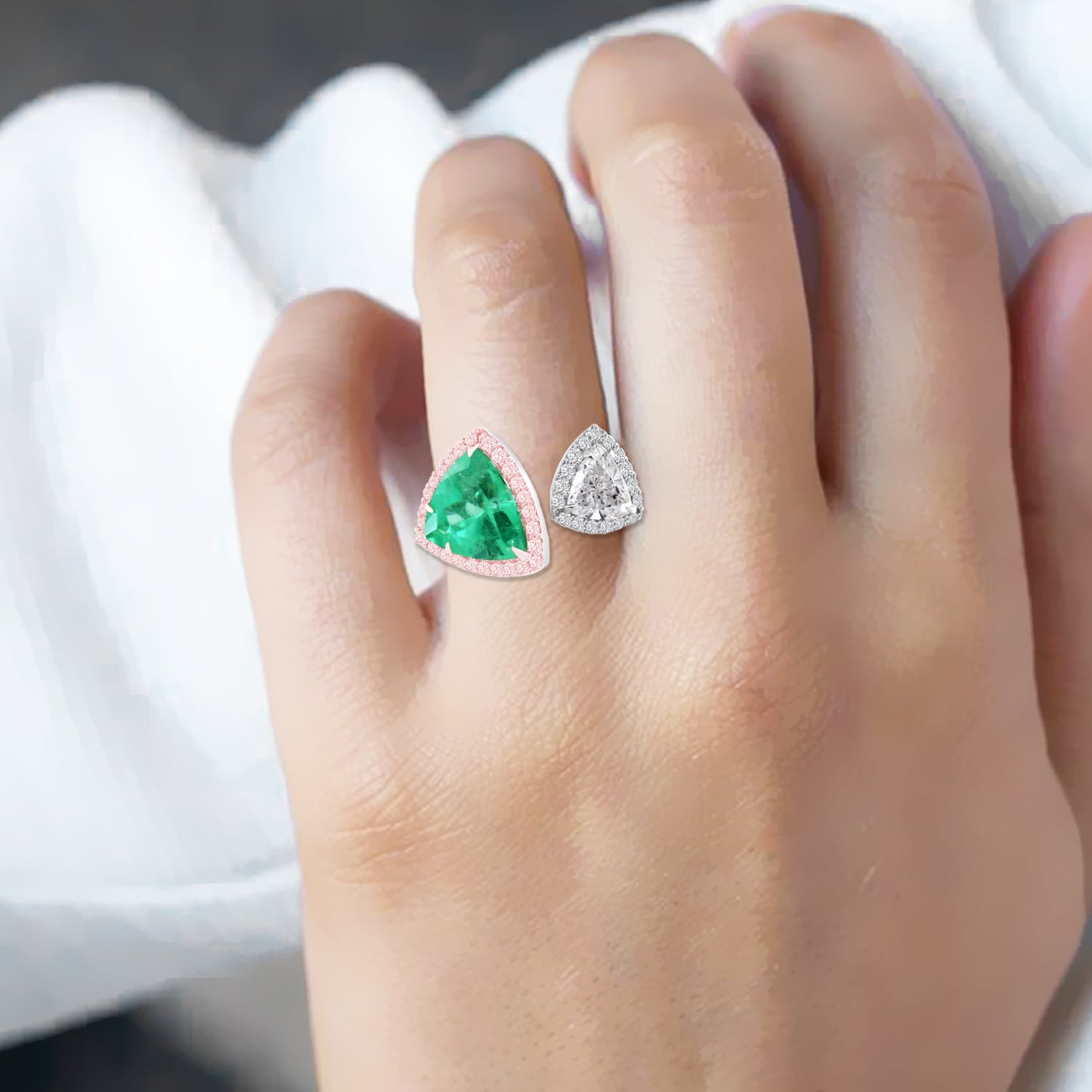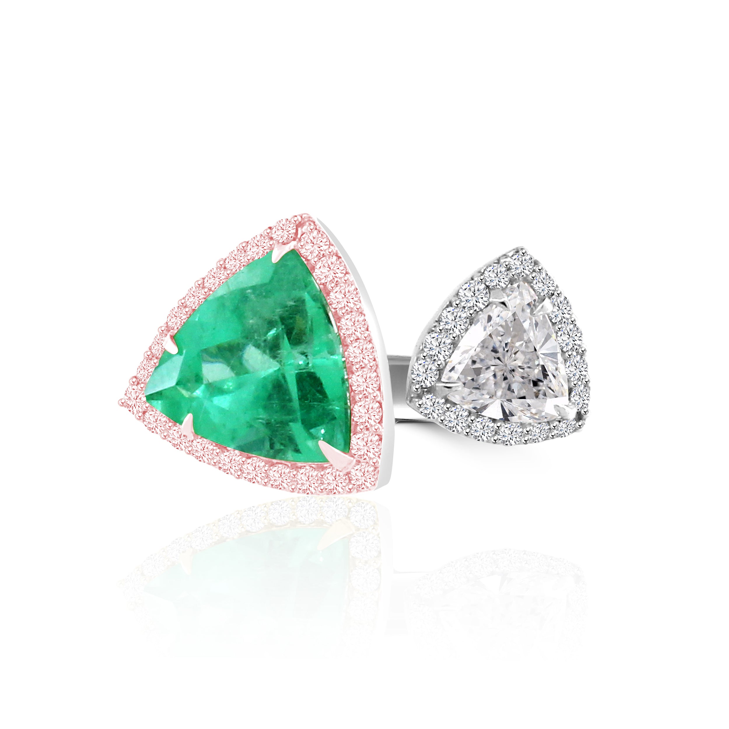 Our Rhine ring offers a stunning centerpiece featuring an emerald stone surrounded by a trillion, brilliant, and pink diamond in 18K white gold. This beautiful combination of stones is perfect for creating a statement look.